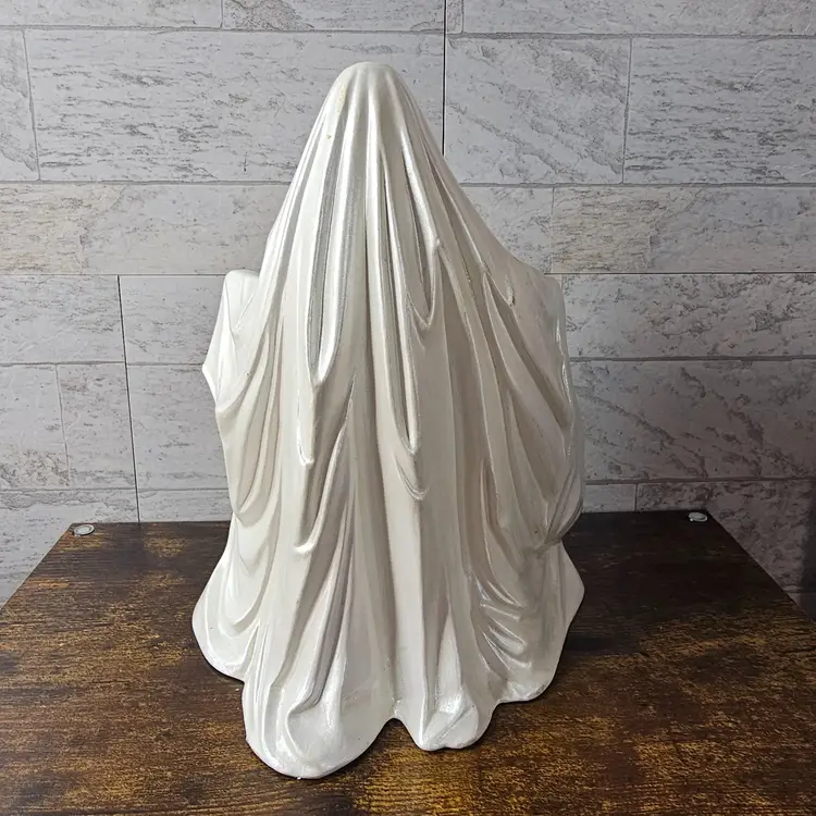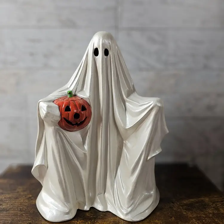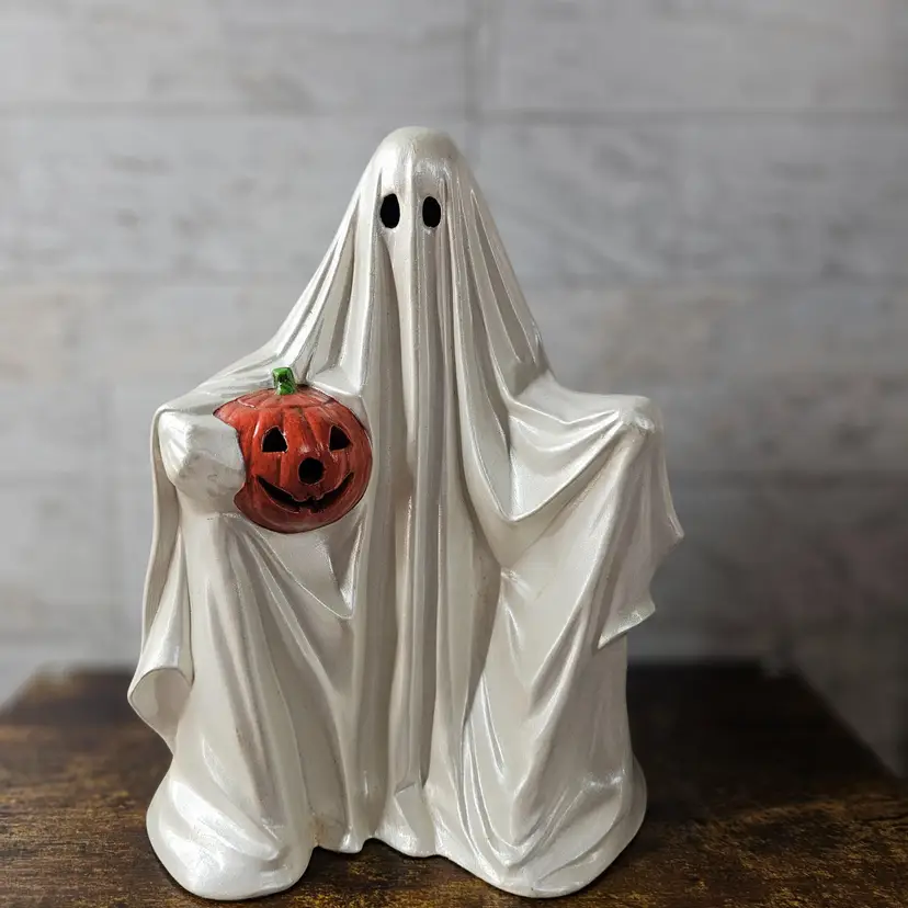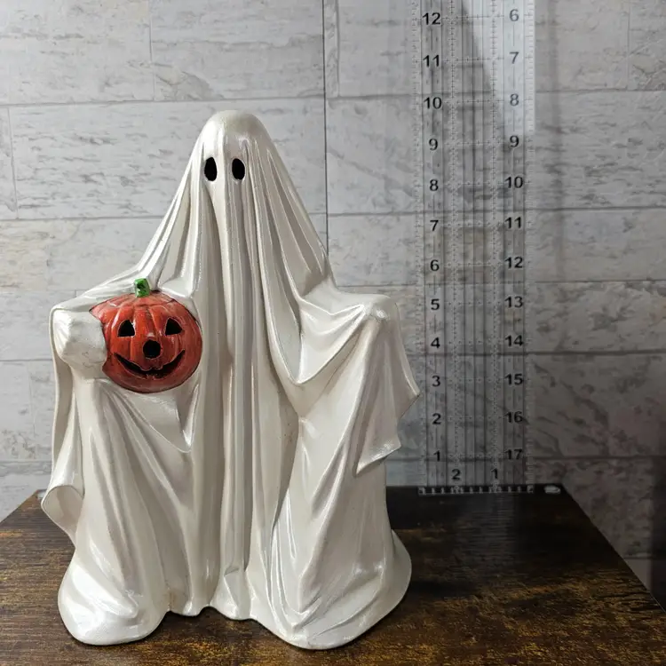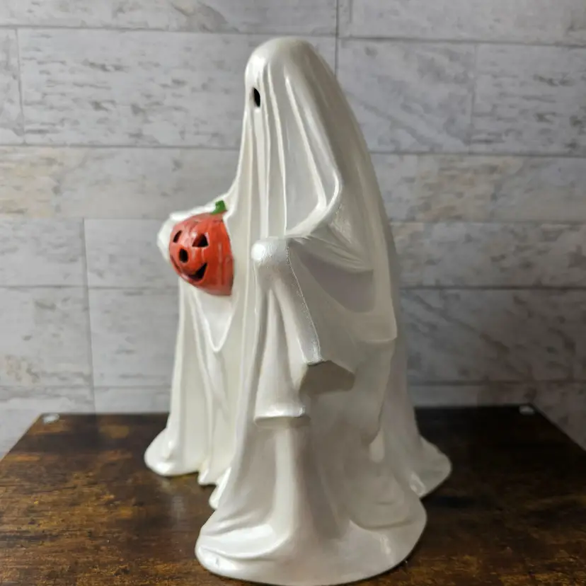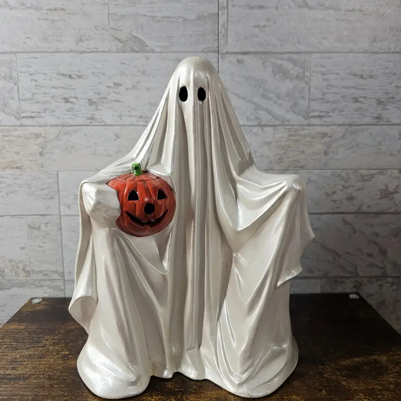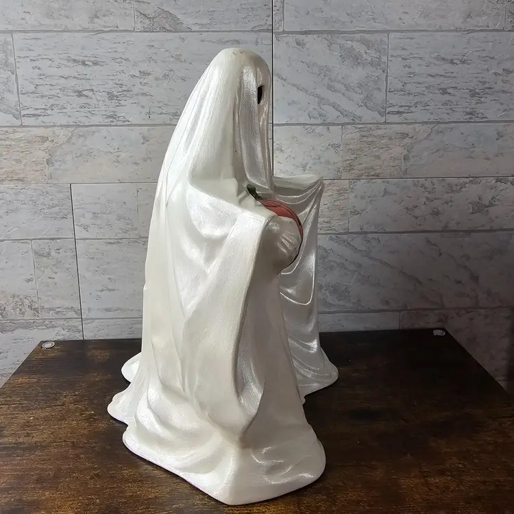 DOES NOT COME WITH LIGHT KIT. Spooky and charming ghost holding a jack-o'-lantern. Perfect for adding a vintage touch to your Halloween decor. No visible flaws.