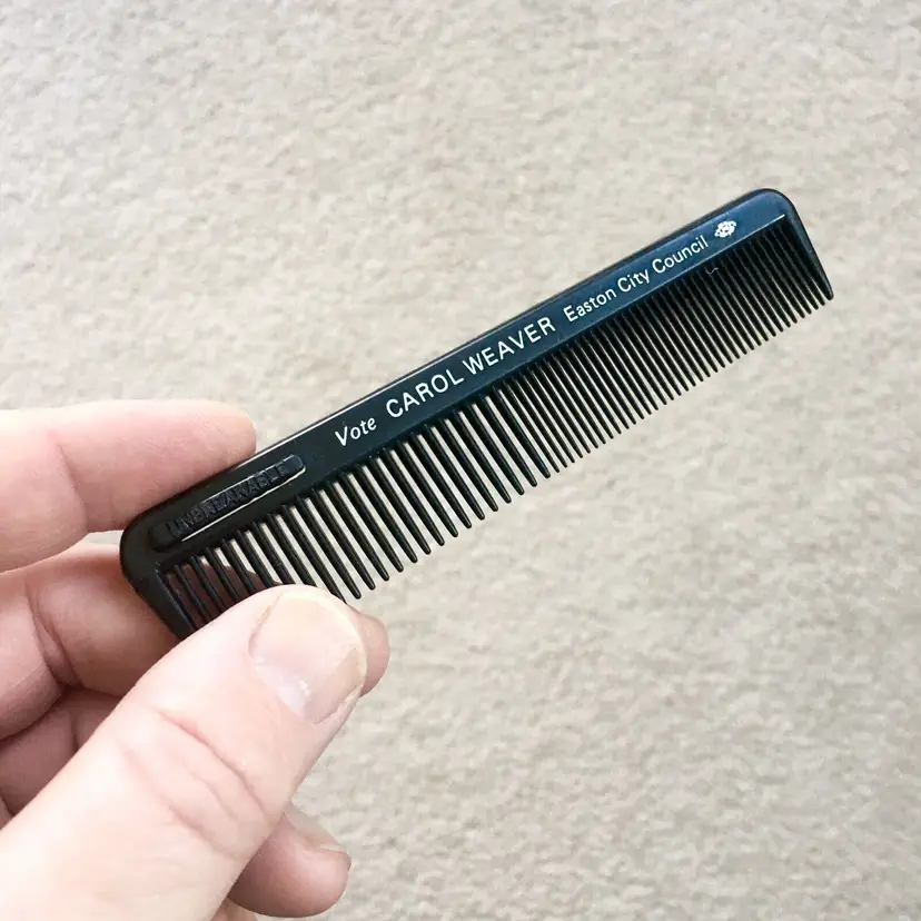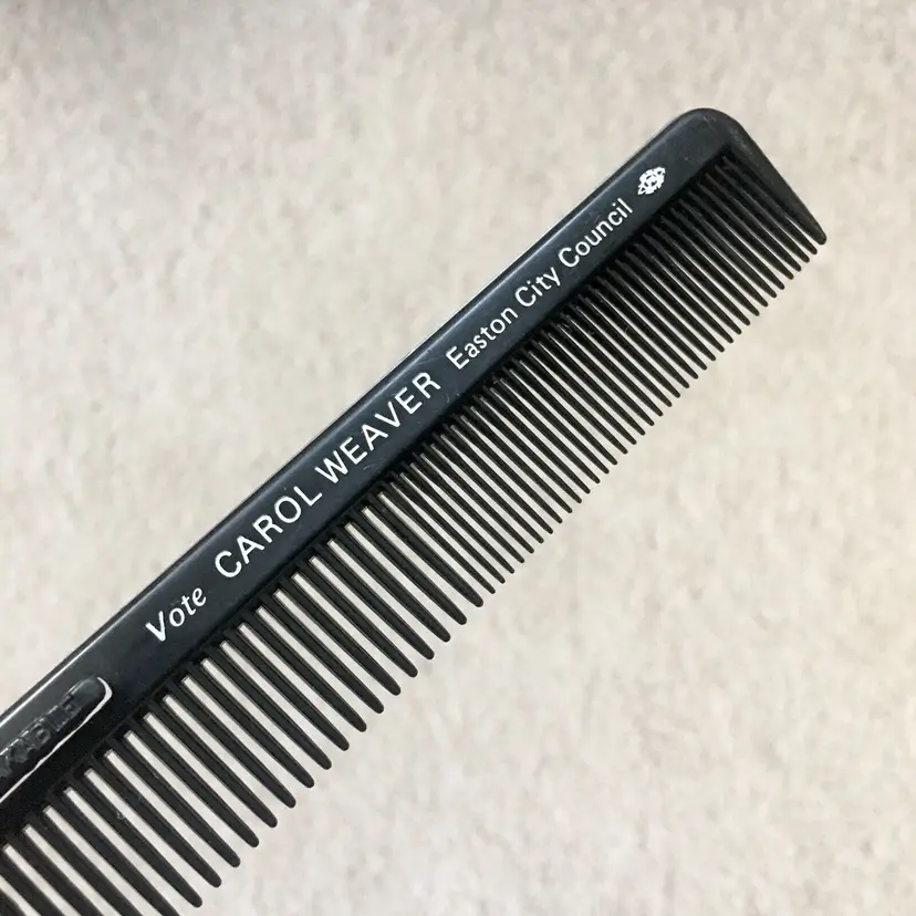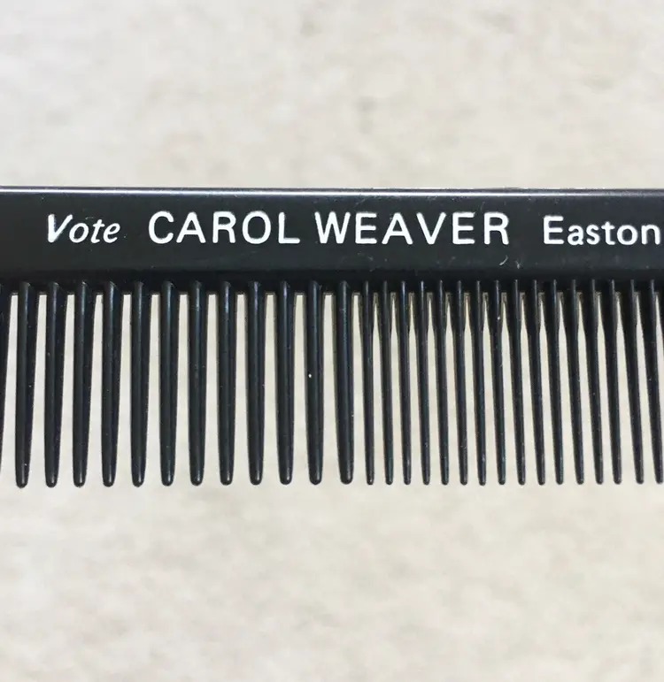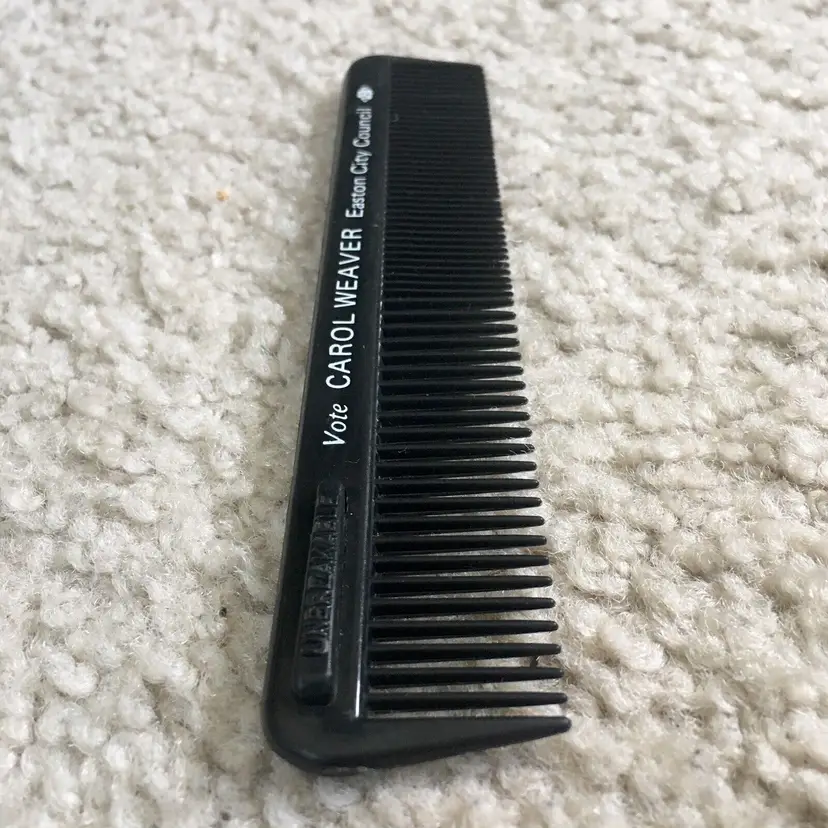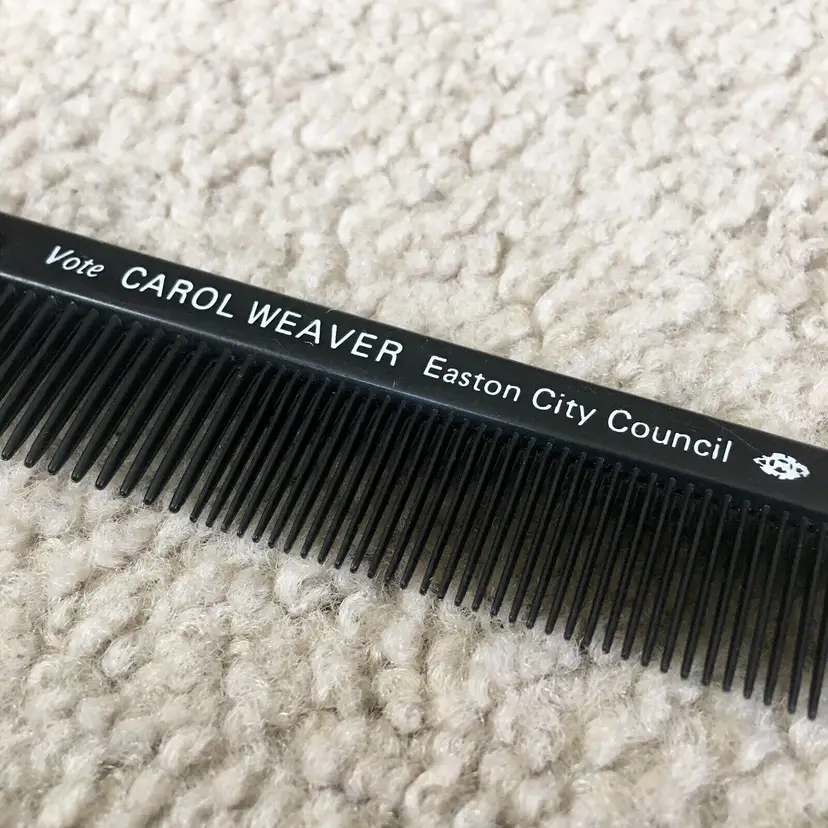 Interesting piece of Easton, Pennsylvania political history. Vintage 1980s black comb with... “Vote CAROL WEAVER Easton City Council” printed on one side. Carol Weaver was a Democrat elected to the City Council of Easton, Pennsylvania in 1989 and served one term. She switched to Republican in 1991 to enter the mayoral primary against former Councilman Thomas F. Goldsmith, who went on to defeat incumbent... and Easton’s current mayor... Democratic Mayor Sal Panto Jr.. Comb is in excellent condition with no broken teeth. Pocket clip says UNBREAKABLE. Measures about 6” long. See pics for more details.