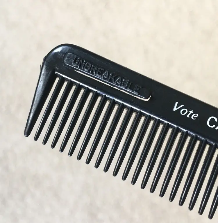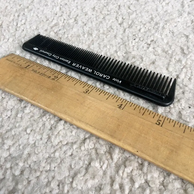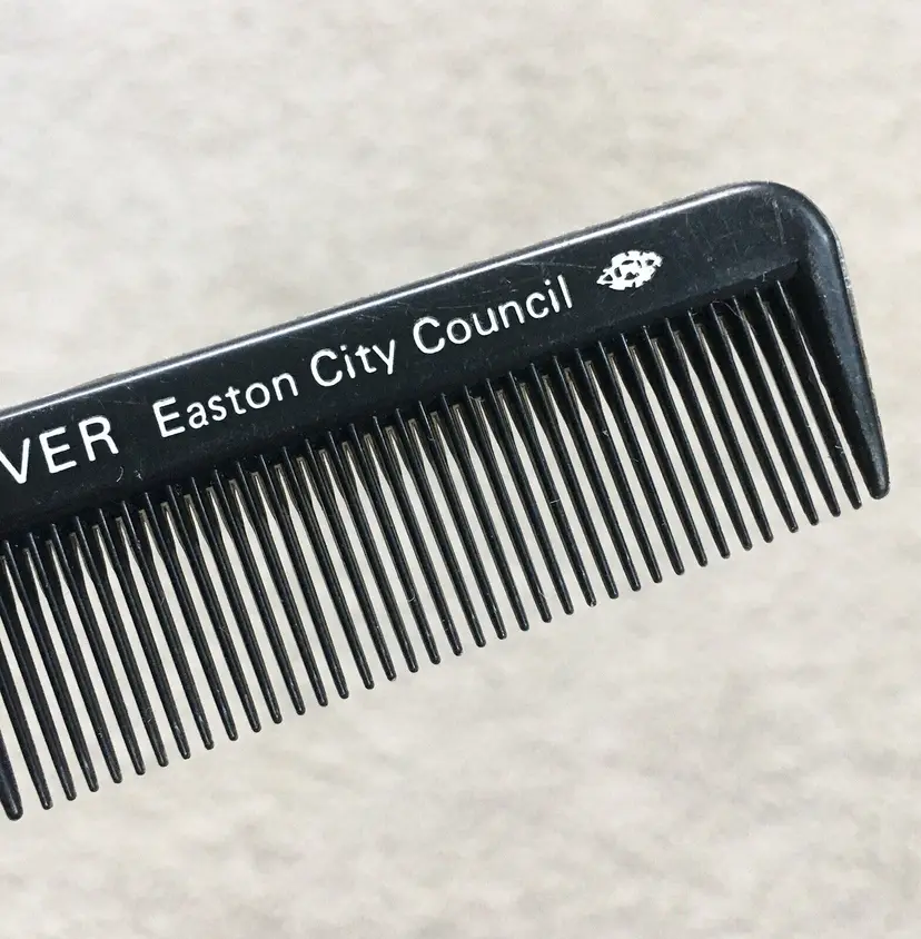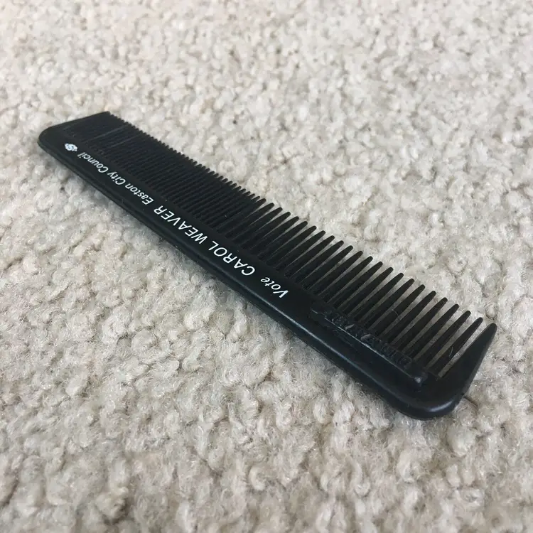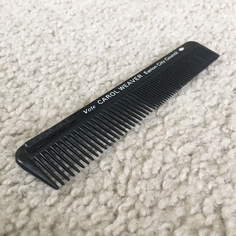 Interesting piece of Easton, Pennsylvania political history. Vintage 1980s black comb with... “Vote CAROL WEAVER Easton City Council” printed on one side. Carol Weaver was a Democrat elected to the City Council of Easton, Pennsylvania in 1989 and served one term. She switched to Republican in 1991 to enter the mayoral primary against former Councilman Thomas F. Goldsmith, who went on to defeat incumbent... and Easton’s current mayor... Democratic Mayor Sal Panto Jr.. Comb is in excellent condition with no broken teeth. Pocket clip says UNBREAKABLE. Measures about 6” long. See pics for more details.
