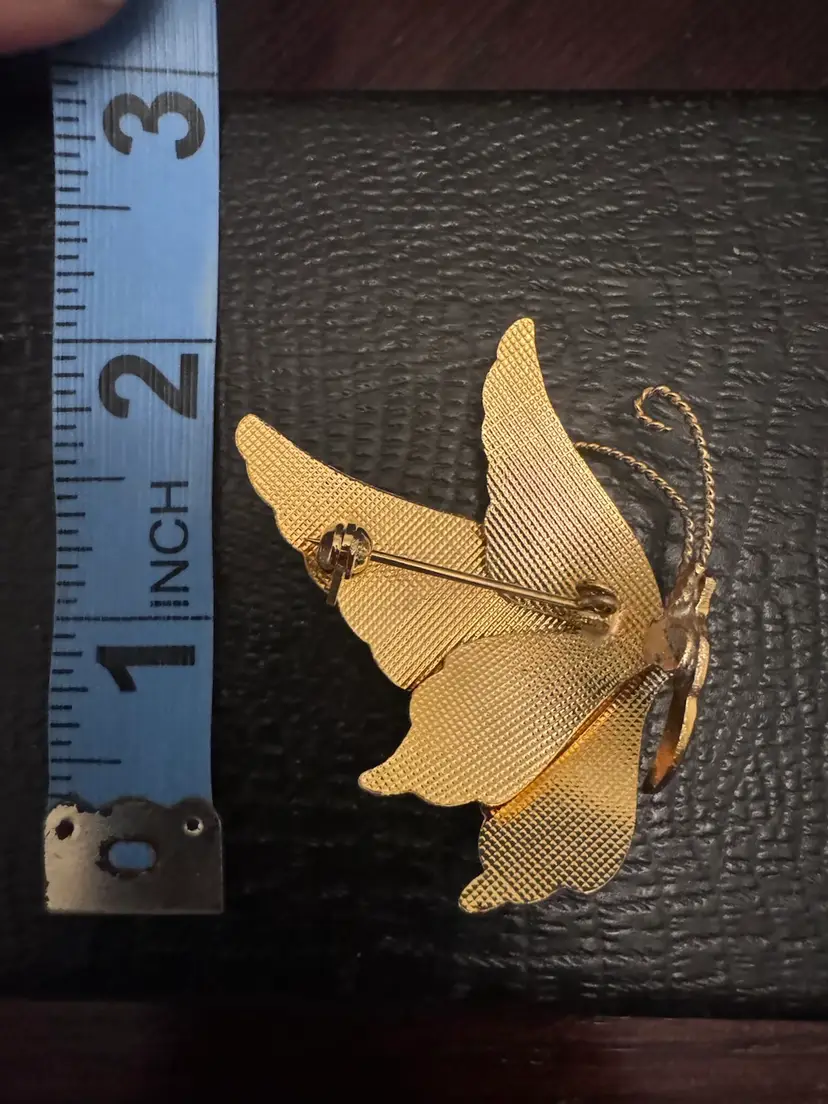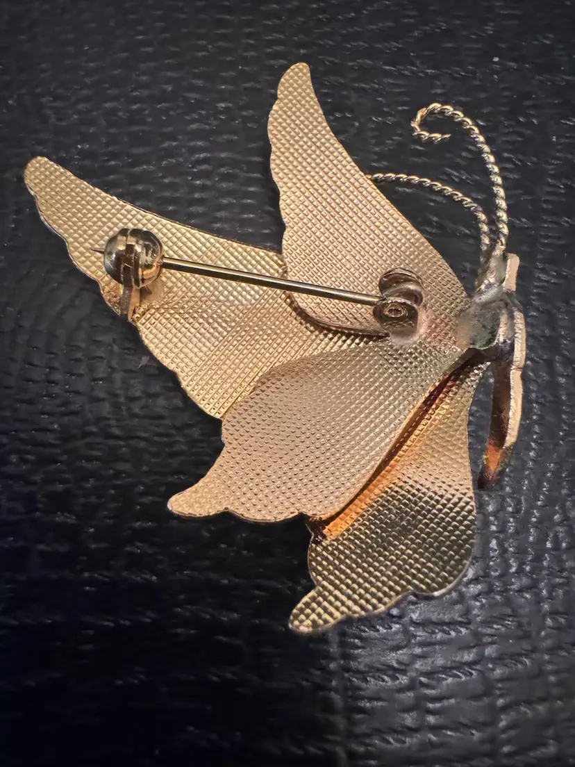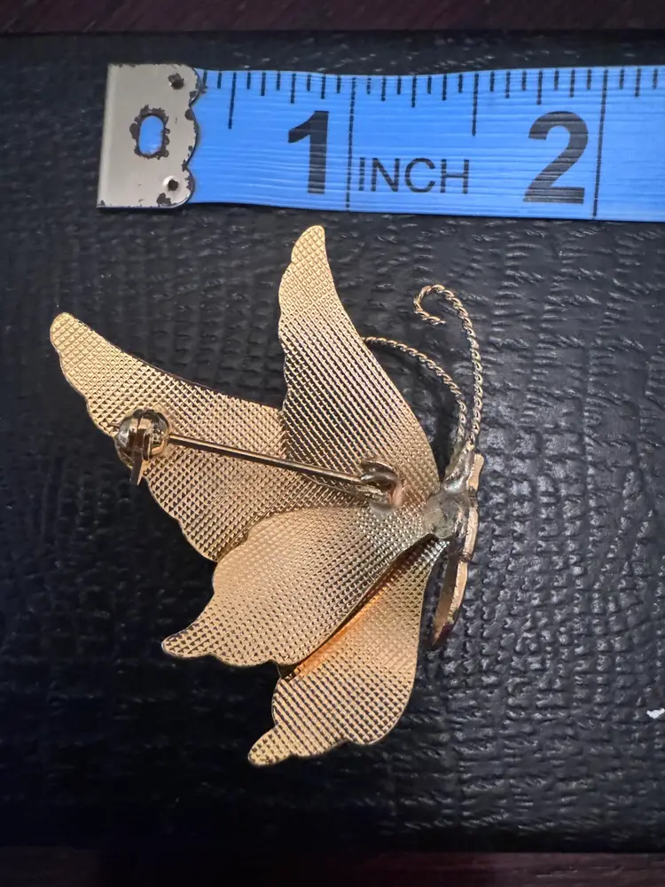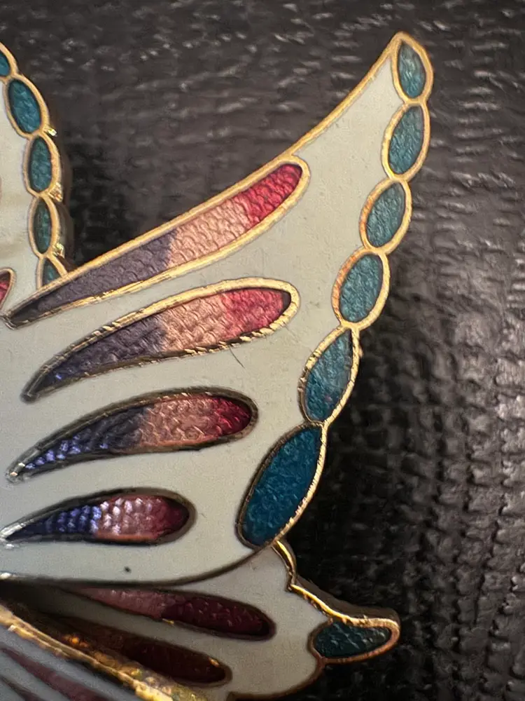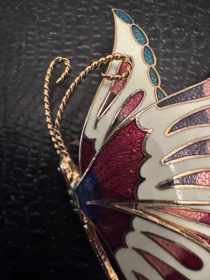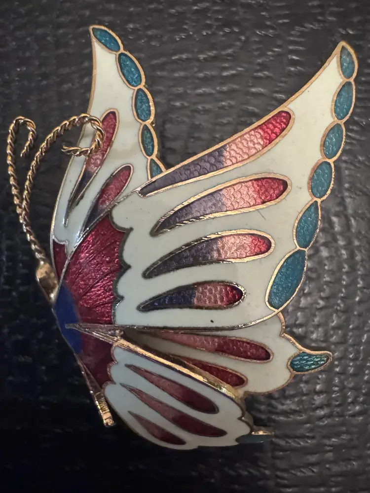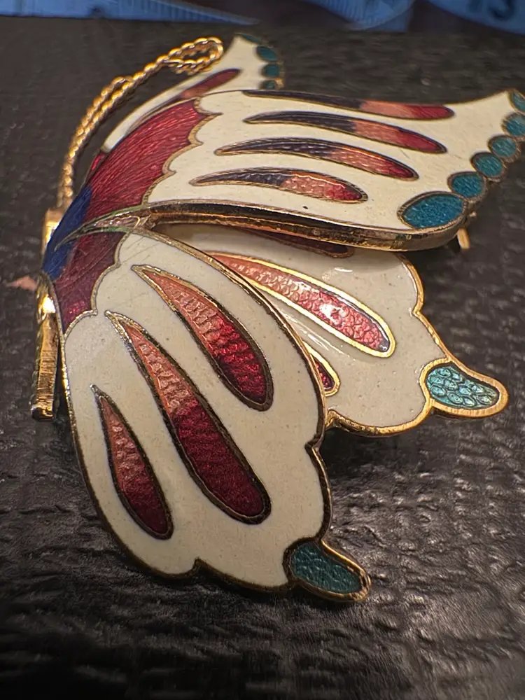 Add a touch of whimsy and elegance to your ensemble with this charming Chinese enamel butterfly brooch. Crafted in the cloisonné style, this 80s piece features vibrant colors and intricate detailing, making it a standout accessory. Measuring approximately 2 inches by 1.5 inches, it's the perfect size to adorn your favorite jacket, scarf, or bag. Ideal for both casual outings and special occasions, this brooch adds a delightful flair to any look. Pre-owned in excellent condition, it's ready to become a cherished part of your collection.