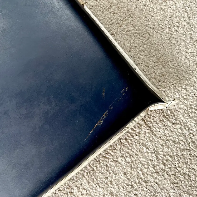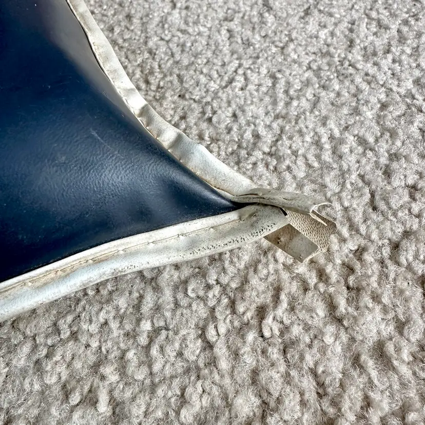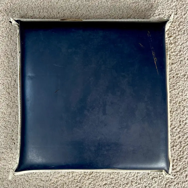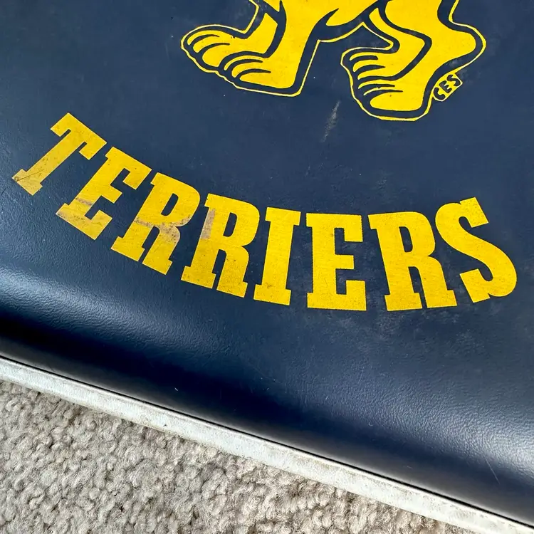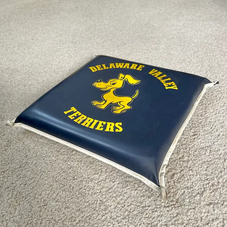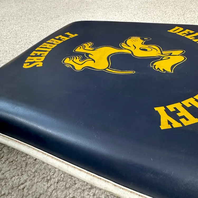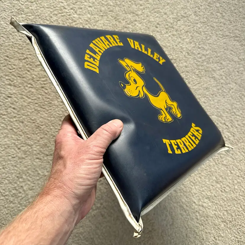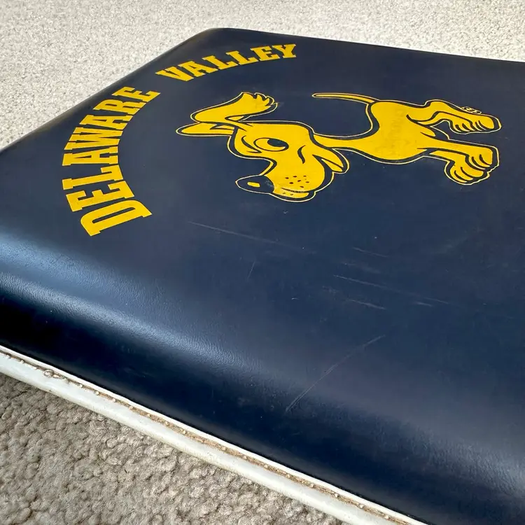 Vintage vinyl bleacher seat cushion from the Delaware Valley Regional High School (DVHS) Terriers located in Frenchtown, NJ. Features the classic Terriers mascot in navy blue and gold with “Delaware Valley Terriers” lettering on top. These cushions were commonly used at high school sporting events and school fundraisers and were not mass-produced, making them rare to find today. Based on style and materials, this piece likely dates to about the 1980s. Great collectible for DVHS alumni, New Jersey school memorabilia collectors, or for display in a sports room, office, or rec room.