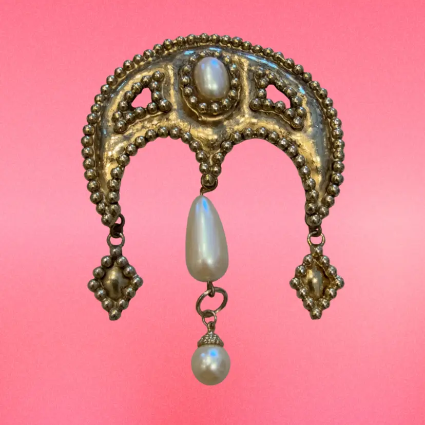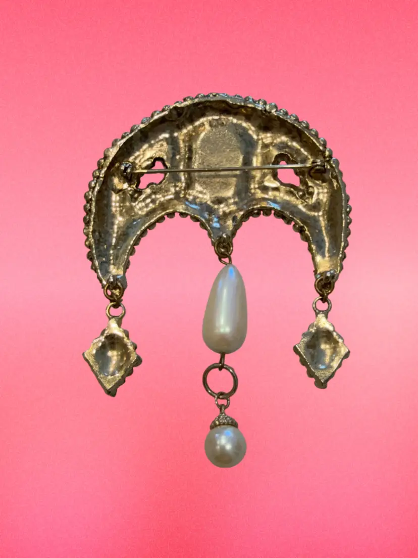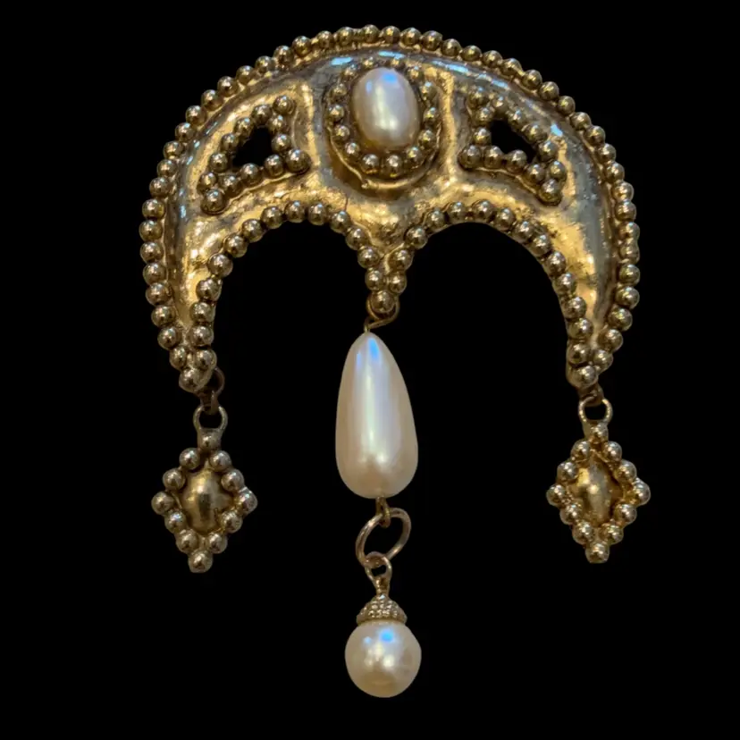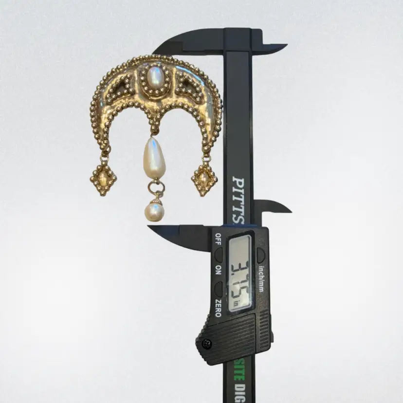 Vintage 1980’s Etruscan Revival Chunky GoldTone Pearl Dangle Brooch 3.75”