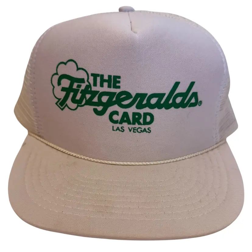The Vintage 1980's Fitzgeralds Card Las Vegas Casino Trucker Style Snapback by HM is a classic white snapback trucker hat. Made of polyester and acrylic, this one-size hat features a mesh back for breathability and an adjustable strap for a comfortable fit. Perfect for casual occasions, this vintage hat is themed around casinos, 80s, 90s, Las Vegas, and is a stylish addition for any unisex adult looking to add a touch of retro flair to their outfit.