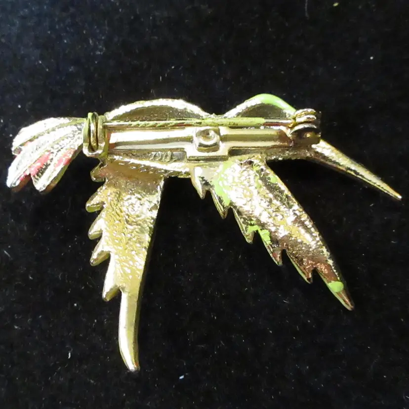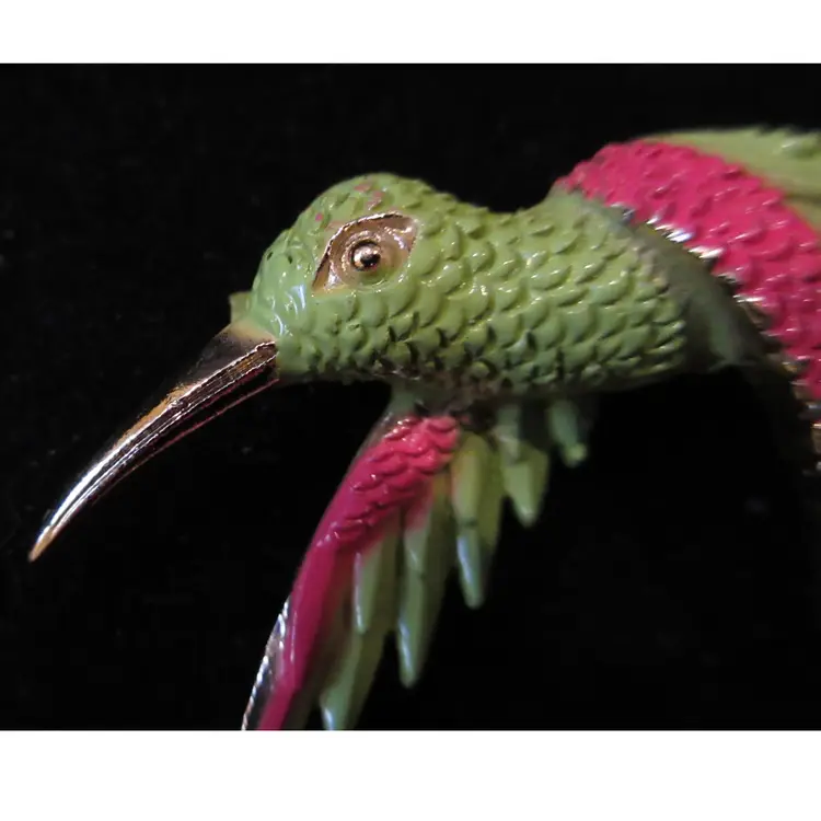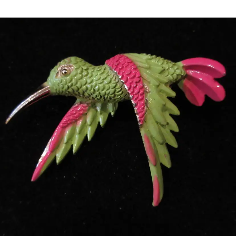 This is a BEAUTIFUL VINTAGE gold tone metal pin from the 1980s. The pin is shaped like a flying hummingbird and has been painted with green and pink enamel to make it more life-like. The brooch is textured to resemble the feathers of the hummingbird. There is some slight wear of the enamel on the edges (please see photos). This pin is long; 1.75 inches. There is a pin back with a sliding C closure.