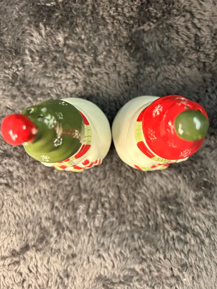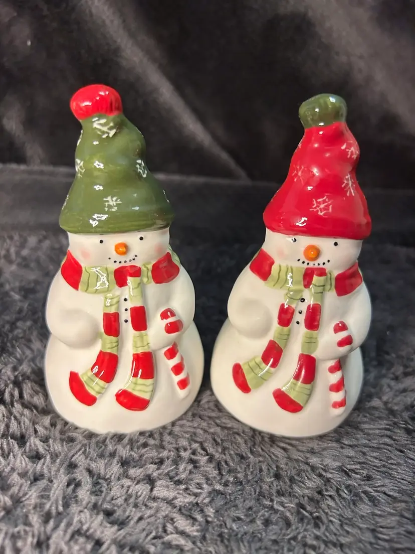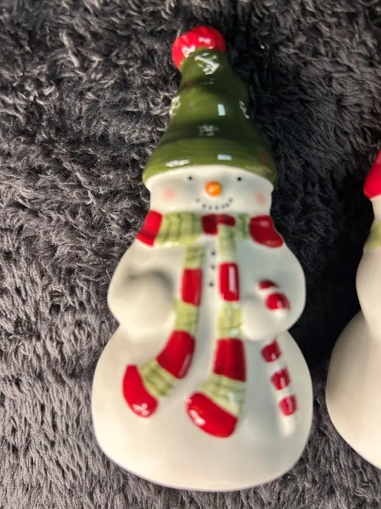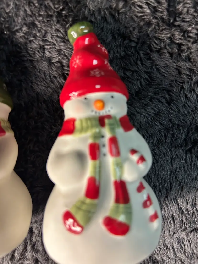 This vintage 1980s Hallmark snowmen salt and pepper shakers are a charming addition to your winter decor. Made of ceramic and measuring 4 inches tall, these small snowman-shaped shakers come in a set of 2 and are adorned with a festive multicolor design. Featuring a reusable and easy-clean style, these shakers are perfect for adding a touch of 1980s nostalgia to your kitchen or dining table during the holiday season. Perfect for collectors or anyone looking for whimsical kitchen tools, these Hallmark shakers are a unique and charming find.