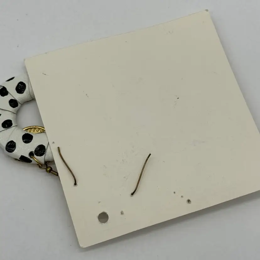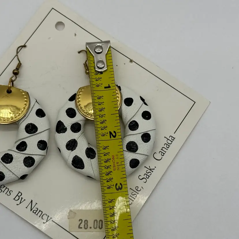 These original vintage earrings were hand crafted in Delisle, Saskatchewan, Canada by Designs by Nancy. They come from a clothing store that had left over inventory when they closed and have been kept safe all of these years. They are new and still on their original cards with the original price of that time. The mediums used are leather and a silver toned metal material. There may be some discoloration plastic on the backing and also on the card. This set is whit and black polka dot painted leather with a gold tone accent.