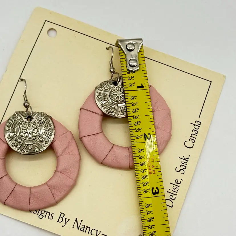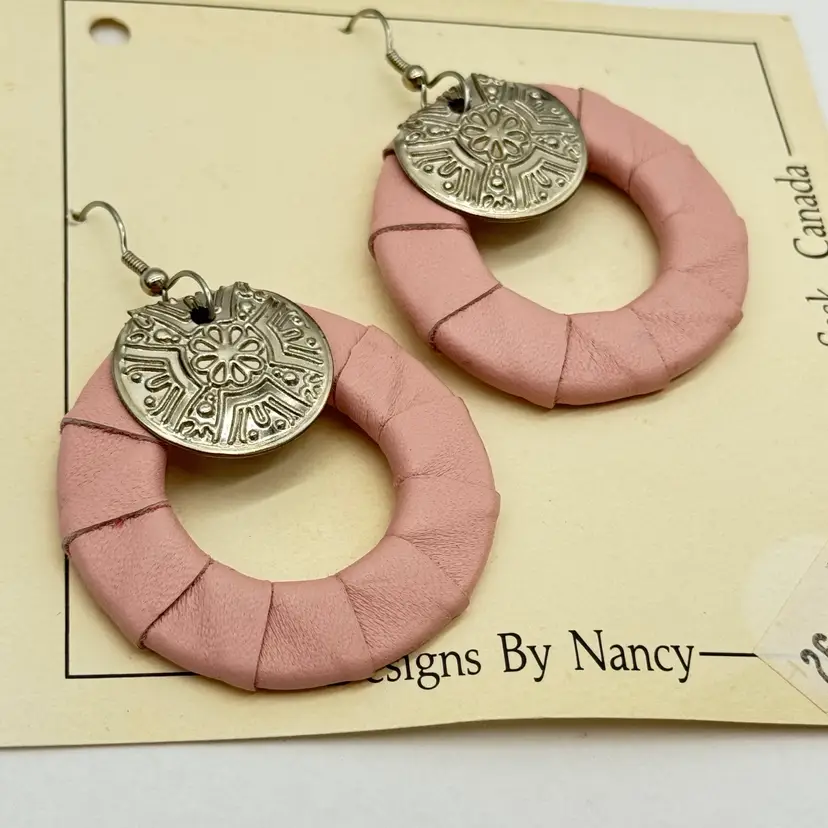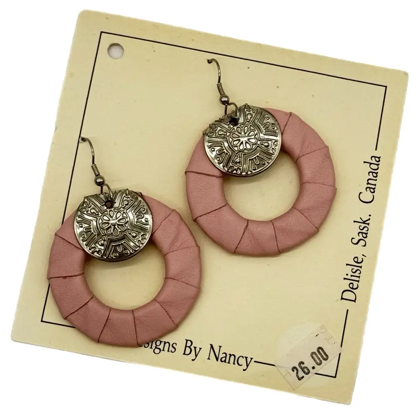 These original vintage earrings were hand crafted in Delisle, Saskatchewan, Canada by Designs by Nancy. They come from a clothing store that had left over inventory when they closed and have been kept safe all of these years. They are new and still on their original cards with the original price of that time. The mediums used are leather and a silver toned metal material. There may be some discoloration plastic on the backing and also on the card. This set is pink leather with a silver tone accent.