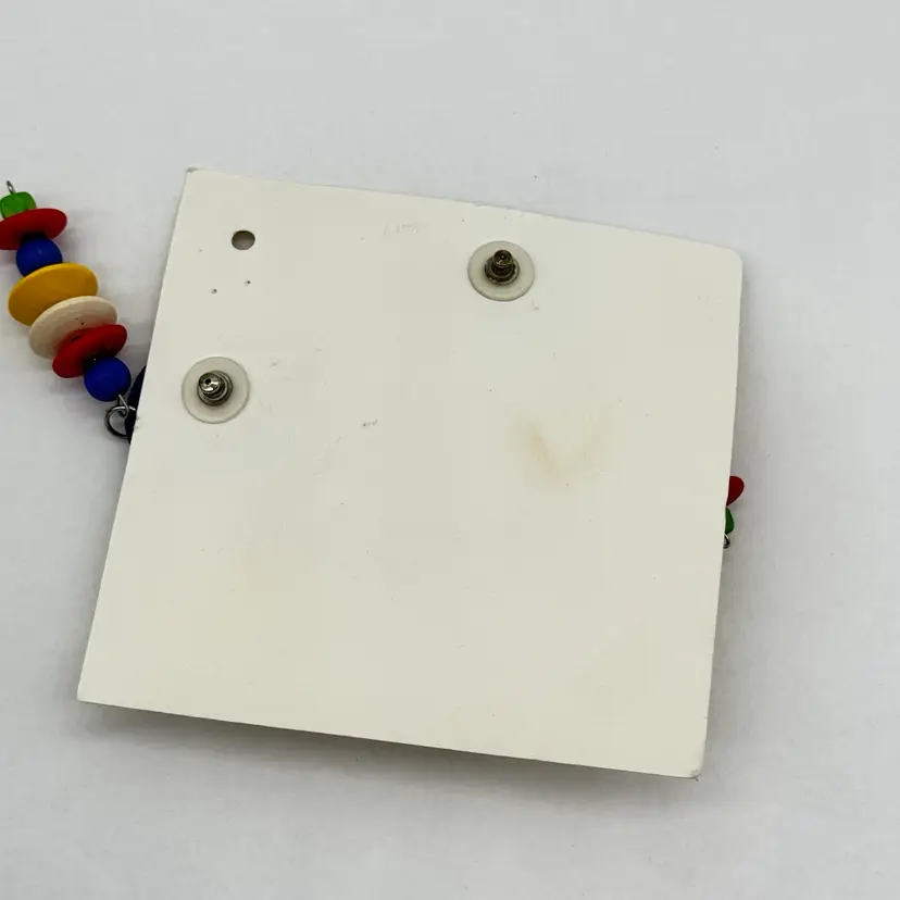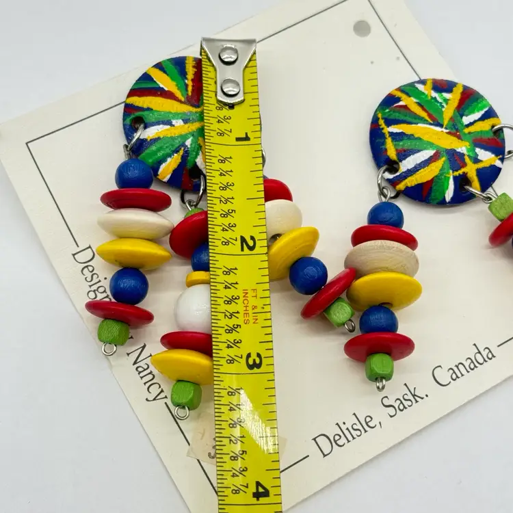 These original vintage earrings were hand crafted in Delisle, Saskatchewan, Canada by Designs by Nancy. They come from a clothing store that had left over inventory when they closed and have been kept safe all of these years. They are new and still on their original cards with the original price of that time. The mediums used are Handpainted leather and wood and plastic beads . There may be some discoloration plastic on the backing and also on the card. This set is red, blue, yellow, white and green.