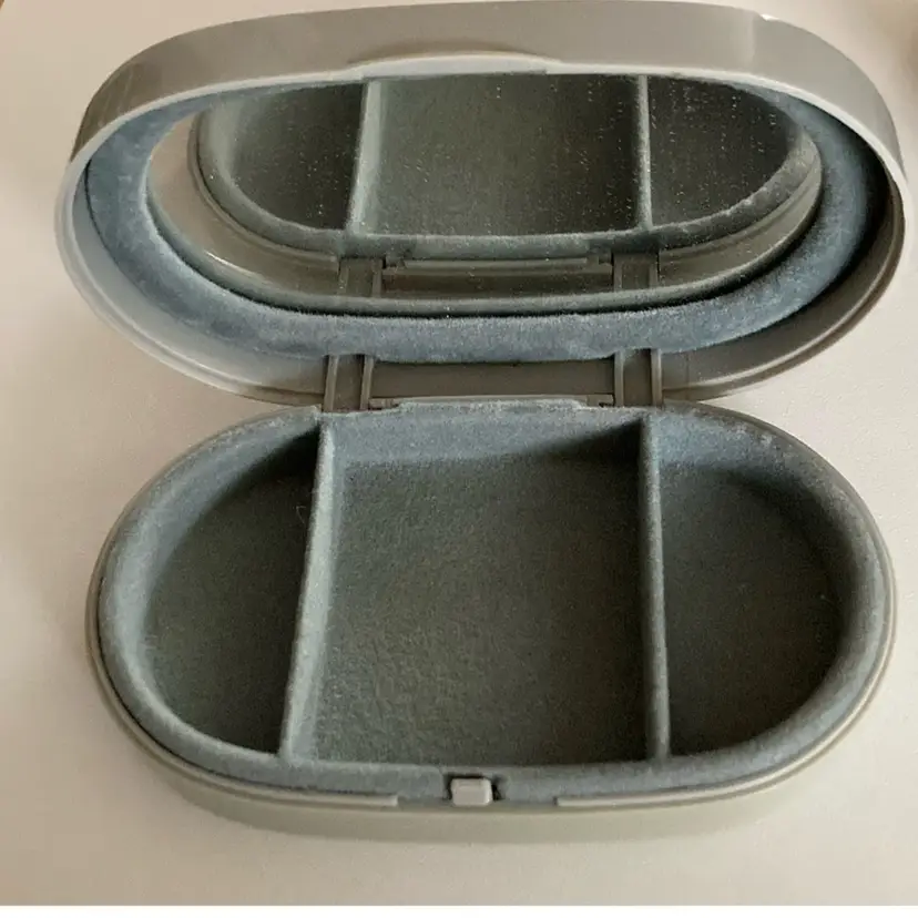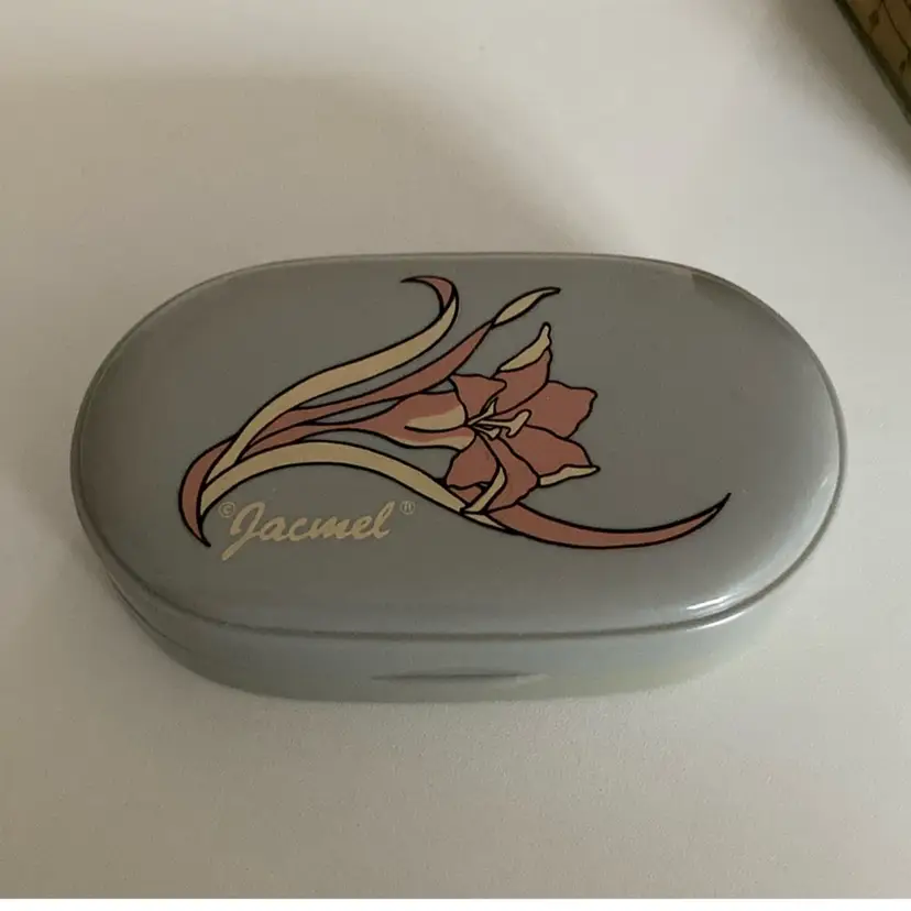 Vintage 1980’s Jacmel travel jewelry box with pretty lily flower on too. Jacmel was an upoer level jewelry designer. The box opens and has a mirror and velvet lined sectional compartments. The jewelry box measures 2 3/4” x 4 1/2” closed. There is variation in the color of the plastic case which is common for the plastics used in this time period and light surface scratches. Still very collectible.