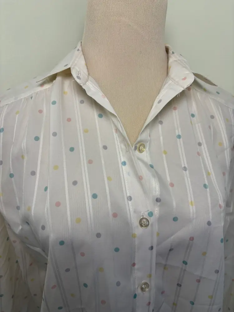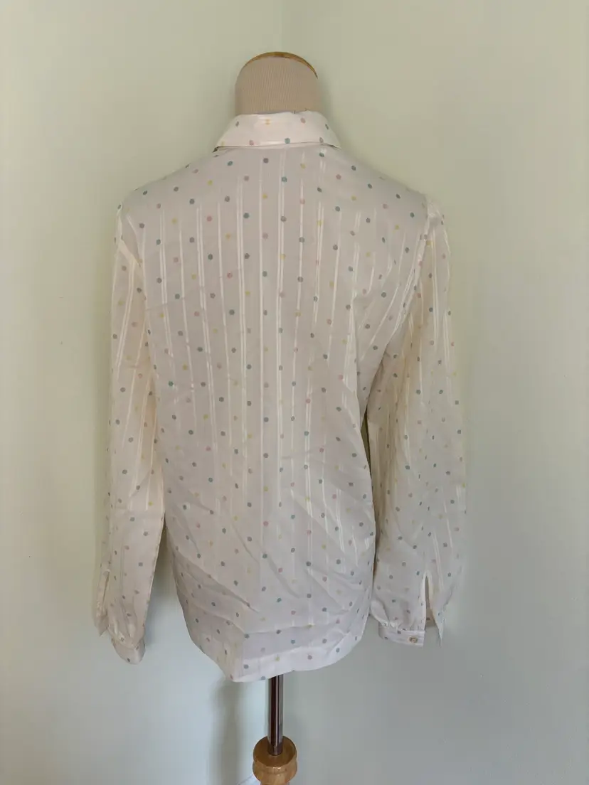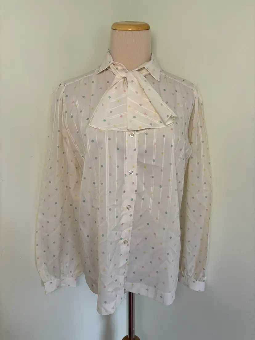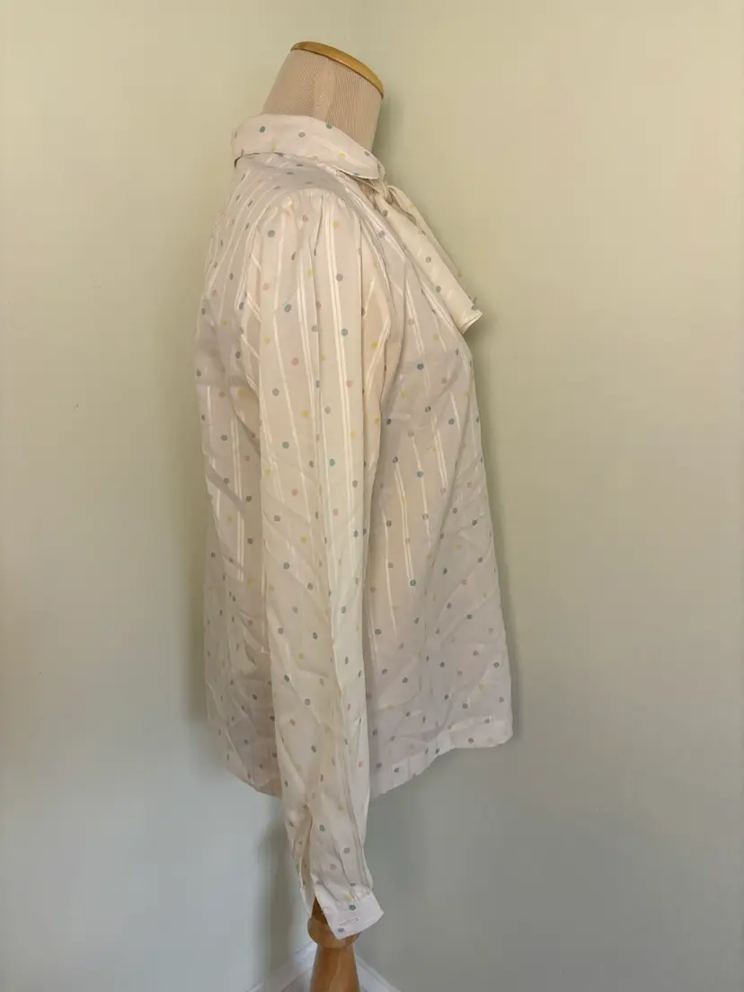 Vintage 1980s ladies Koret rainbow polka dot button up blouse with bow tie closure and puffy sleeves