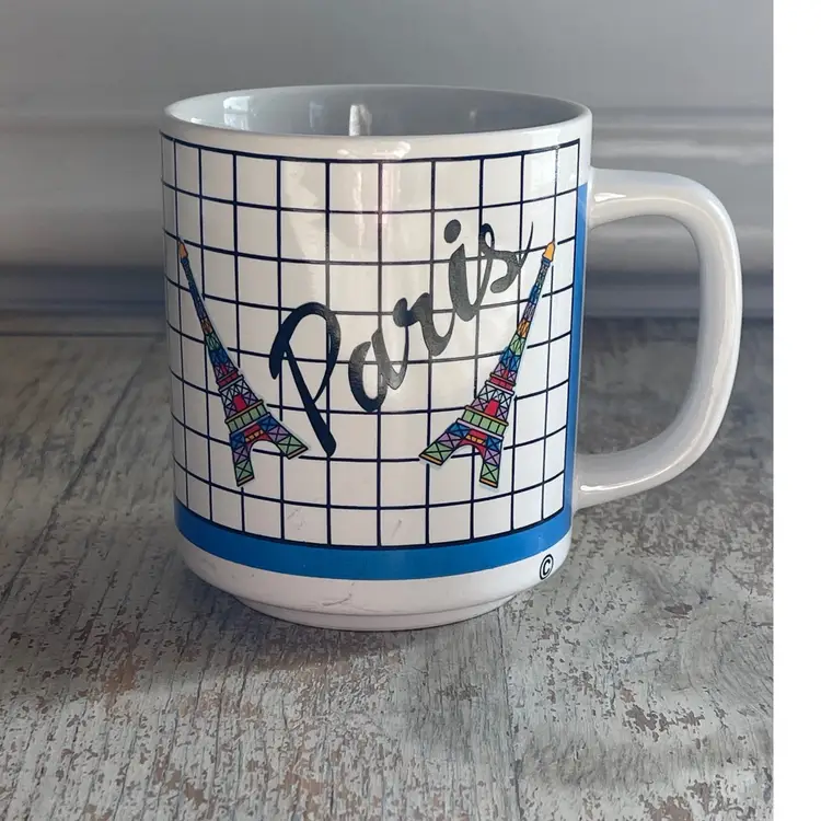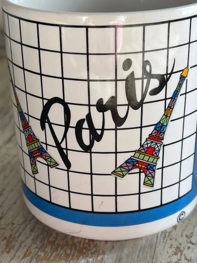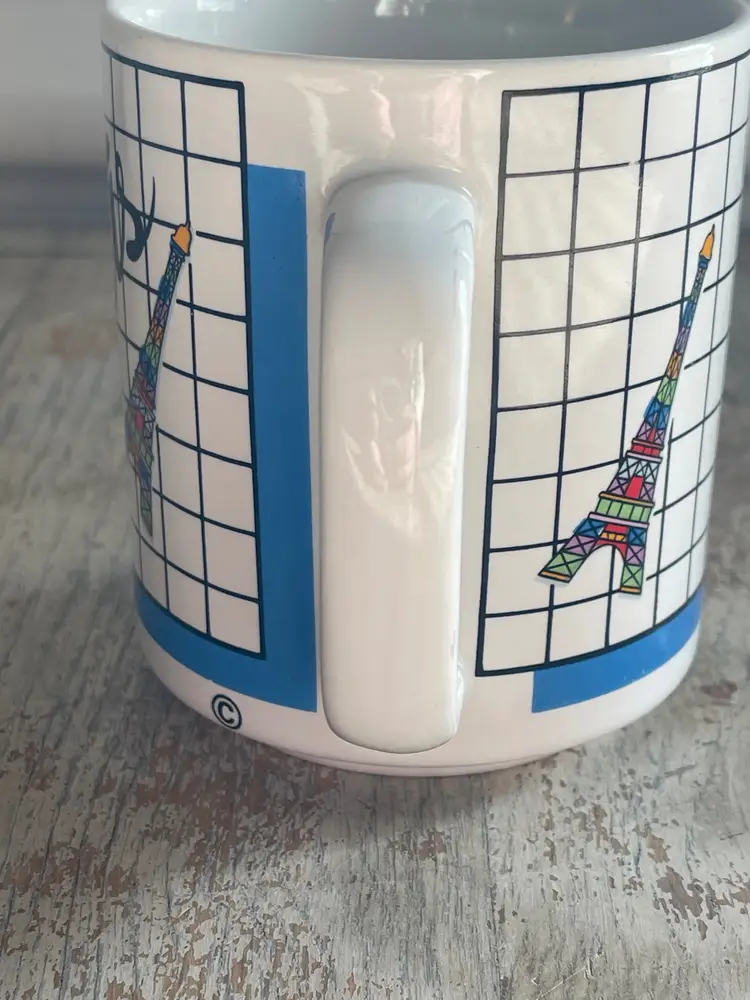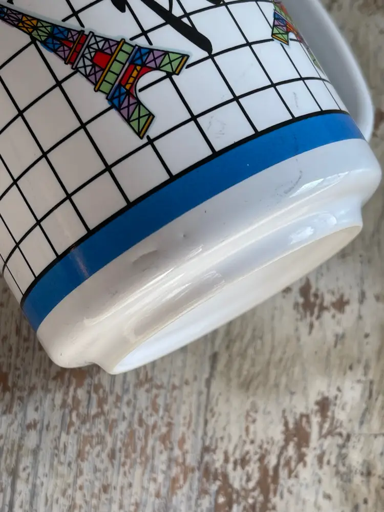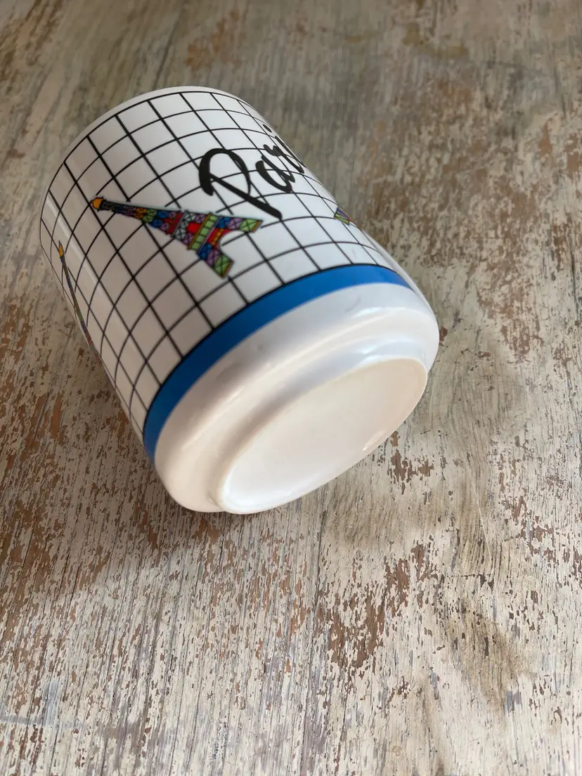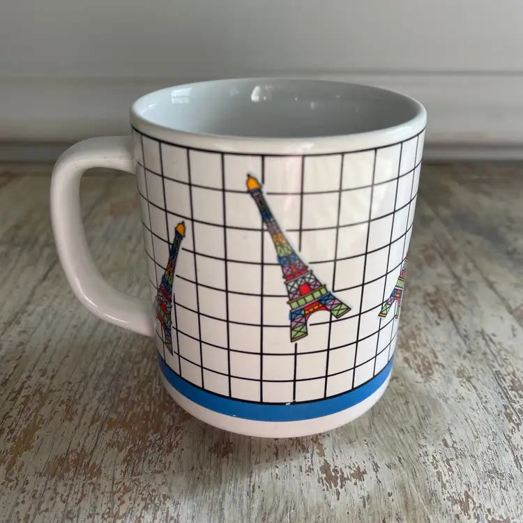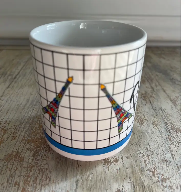 Unique and colorful 1980s Paris souvenir coffee mug in great condition. This post modern style mug with grid background and Eiffel Towers circling the cup is very clean with no chips or cracks. The rainbow Eiffel Tower pattern is has a copyright but no stamp or signature. Graphics are intact with no fade or damage to decoration.