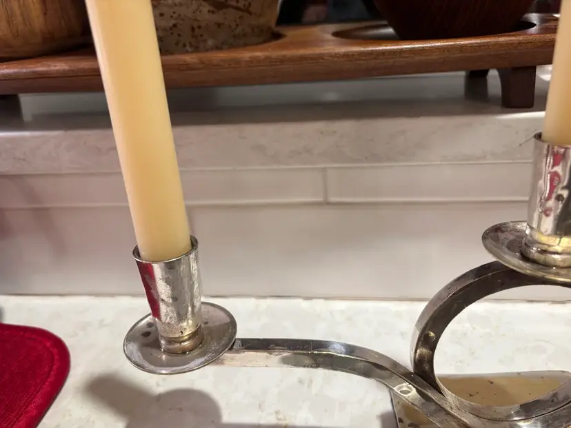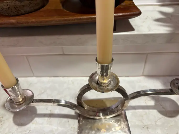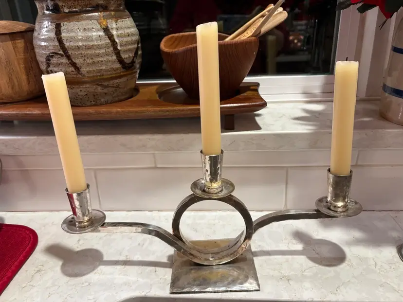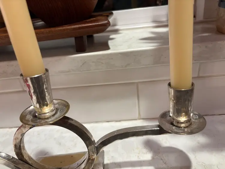 The Vintage 1980s Restoration Hardware three-arm hammered silverplate candelabra is a stylish and unique decorative piece perfect for adding a touch of vintage charm to any space. With its hammered finish and sleek silverplate construction, this candelabra exudes a timeless elegance that is sure to impress. The three arms provide ample space for holding candles, making it ideal for both practical use and display. Whether used in a dining room, living room, or entryway, this candelabra is sure to be a standout piece in any collection.