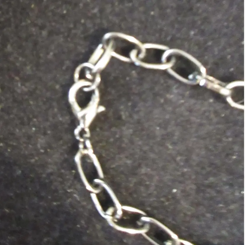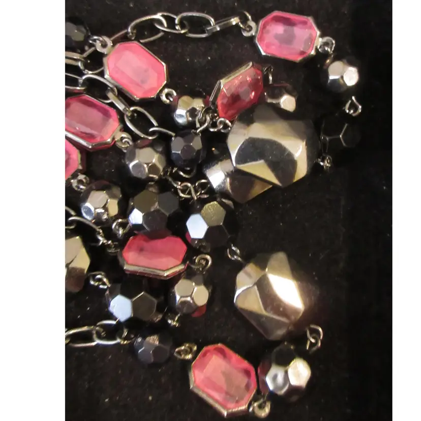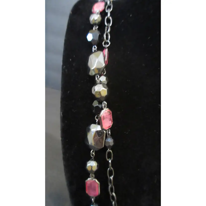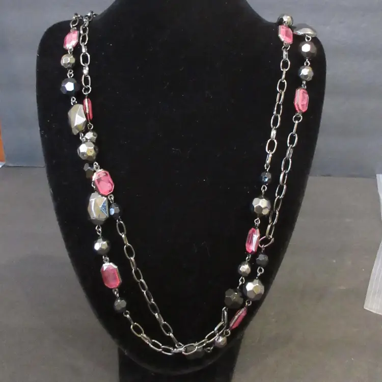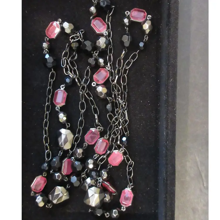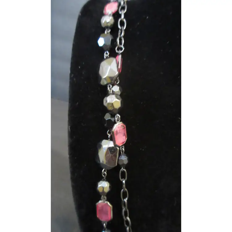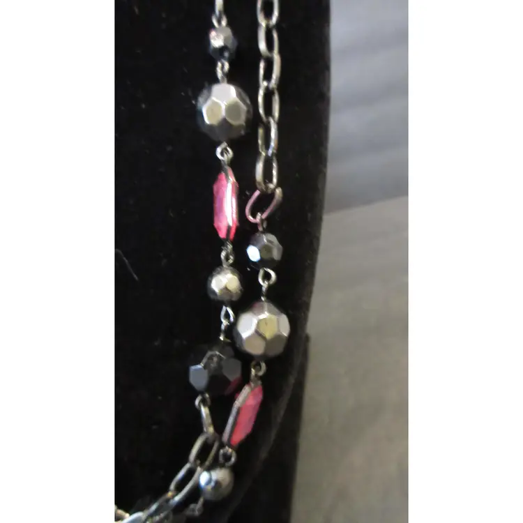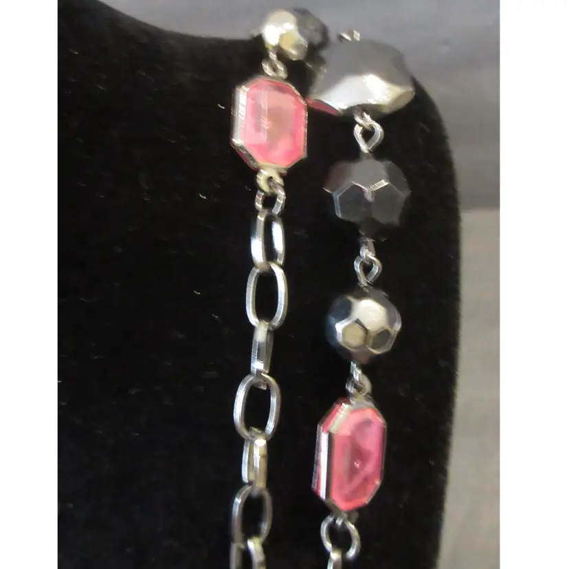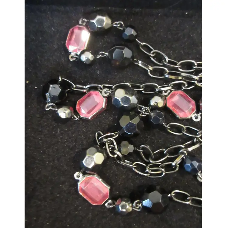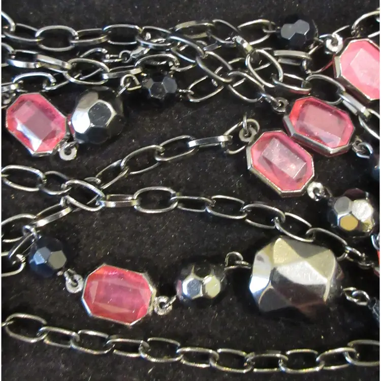 This is a BEAUTIFUL vintage LONG silver tone gun metal chain link necklace. The necklace has several stations that consist of silver, black and pink links. The links are geometric and spherical in shape and give the necklace a very 1980s look. This necklace is 56 inches long, so it's perfect for doubling up. It has a lobster claw closure.