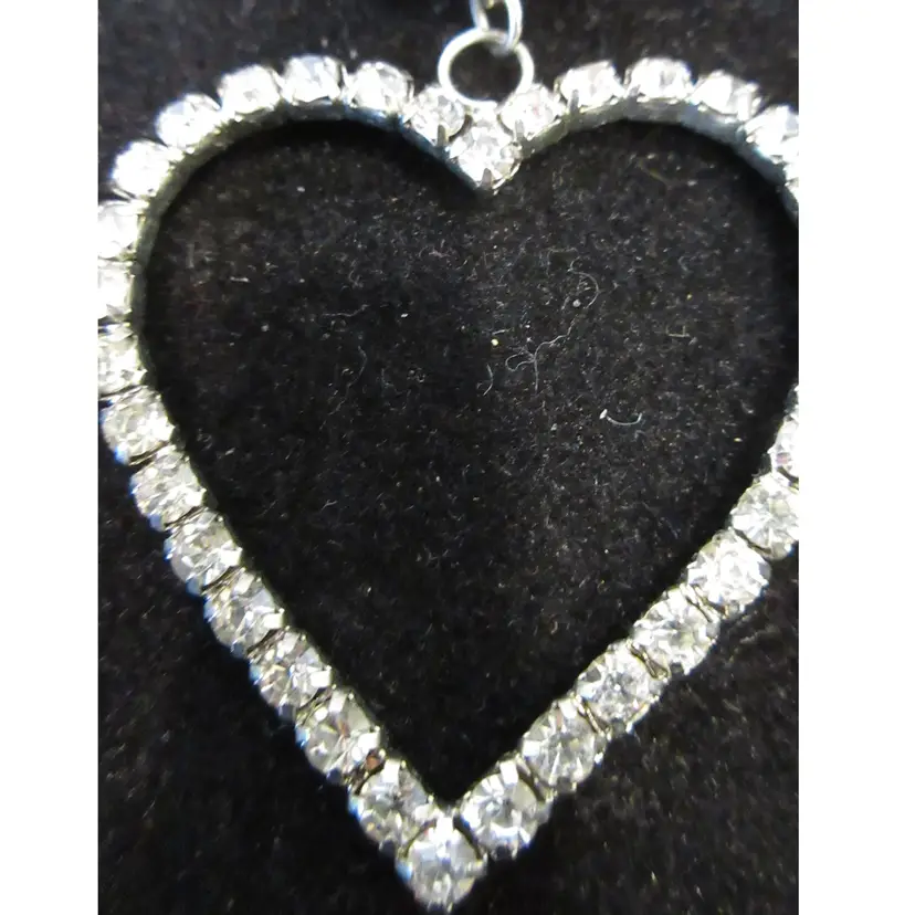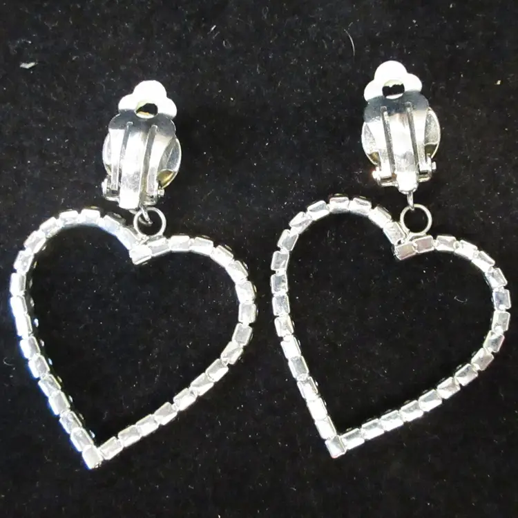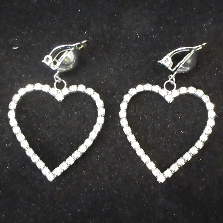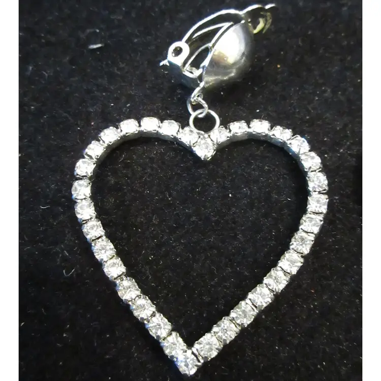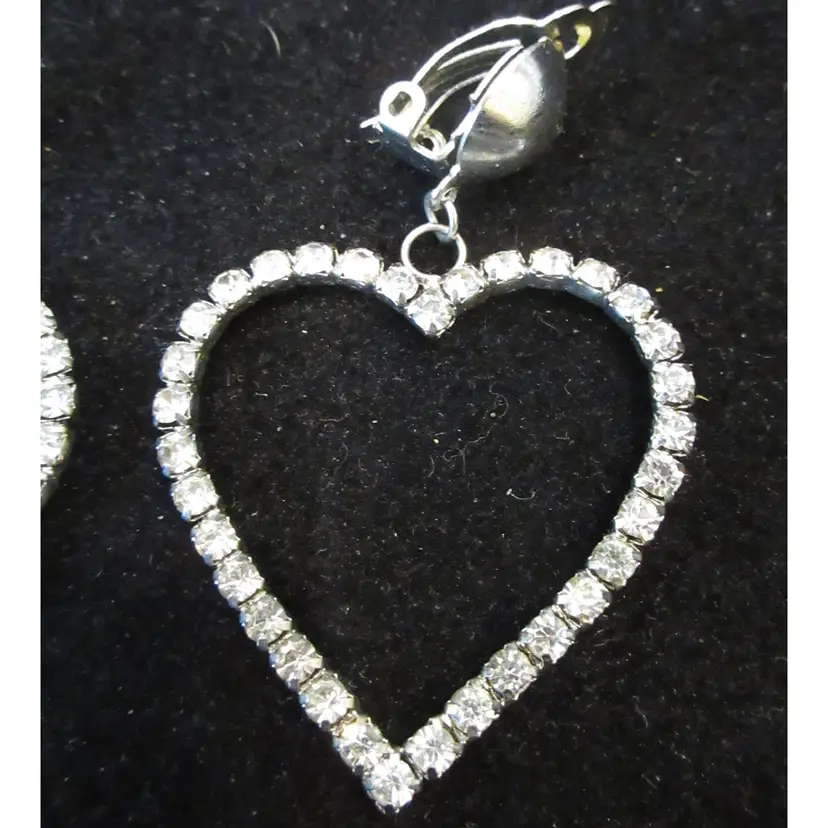 This is a BEAUTIFUL pair of silver tone metal open heart earrings with prong-set clear crystal rhinestones. The hearts are 2 inches long and 1.5 inches wide. They have a clip in attachment.