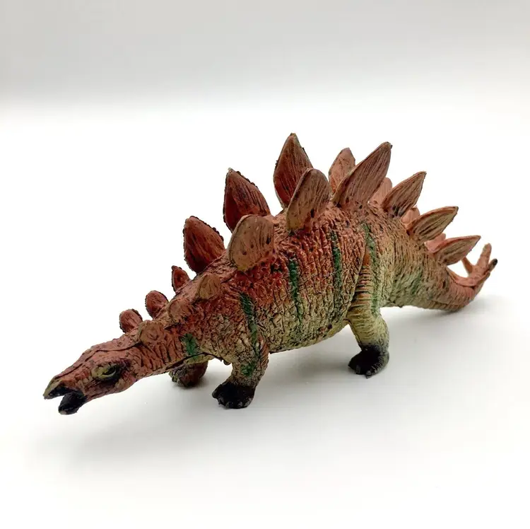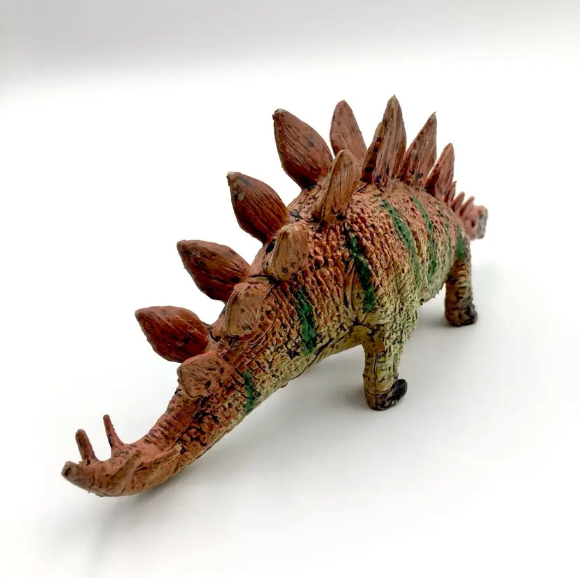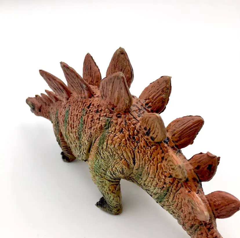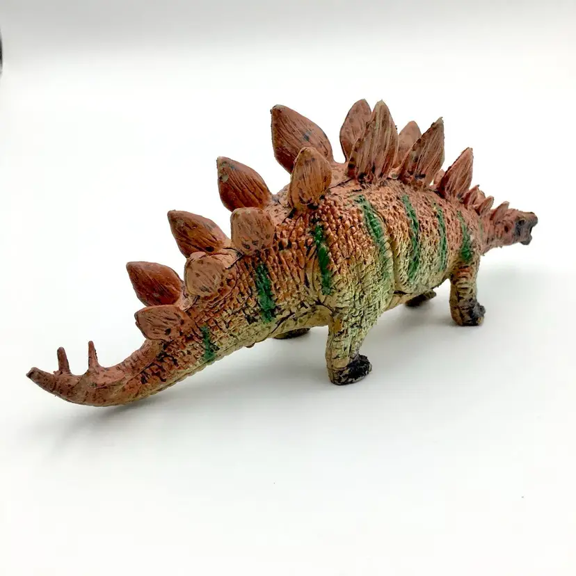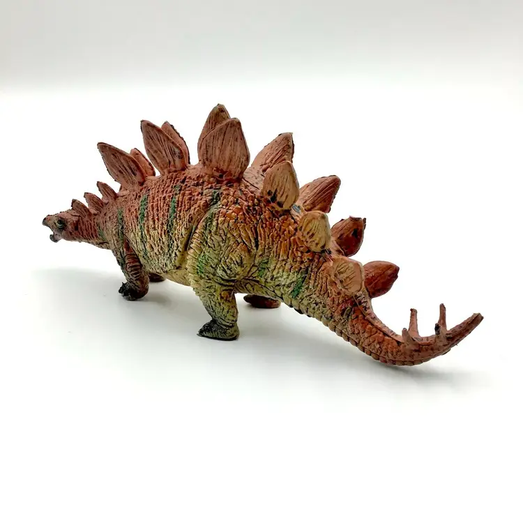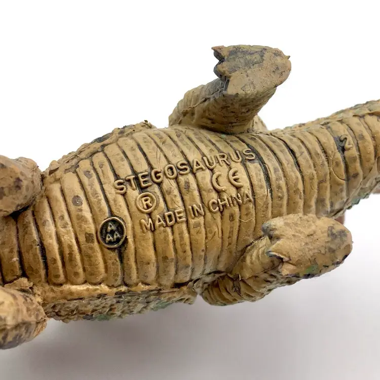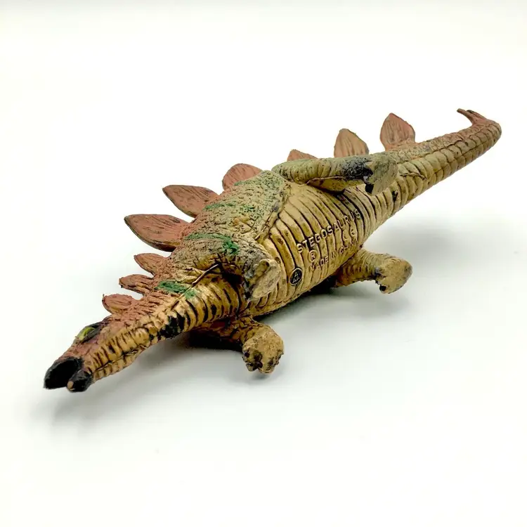 Vintage Stegosaurus dinosaur rubber toy figurine made by AAA Toys in China. Estimate this dates to 1980s. Stamped on bottom with the AAA company logo and CE (China Enterprises). Item is complete and with only minor wear to the original paint as shown. Displays Well!! Measures about 7.5” long. See pics for more details.