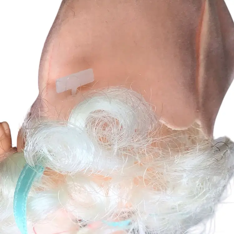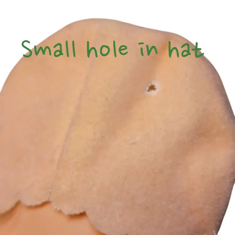Hat is still attached, however it unfortunately does have a small hole in the front. See photos for reference. She has her original outfit but missing her little blue booties and her little friend Hopsalot the little white bunny and the comb. She does not have any scent that I can detect.
