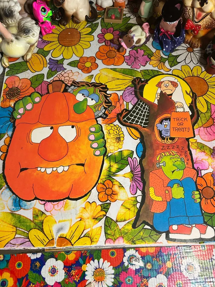 For sale! Vintage 1980s Spooky Tree and Frank with Pumpkin. Good vintage condition. One sided. Pumpkin is 8 x 6 inches. Tree is 10 x 5 inches.