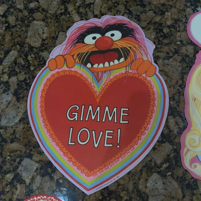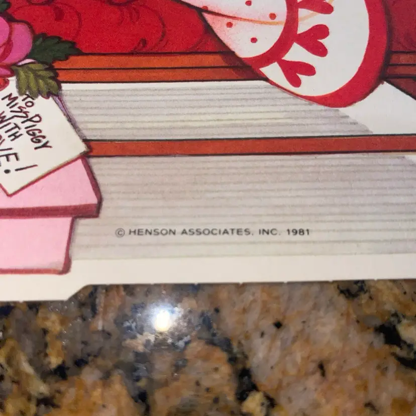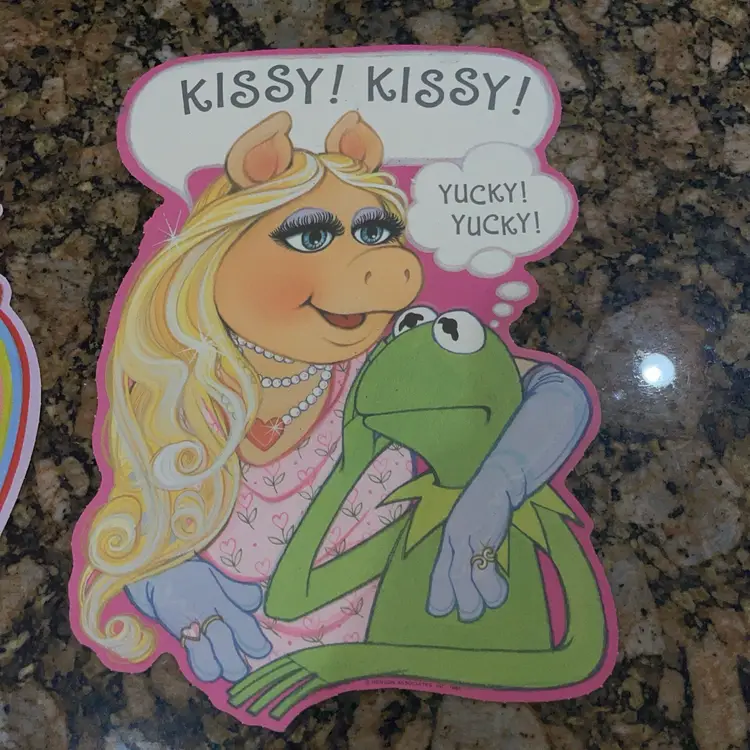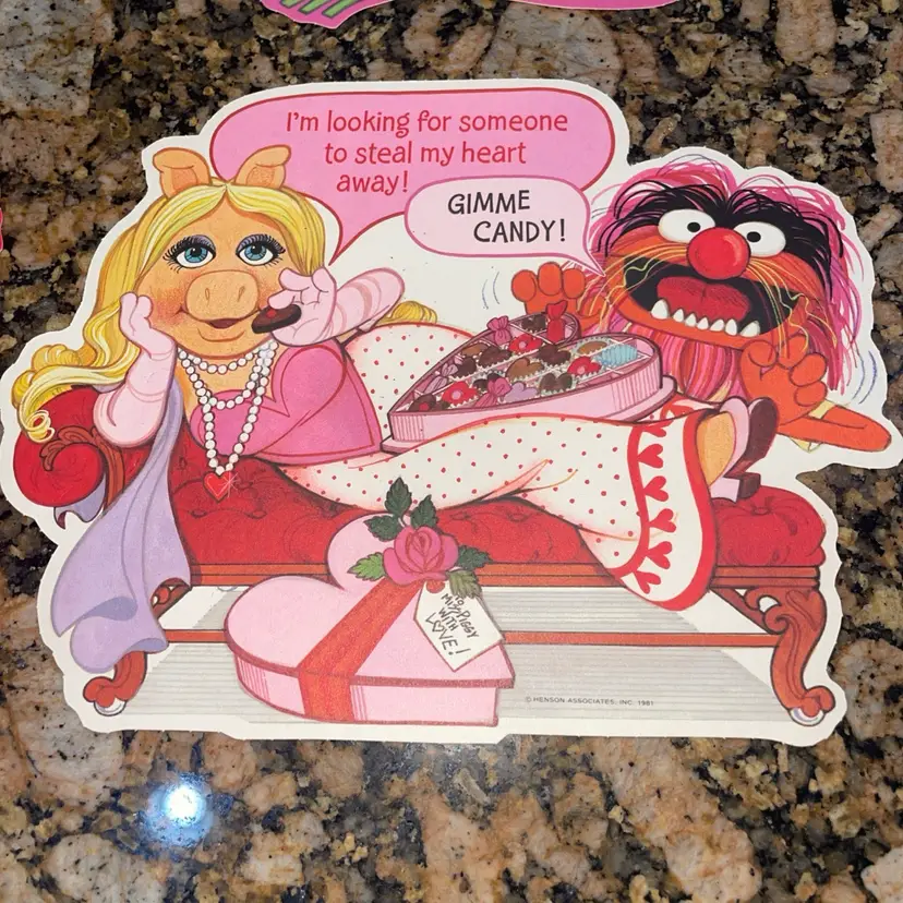 The product is a vintage 1981 Miss Piggy and Kermit Muppets paper die cut featuring a Valentine's Day theme. This collectible item is perfect for fans of the Muppets franchise and lovers of nostalgic greeting cards. With its Miss Piggy and Kermit characters, this vintage piece adds a touch of retro charm to any Valentine's Day celebration.