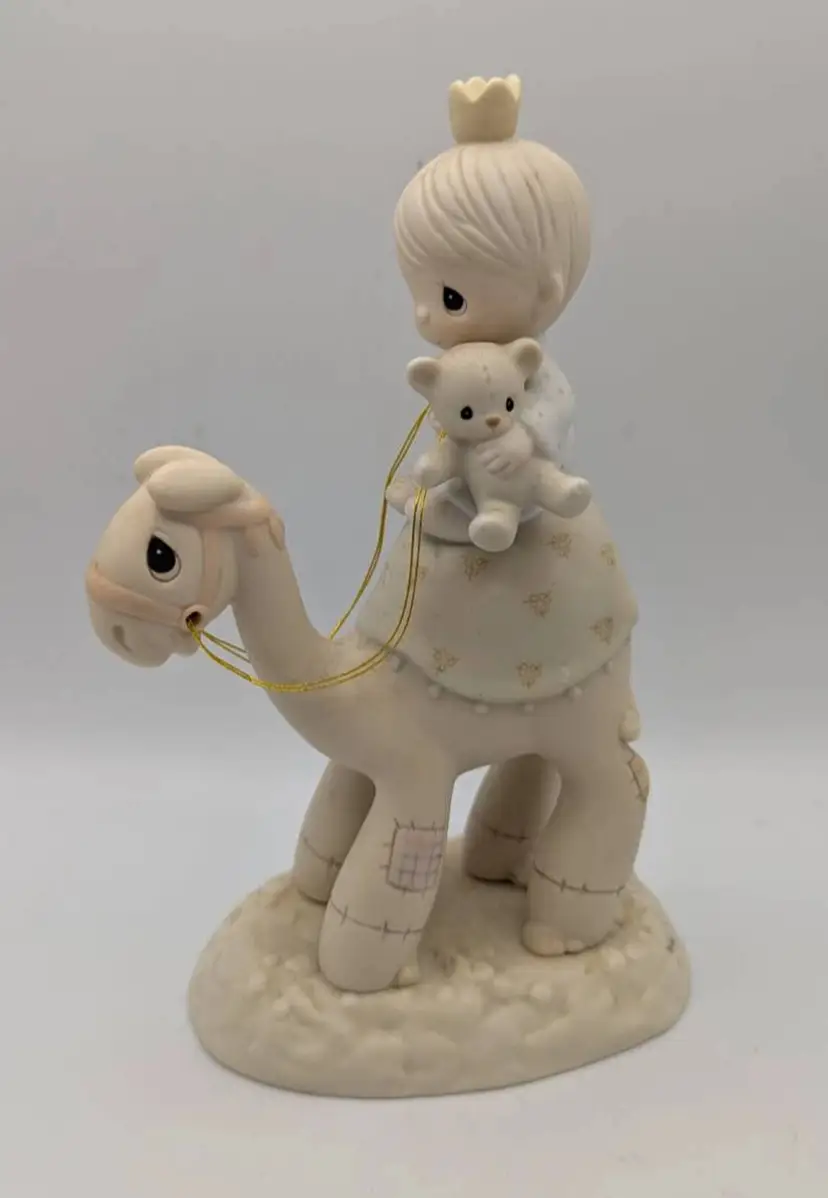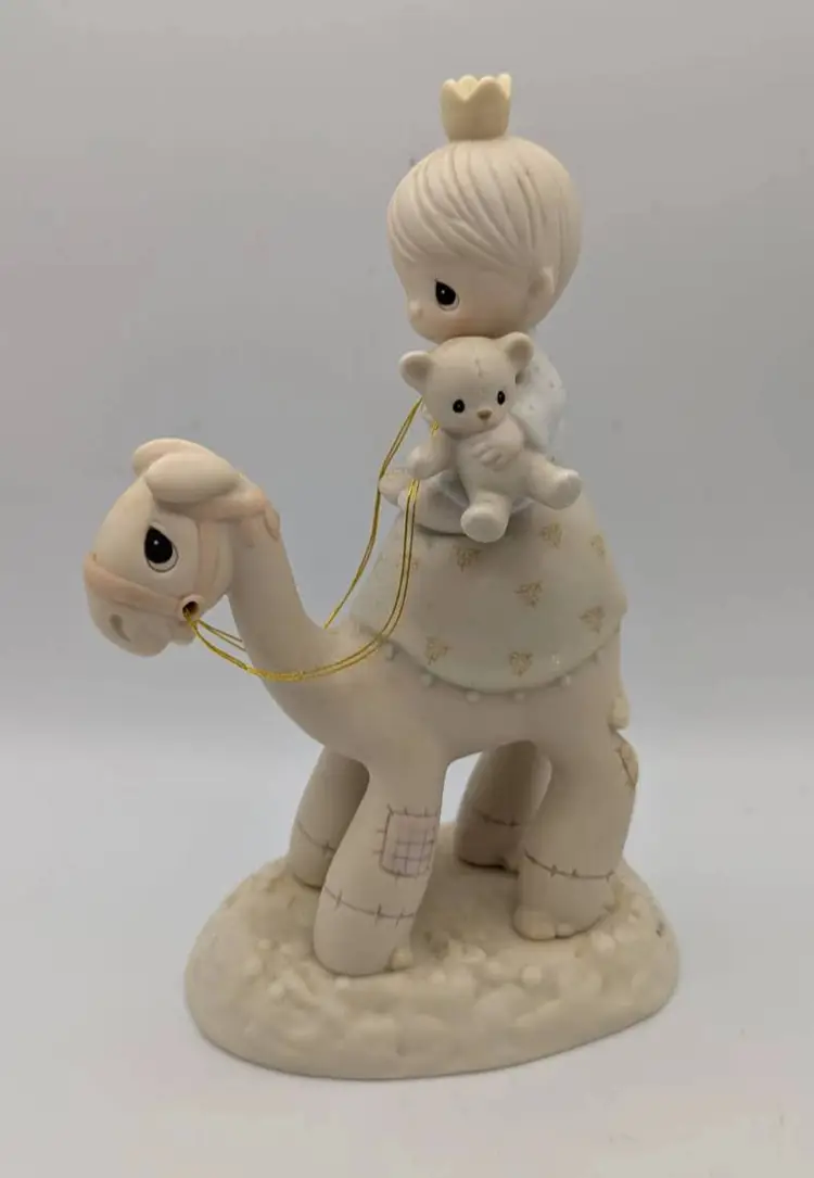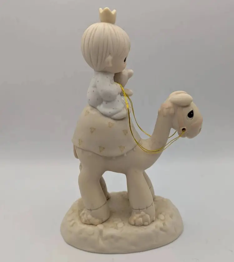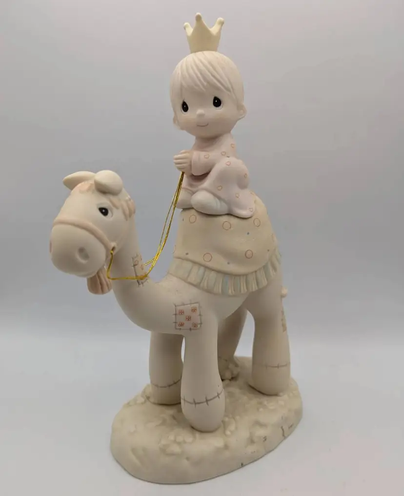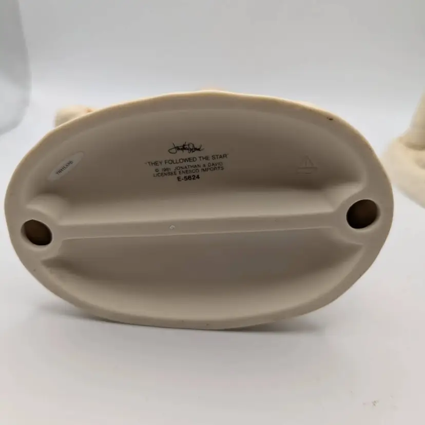 This is the set of 1981 Precious Moments Wisemen on Camels. Titled" They followed The Star" It is a Jonathan and David art piece for Enesco. E-5624 is the number. Made in Thailand. They have a matte finish. They are the sweetest figurines I have owned. The two tall ones measure 9.5 inches tall, the little one is 7.5 inches tall.