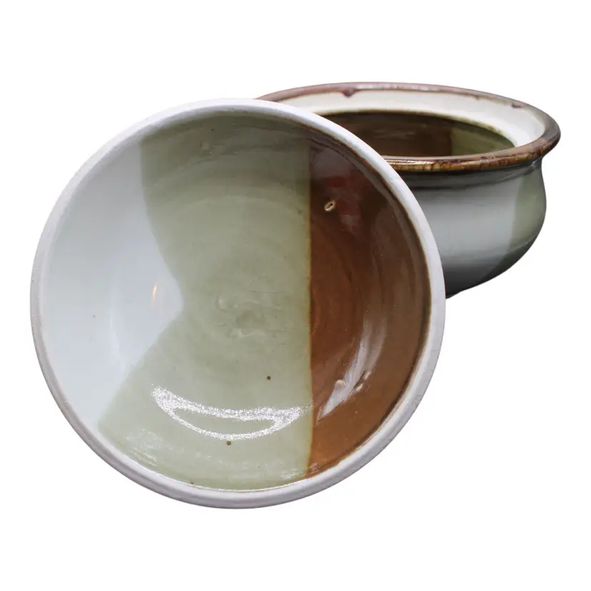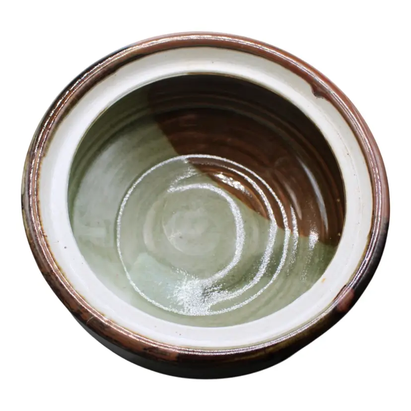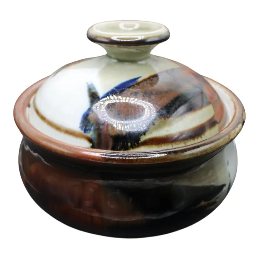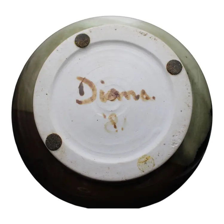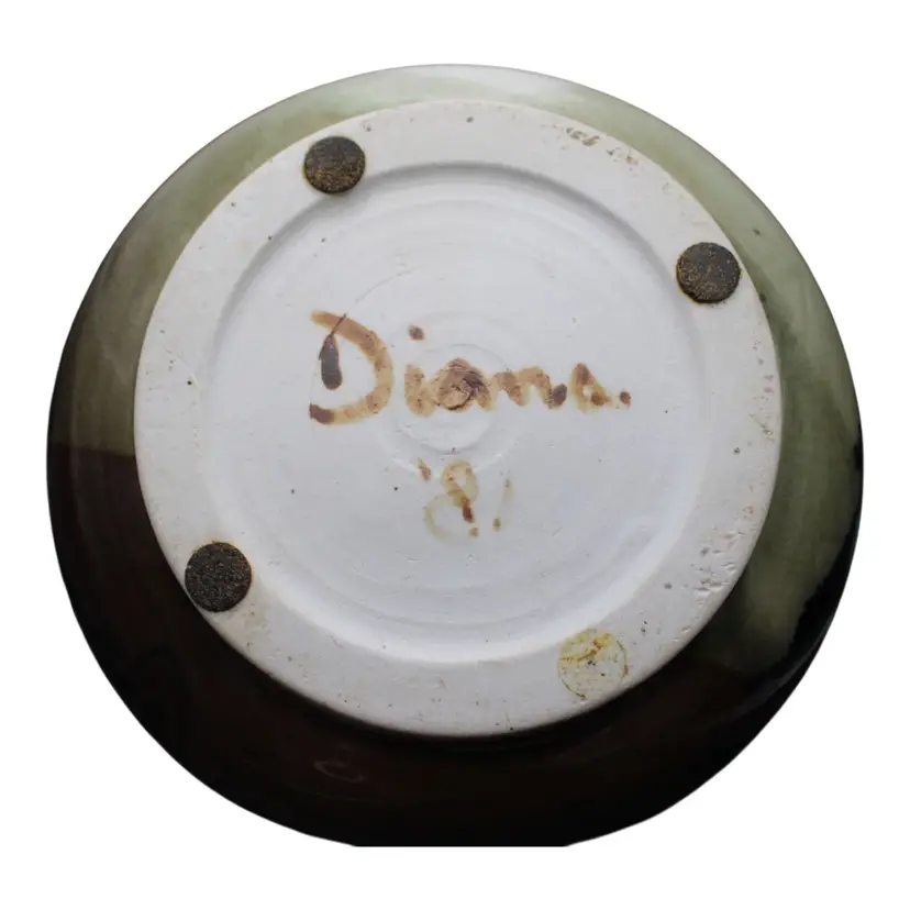 Vintage 1981 Studio Pottery Lidded Bean Pot Signed Diana Hand Thrown Stoneware Casserole 7” Tall 8” Opening. Crazing but no chips or cracks.