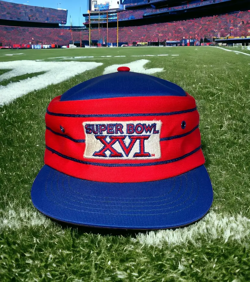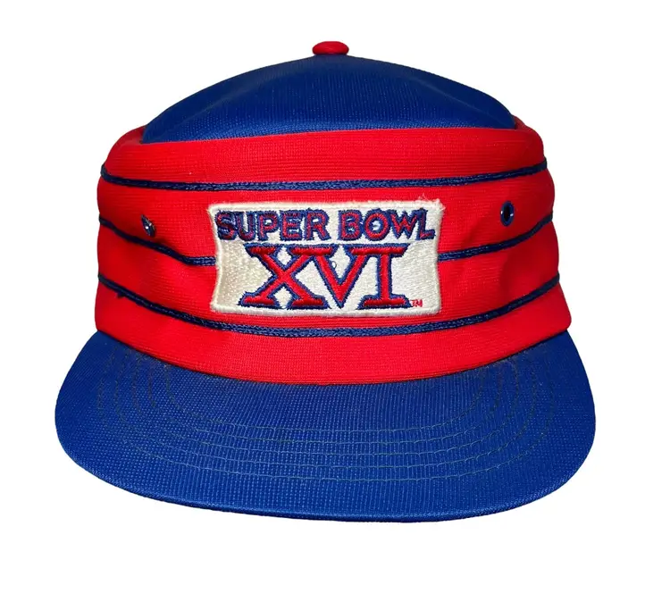 This listing is a Fantastic Vintage 1981 Super Bowl XVI Sports Specialties Pillbox NFL Football Snapback Hat. This hat is a men's one size fits all, adjustable style snapback cap. It is made by the Sports Specialties Company, and shows no evidence of wear.