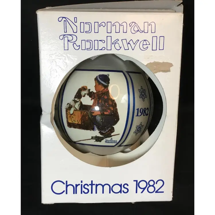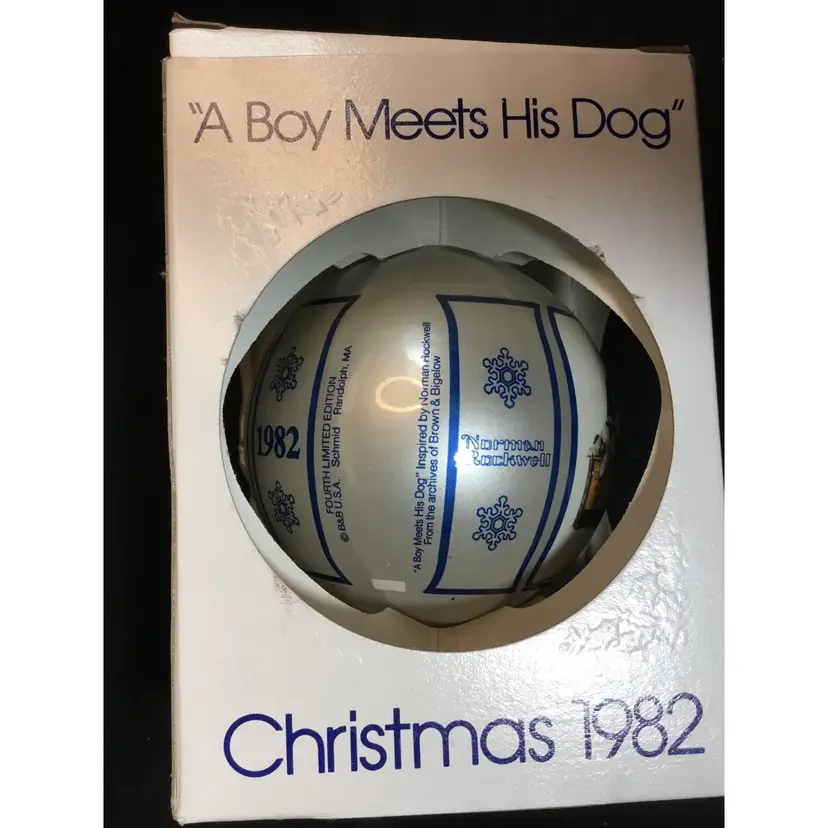 3 inches in diameter, round, white, satin covered ball. Plastic wrap around middle has reproduction of Normal Rockwell's painting, a Boy Meets His Dog. 1982
