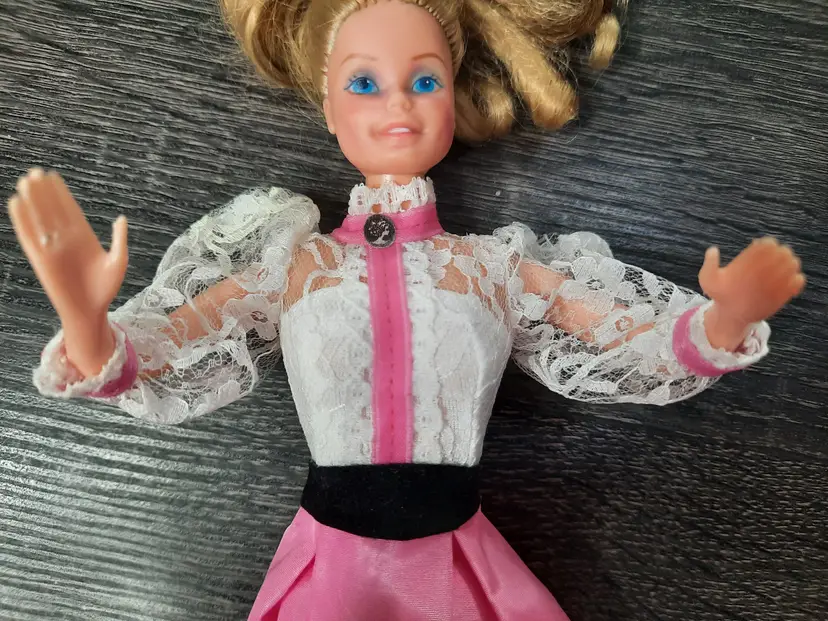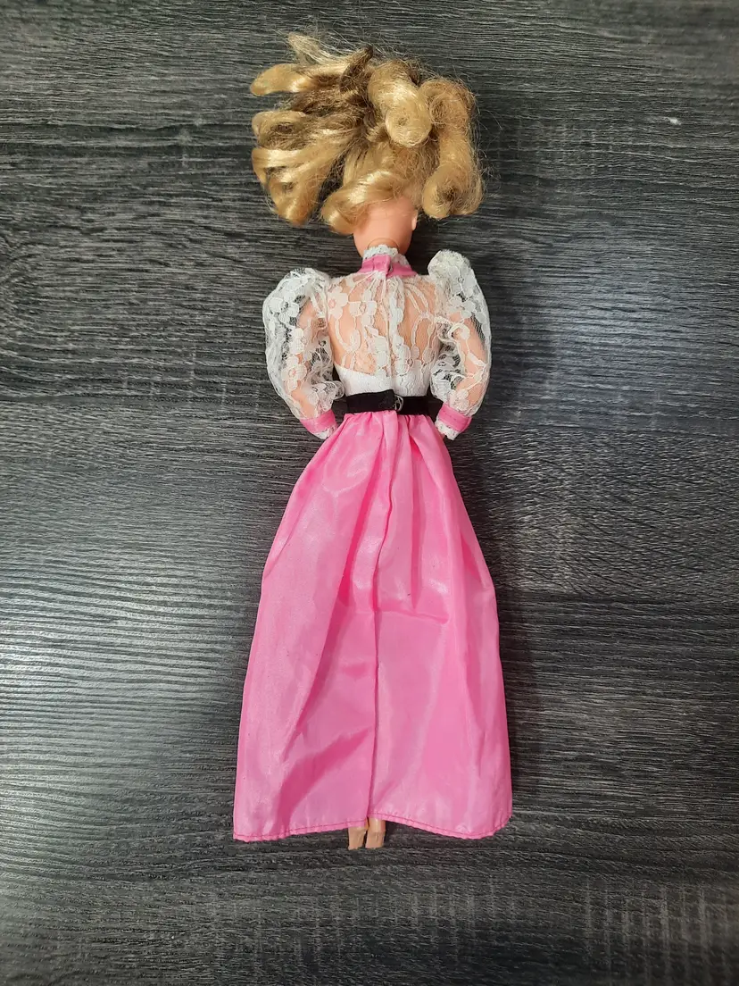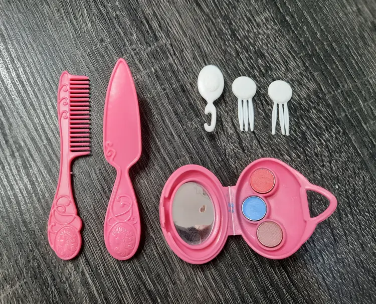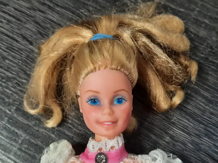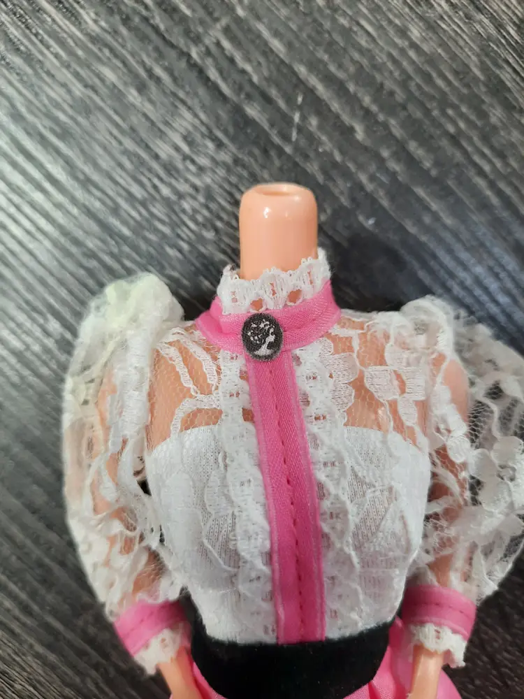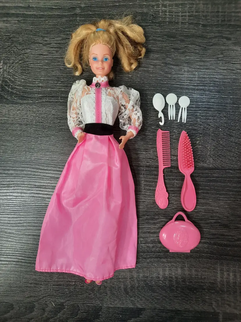 Includes doll, lacey blouse top with cameo and pink skirt, mismatched pink shoes, pink brush, pink comb, 2 white haircombs, small white brush and cameo makeup kit. Ring, headband, makeup applicator and small white comb are missing.