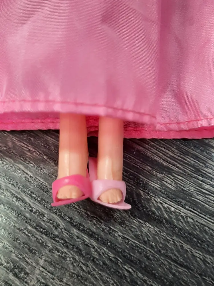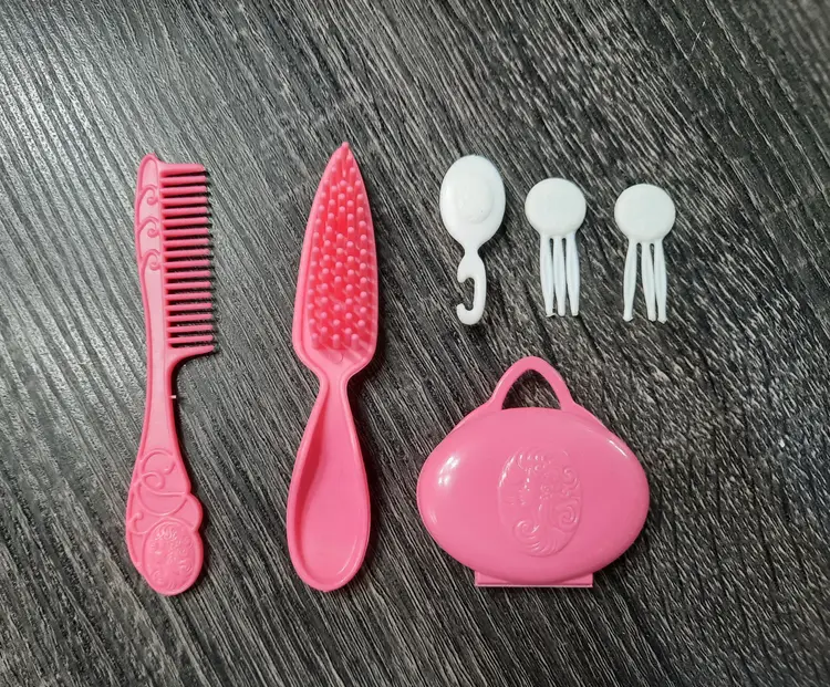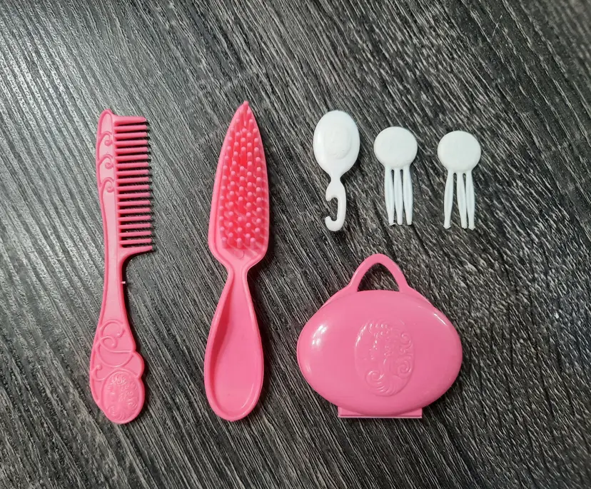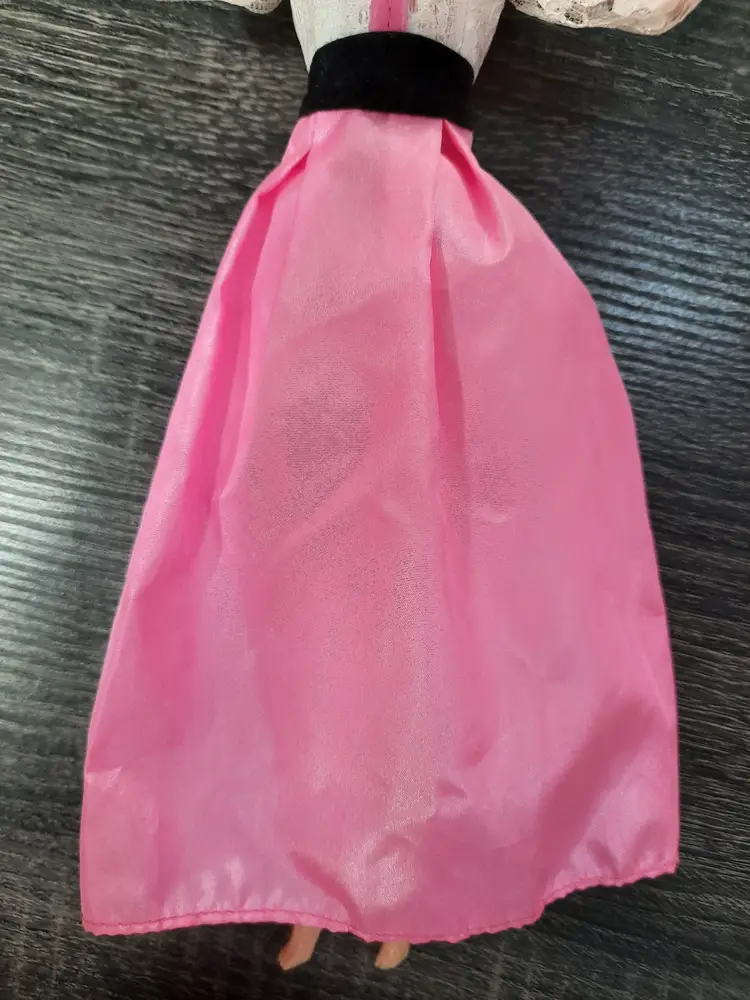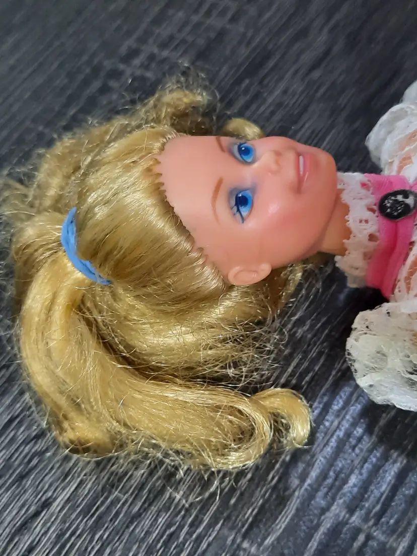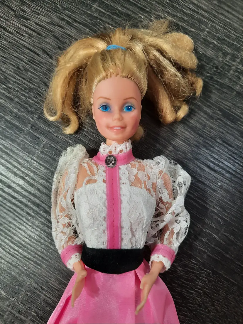 Includes doll, lacey blouse top with cameo and pink skirt, mismatched pink shoes, pink brush, pink comb, 2 white haircombs, small white brush and cameo makeup kit. Ring, headband, makeup applicator and small white comb are missing.