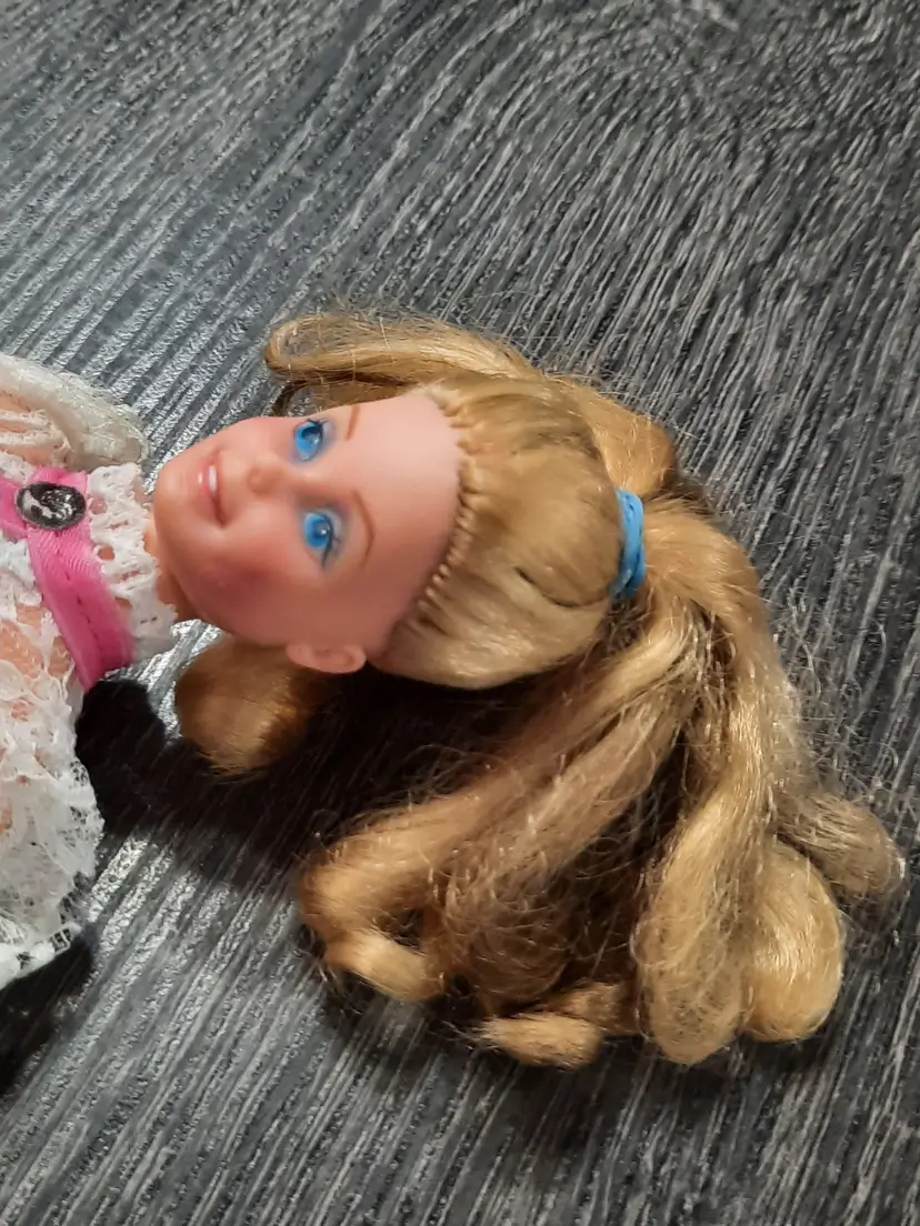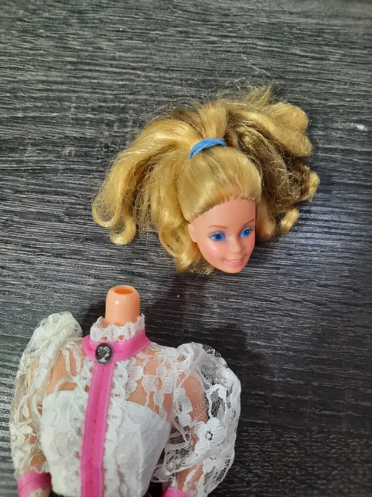 Vintage 1982 Angel Face Barbie #5640, superstar era doll. Near complete set with accessories is in good condition. Doll's head has detached from body and needs repair. Can be wiggled on and stays in place.