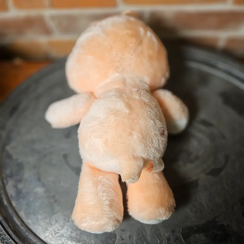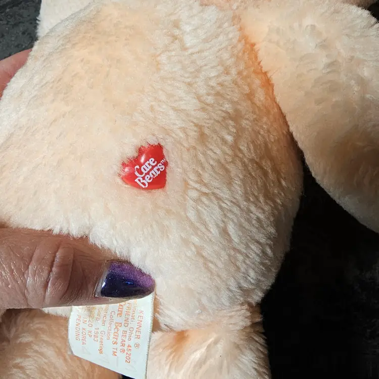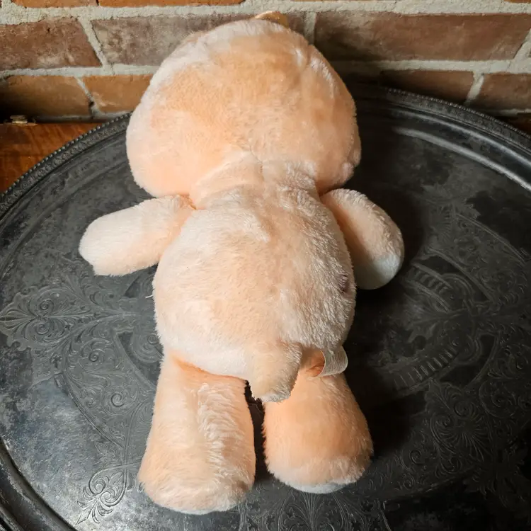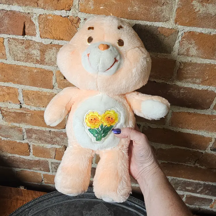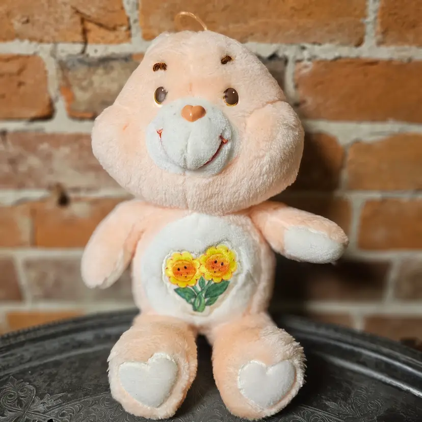 Adorable Friend Bear plush from the original 1983 Care Bears collection by Kenner! This classic peach-colored bear features twin smiling sunflowers on its belly badge and heart-shaped paw pads. Marked ©1983 American Greetings with Kenner tag and red heart tush tag. Measures approx. 13" tall. In good vintage condition with soft fur and minor age-related wear.