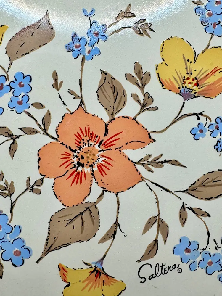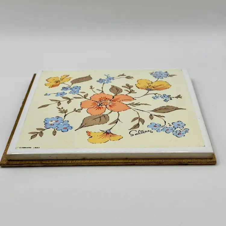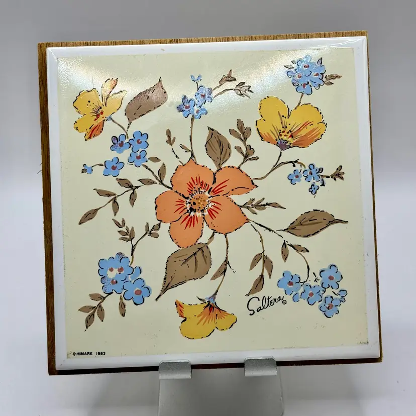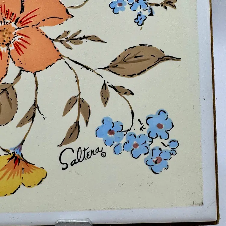 Add a touch of vintage charm to your home with this ceramic tile artwork, signed by Saltera and dated 1983. Featuring a delightful array of colorful flowers, this piece brings a cozy, mcm nostalgic vibe to any space. The wood backing complements the artwork beautifully. In excellent condition with no cracks or chips. Measures 6x6”. Weighs 13oz.