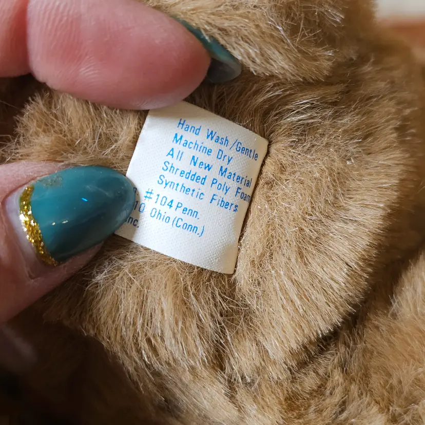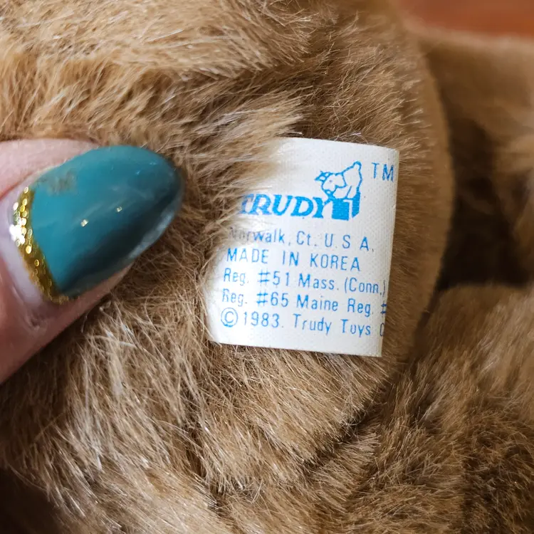 Brand: Trudy Toys Year: 1983 (tag dated) Made in Korea Clothing: FILA logo shirt and red headband (removable) Size: Approx. 12" tall (sitting height may vary) Materials: Synthetic fibers, poly foam stuffing