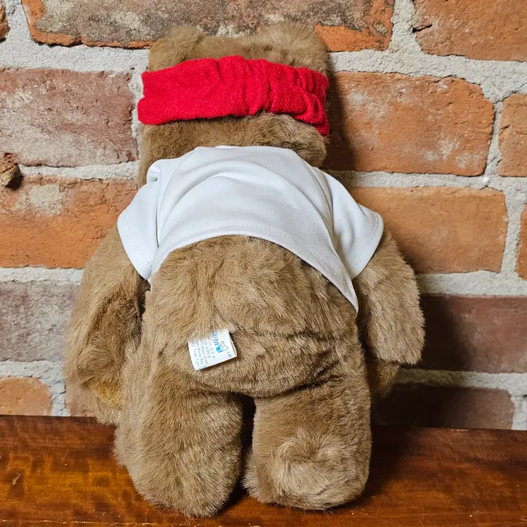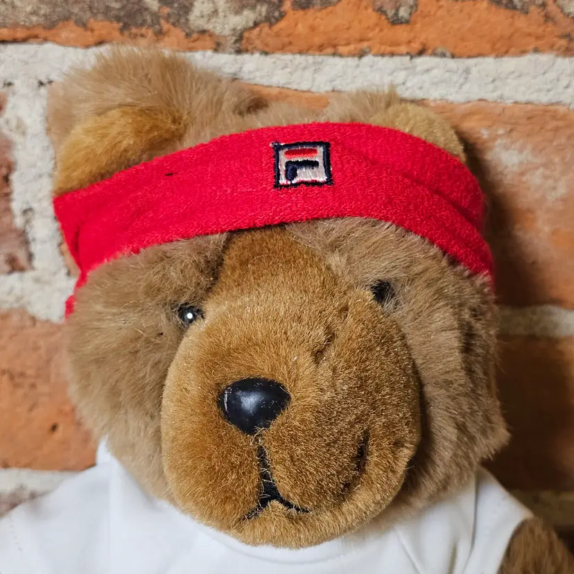 Bring home this unique 1983 Trudy Toys teddy bear, dressed in sporty FILA gear! This plush bear is rocking a white FILA t-shirt and red FILA headband—giving it a cool retro athletic vibe straight out of the ’80s.