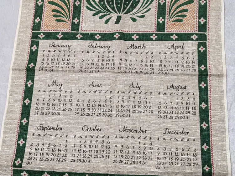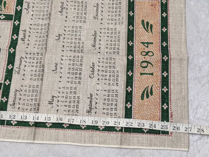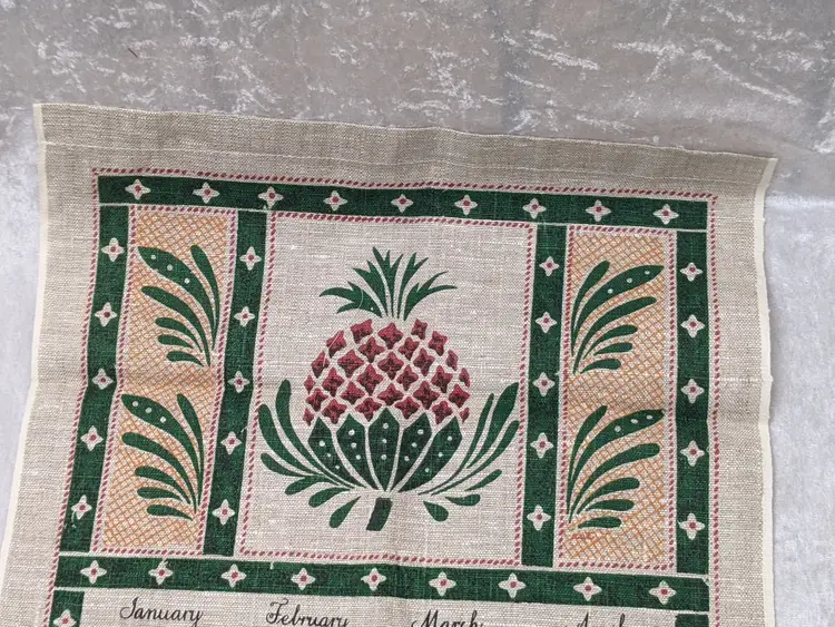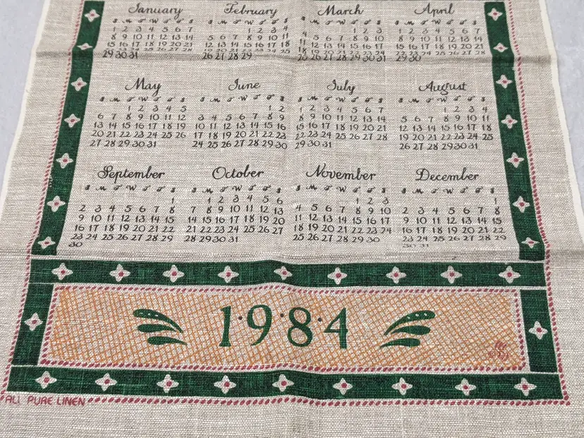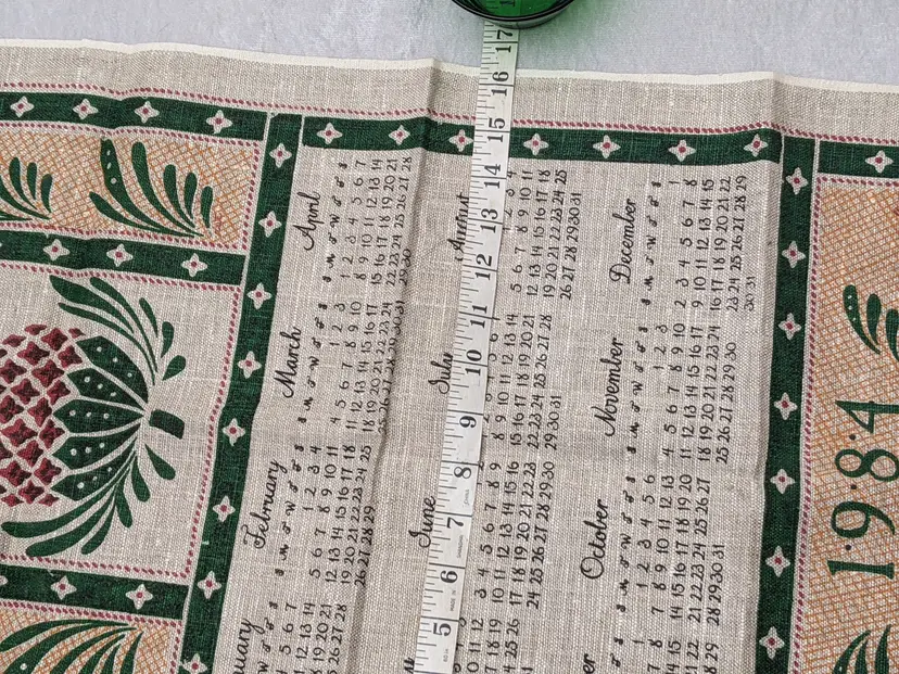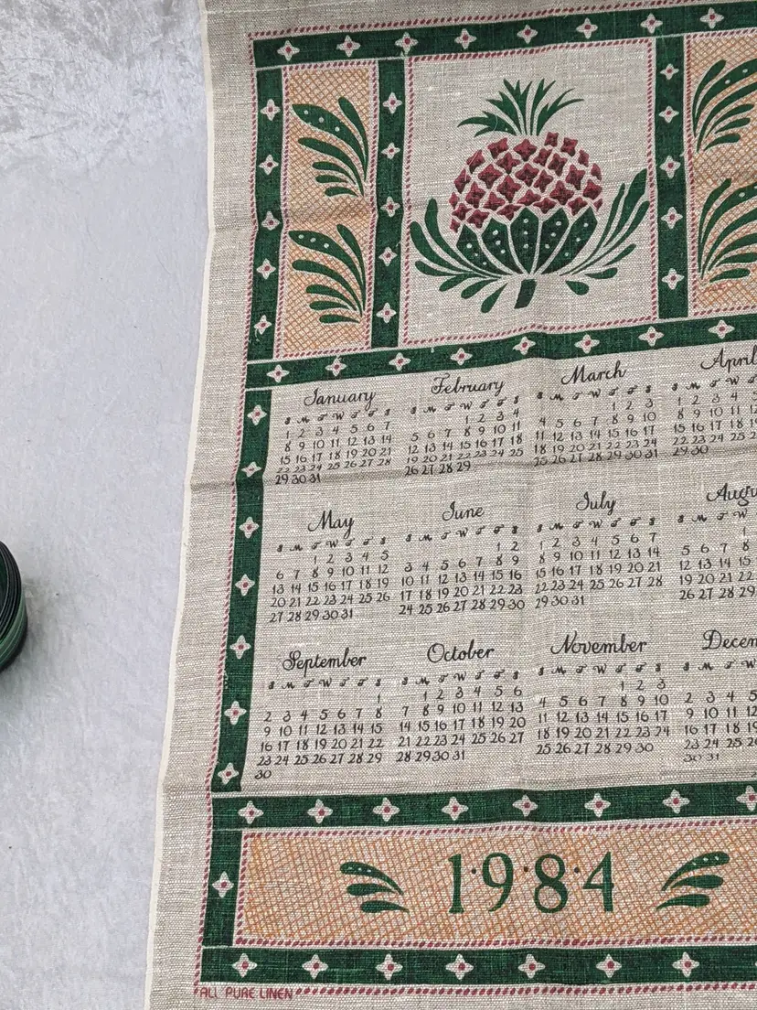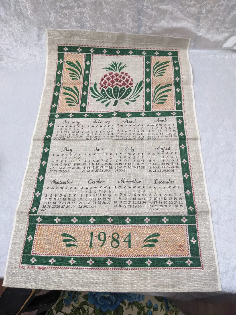 Vintage 1984 Calendar Linen Tea Towel with a Pineapple and folk art design. Perfect for the year you were born for your Birthday Fits in to Cottage Grandma Country or Farmhouse style Unused16in x 27in Unused Slightly stiff linen Great condition Clean with no damage. no weird smells. Please check the photos for details. Comes from a smoke free home. We do have pets. It is kept away from them