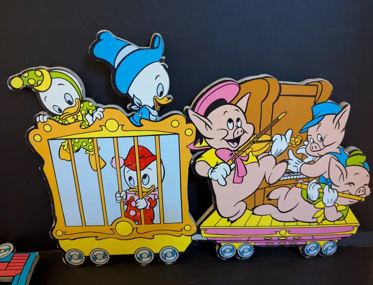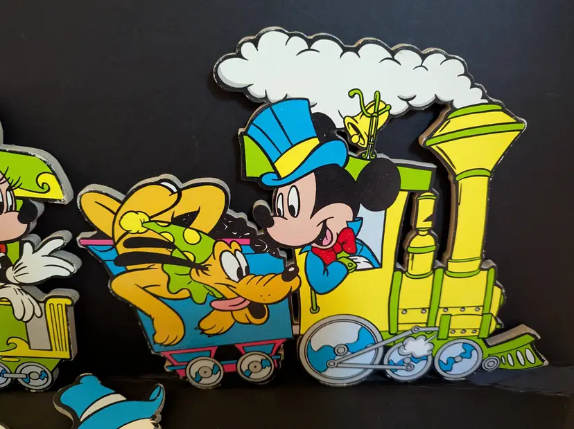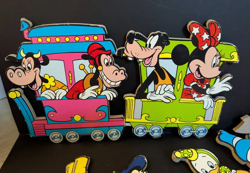 This is a complete set of a Disney Train for your walls- filled with the lovable Disney characters. Card board. Colors bright - not faded. It is dated to 1984. Please see all photos. as they help with description and conditions. Very fun set - something for all True Disney lovers - young and old can appreciate,