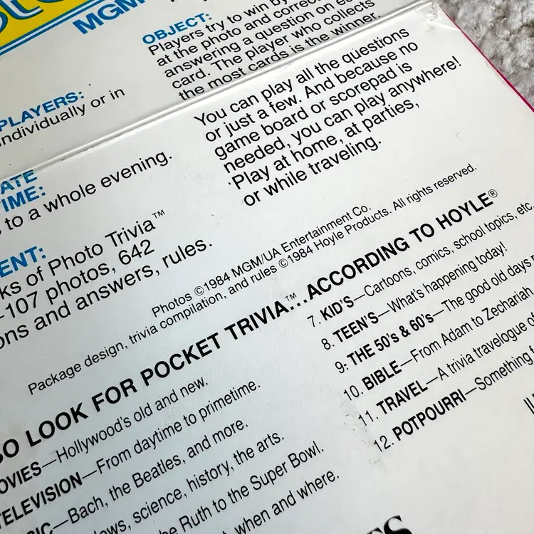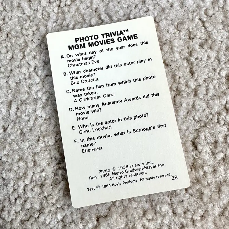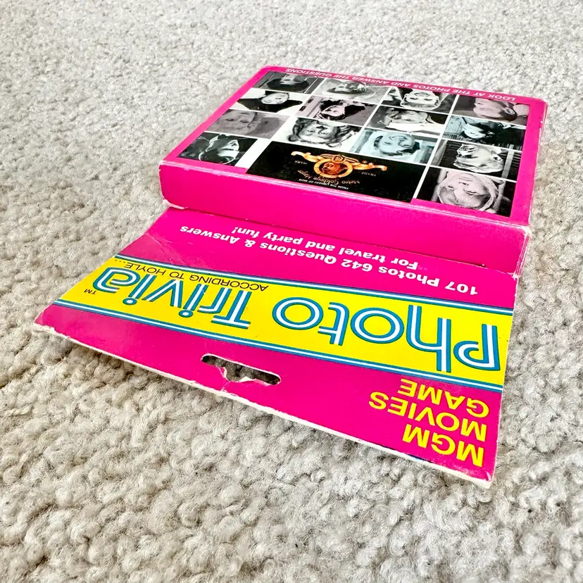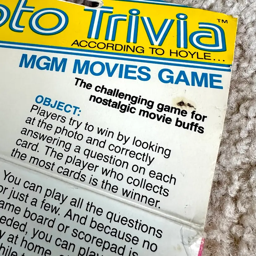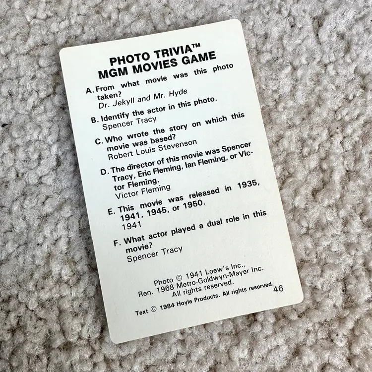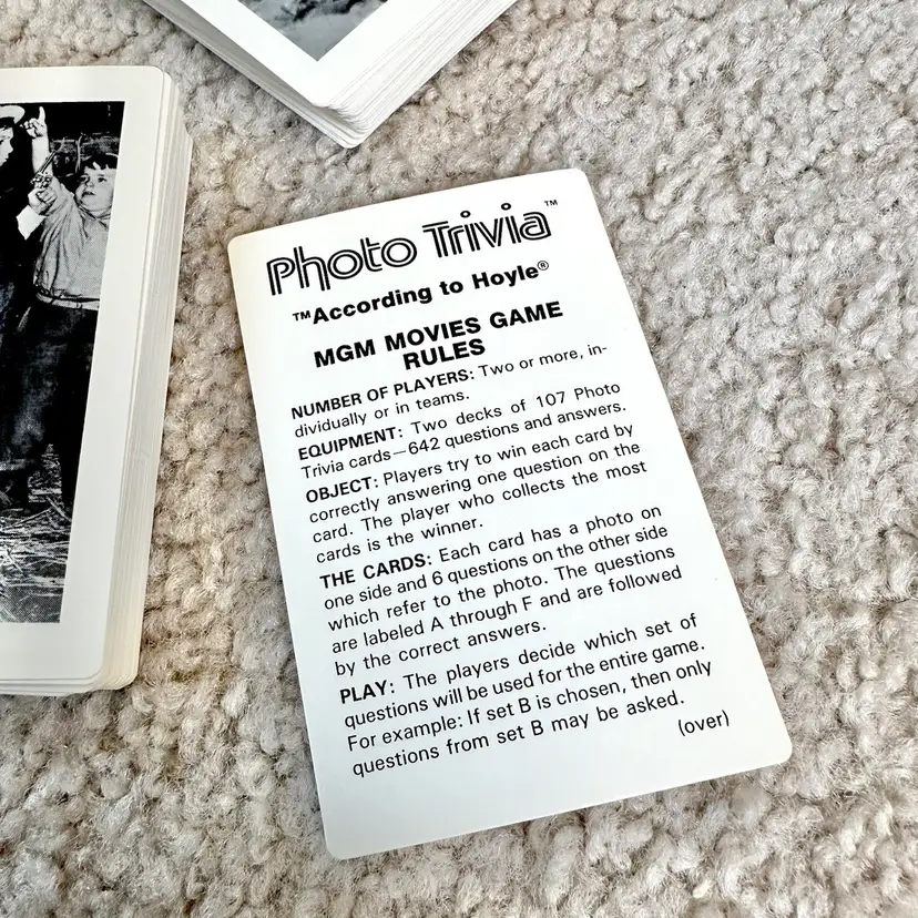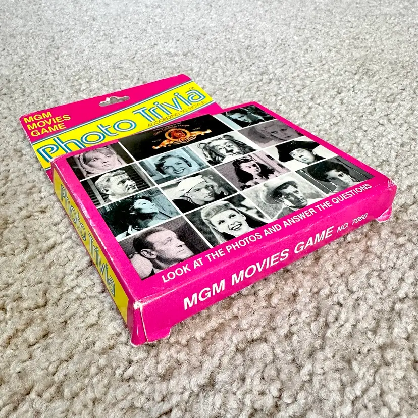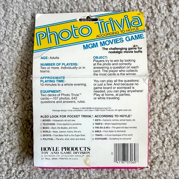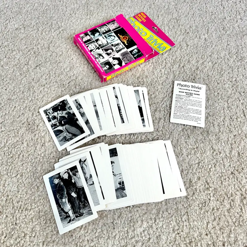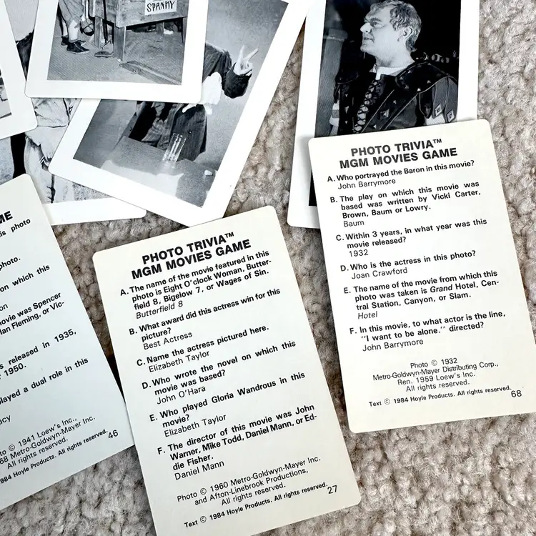 Vintage 1984 MGM Movies Game Photo Trivia Card Game No. 7060 made by Hoyle Products in St. Paul, MN. Game is complete with all original 107 black and white photo cards… each with questions about the actor or movie on the back. Includes cards on WIZARD OF OZ, DR. JEKYLL AND MR. HYDE, A CHRISTMAS CAROL and much more!! Definitely a challenging game for nostalgic movie buffs. 642 questions and answers. Includes rules card too. COMPLETE SET!! Cards all in LIKE NEW CONDITION. Box is complete with some wear from handling as shown. See pics for more details.