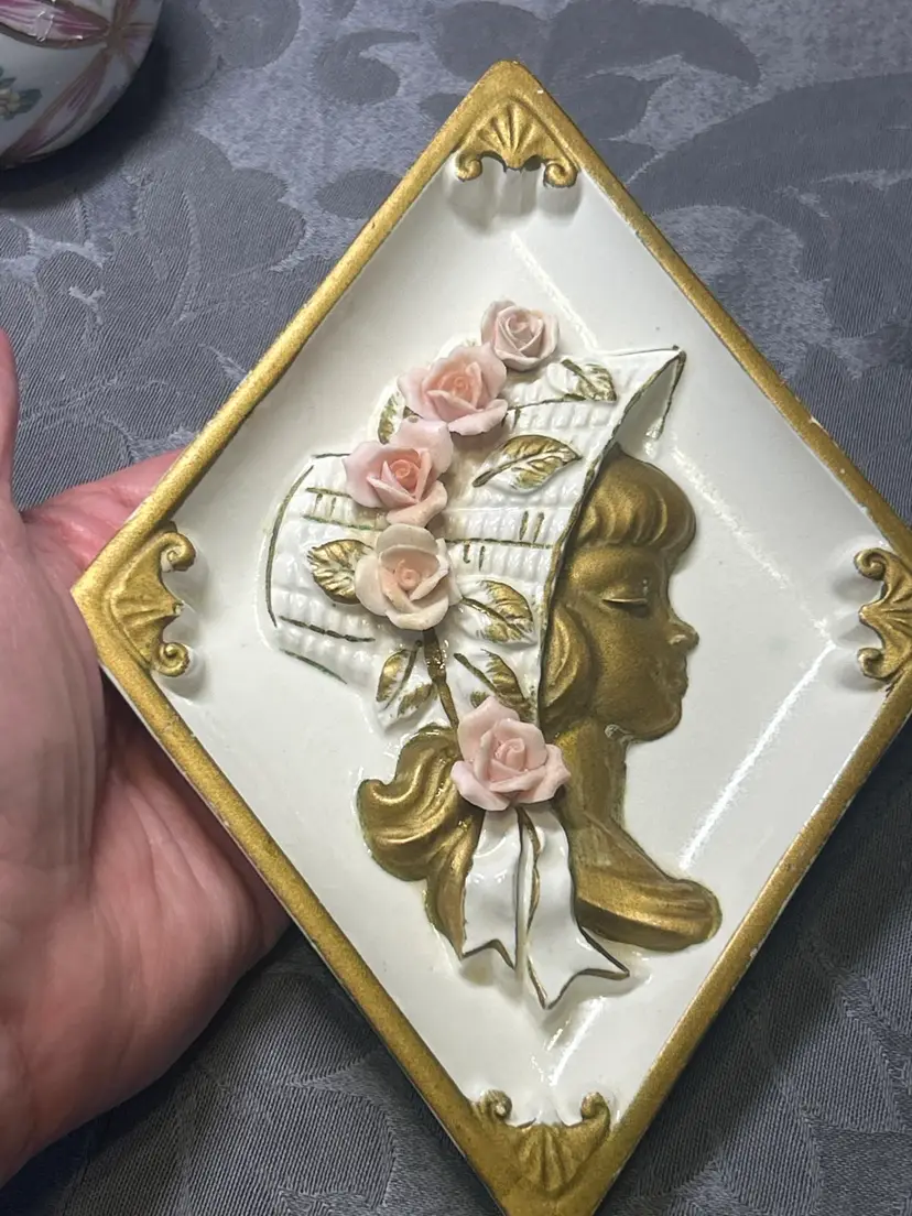 Notable Details • Dated 1984 on reverse • Porcelain wall hanging / decorative plaque • Raised relief lady portrait with bonnet • Applied pink roses with dimensional detail • Gilt accents and corner embellishments • Romantic, vintage decorative style