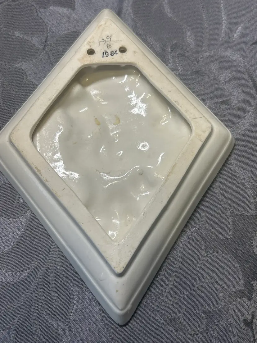 Details • Material: Glazed porcelain / ceramic • Finish: High-gloss glaze with gold accents • Dimensions: Approximately 7 inches x 5 1/2 inches • Mounting: Two holes on back for wall hanging • Condition: Good vintage condition with light surface wear and minor gilt wear consistent with age; no cracks or repairs noted