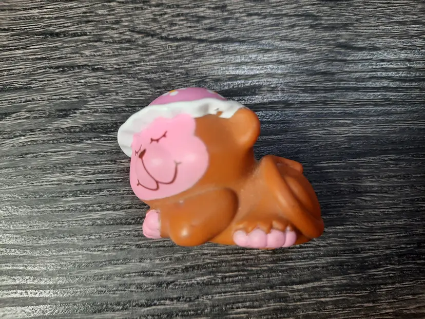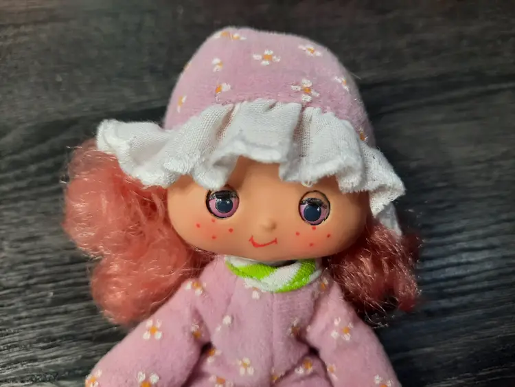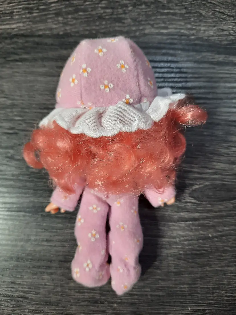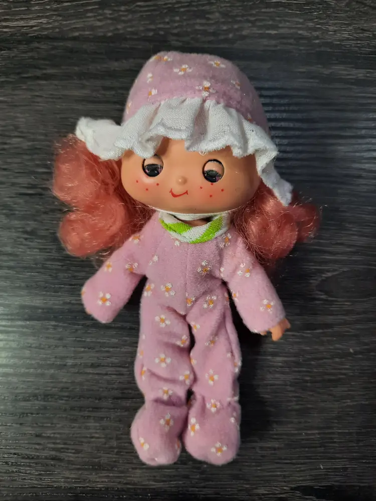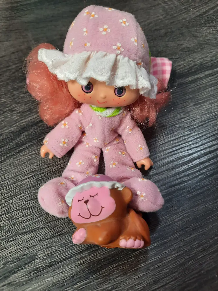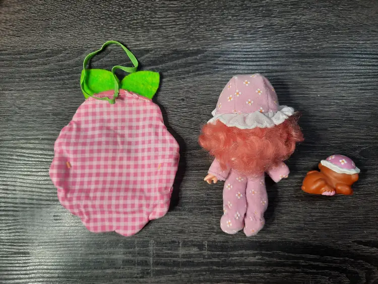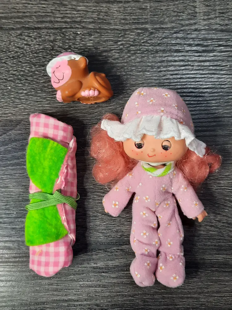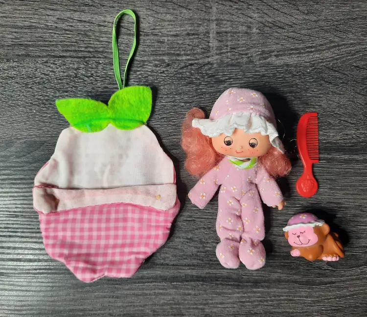 Adorable vintage Sweet Sleeper Raspberry Tart doll set from the Strawberry Shortcake collection. Includes doll, fruit shaped roll up sleeping bag, pet monkey Rhubarb and comb. Raspberry Tart's eyes close when you lie her down. Great set to add to your collection! All original pieces, in very good condition.