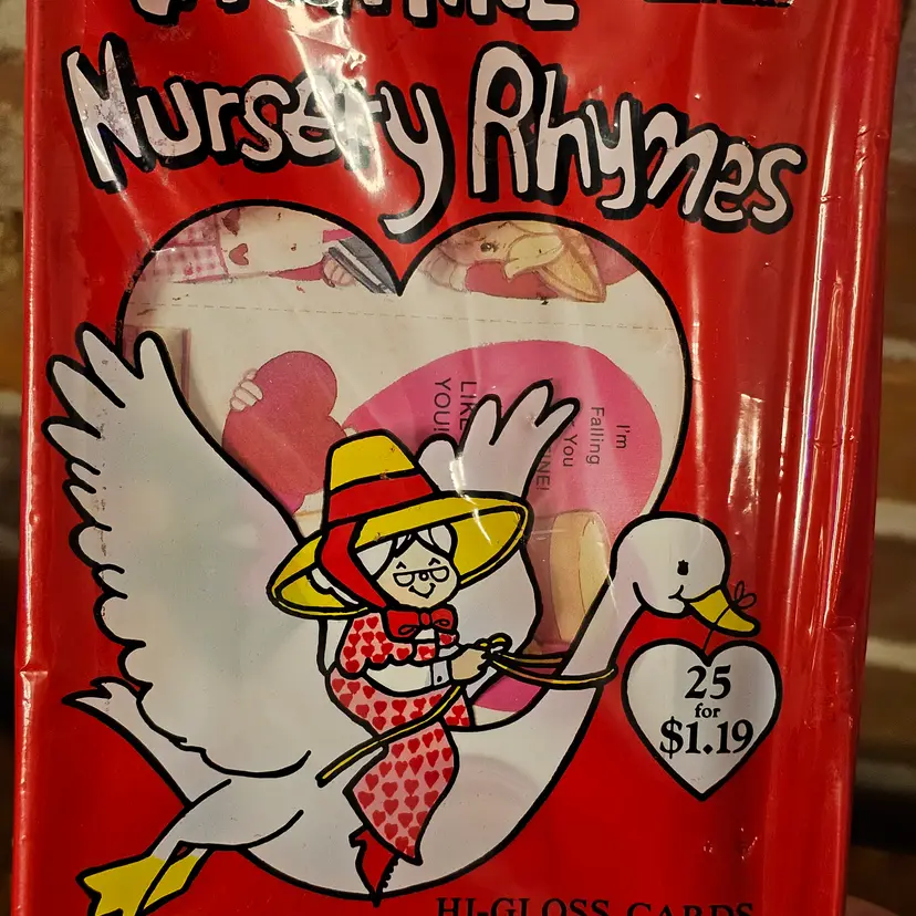 Description: Take a trip down memory lane with this authentic 1980s pack of classroom Valentines! This set features charming Nursery Rhyme illustrations and includes 25 high-gloss cards designed "for boys, girls, and teacher."