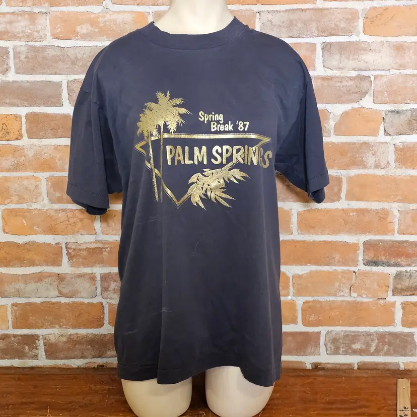 Graphics: Palm trees and "Palm Springs Spring Break '87" in a gold-tone print.