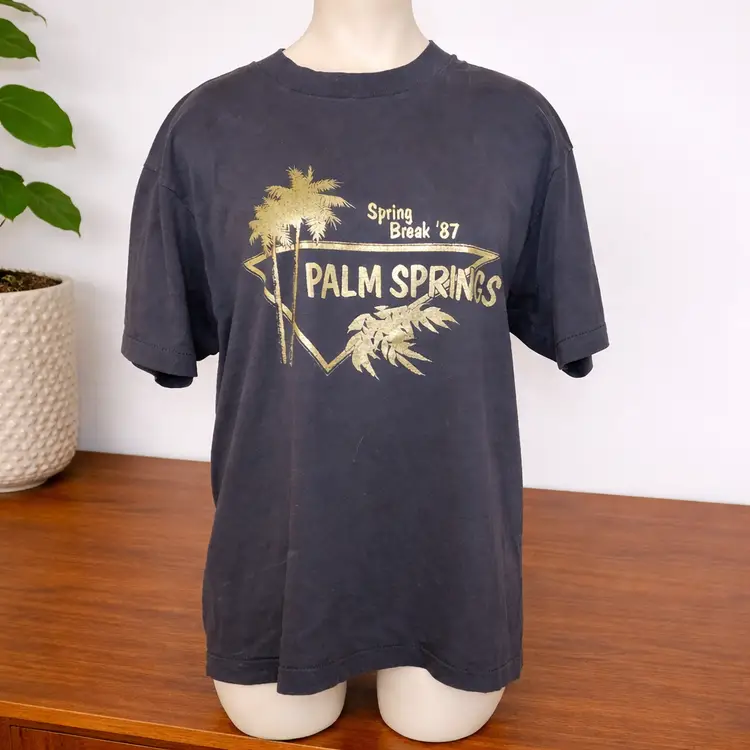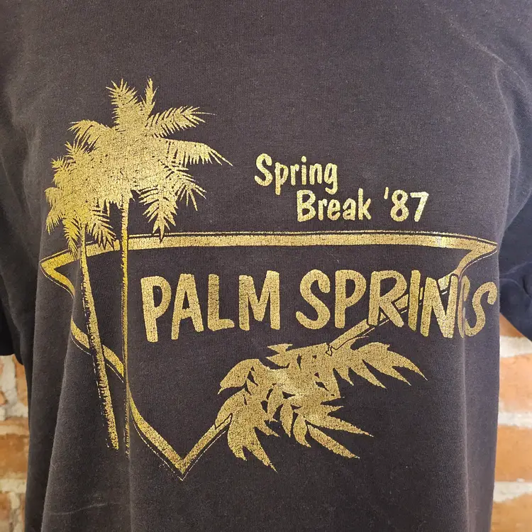 Relive the desert party vibes with this authentic 1987 Palm Springs Spring Break vintage t-shirt. Featuring a classic gold metallic-style graphic against a faded black/dark charcoal base, this shirt is a prime example of 80s resort wear.