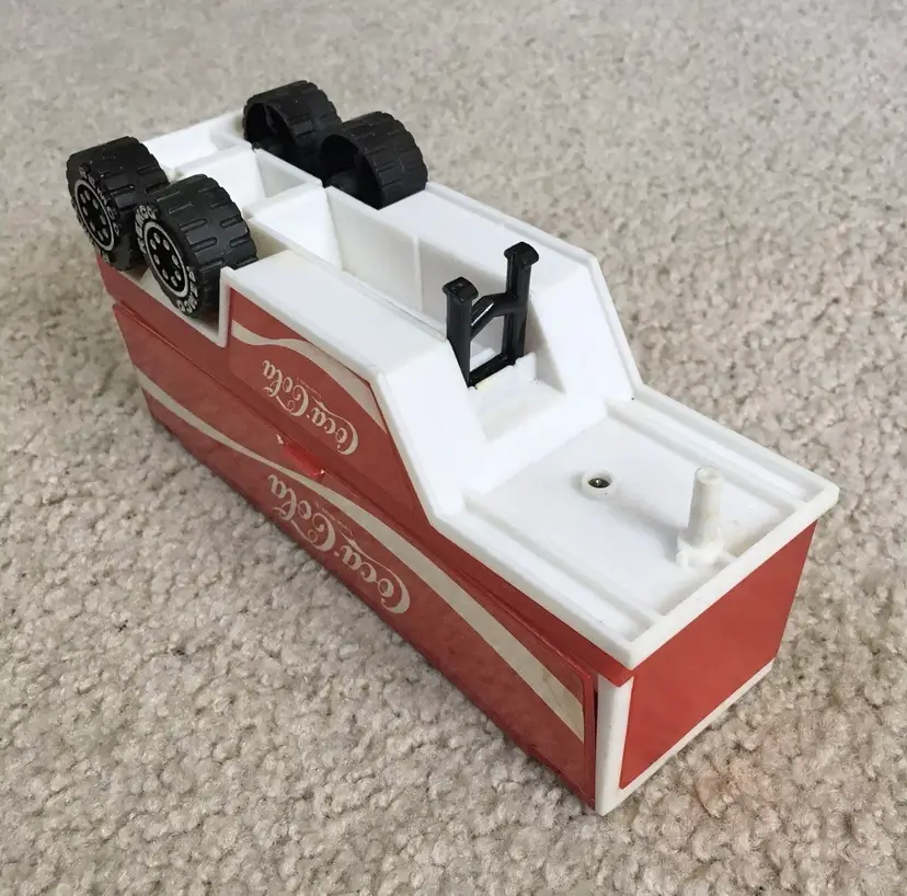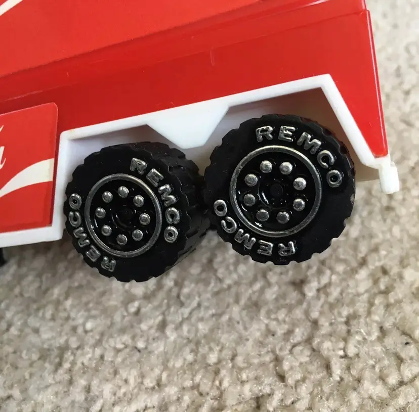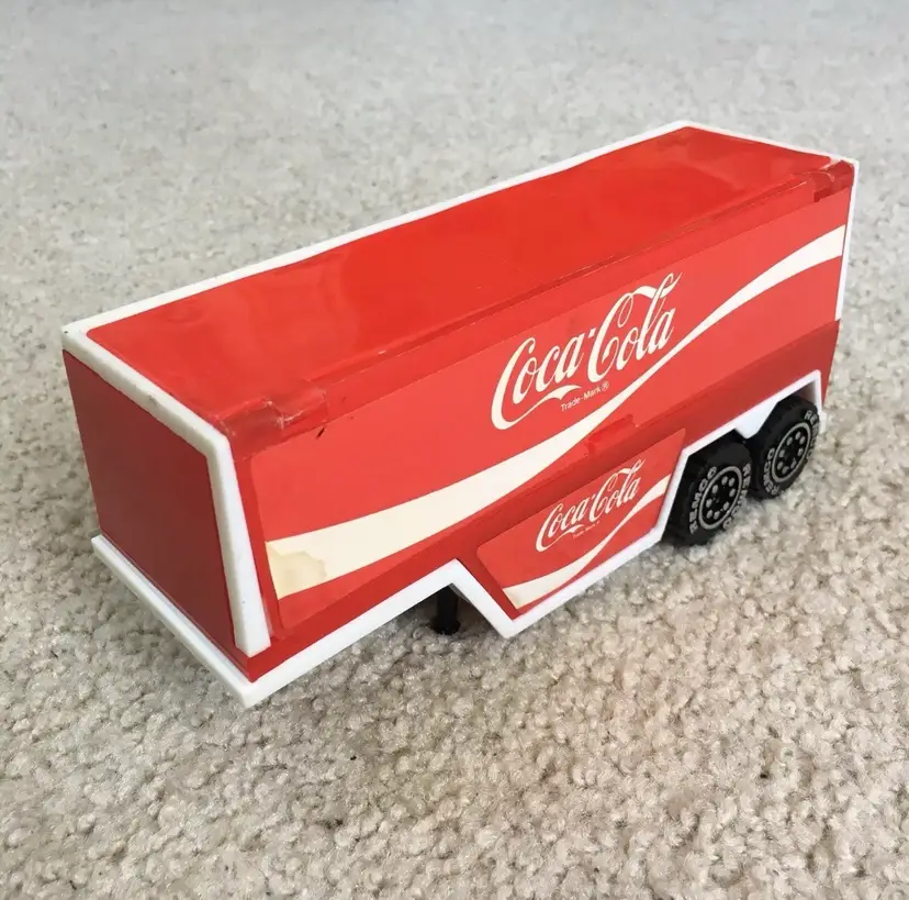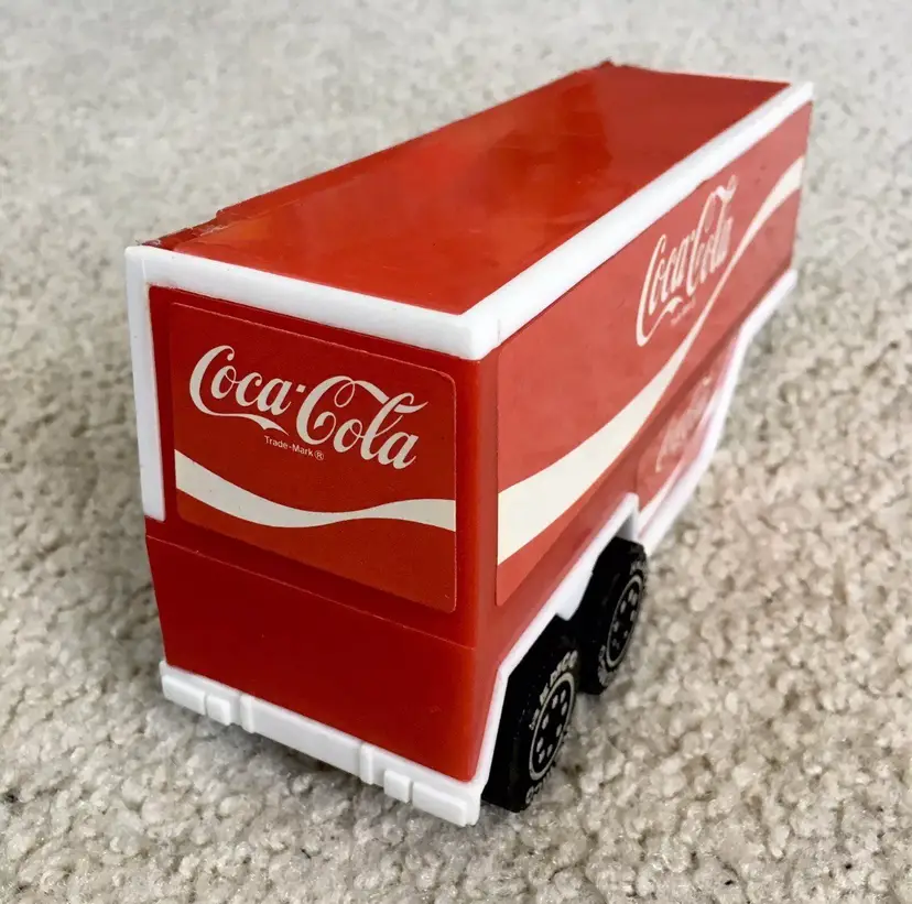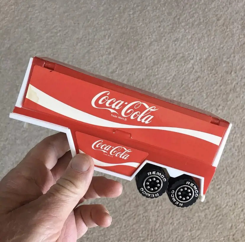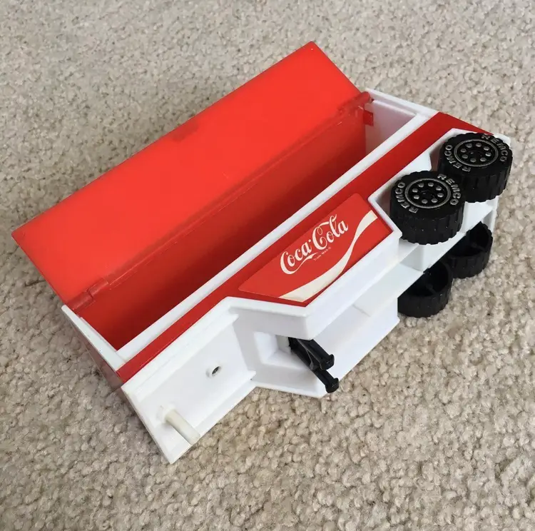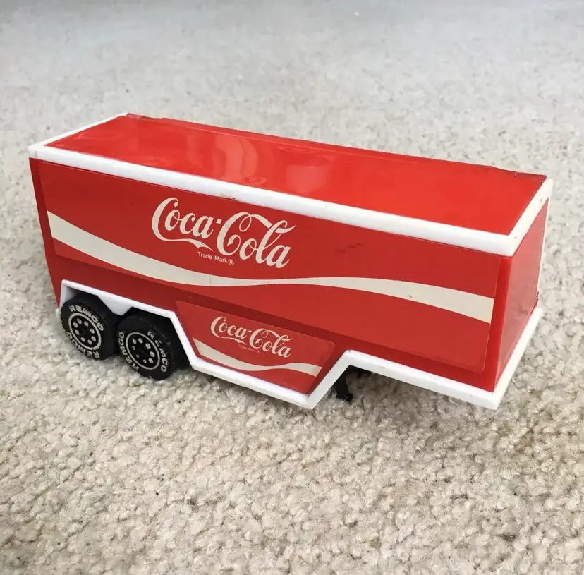 Vintage 1987 COCA-COLA plastic delivery truck trailer made by REMCO TOYS, INC. in New York, NY. ***This listing is for trailer only and does NOT include truck cab or bottle crates. Made in China. Very good condition with some scratches to the plastic from use. Very small crack on top roof. Wheels roll as normal. Large trailer door opens as normal. Decals all intact. Small stain on end of door decal as shown in the pics. Trailer measures about 7 1/8” long. See pics for more details.