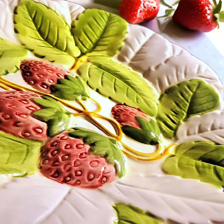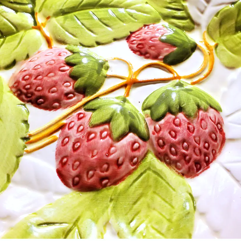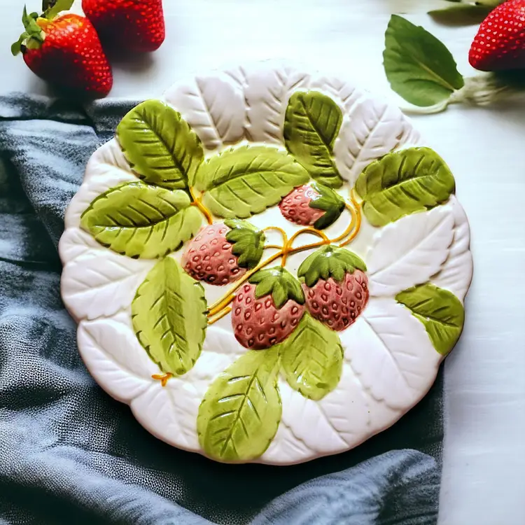Handcrafted decorative salad or dessert plate by Stafford as a part of their Fruit Du Jour collection in 1987. Features raised, handpainted, strawberries with vibrant green leaves hanging on the vine. Zero chips, cracks, or any signs of wear. Diameter measures 8".