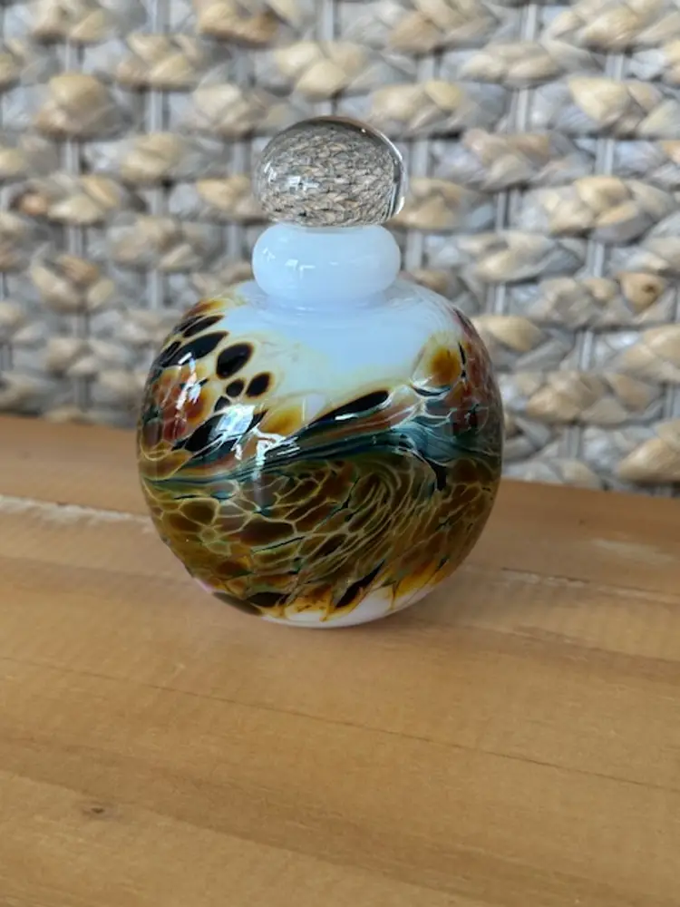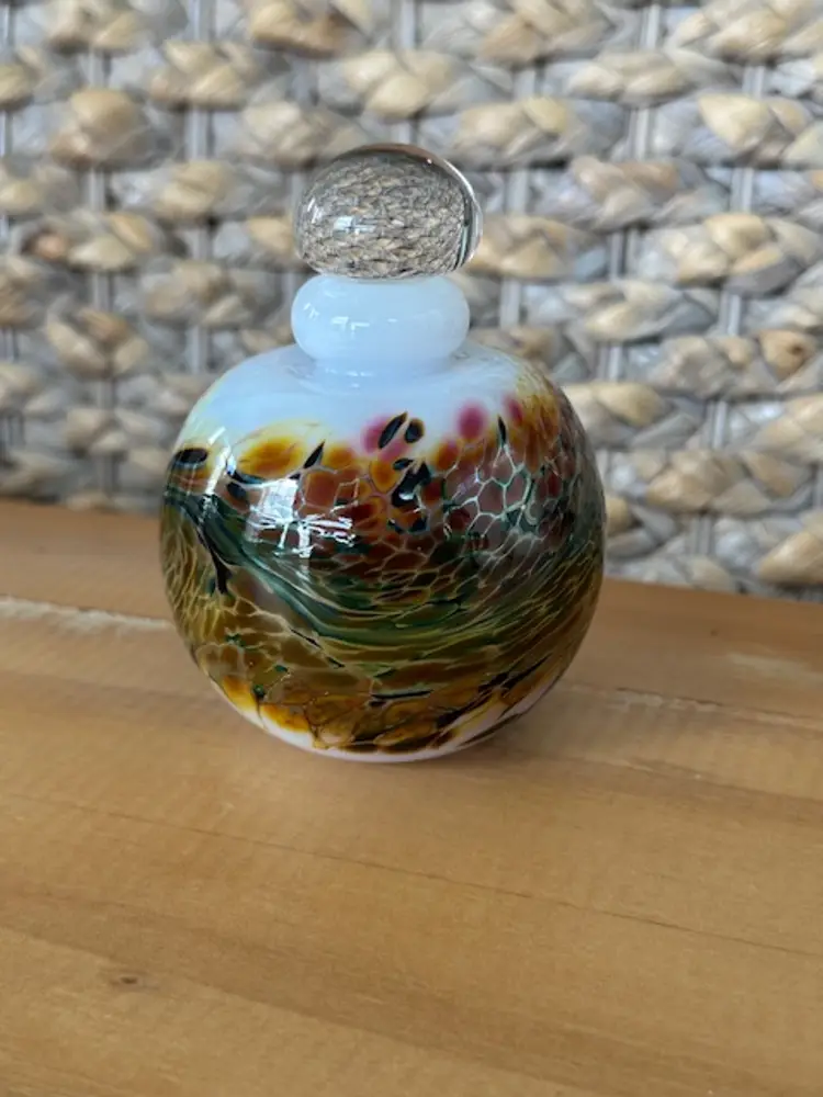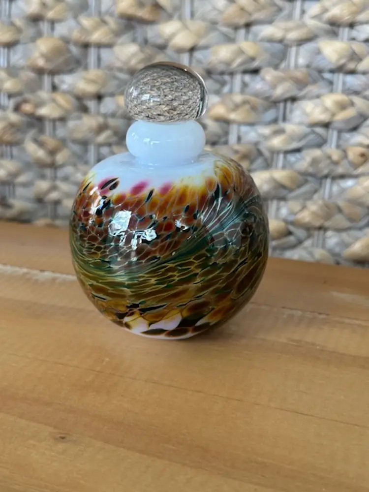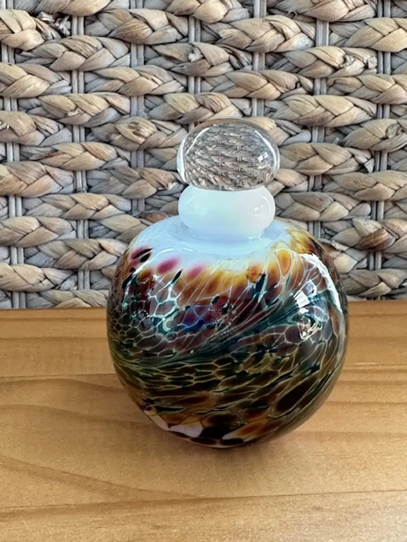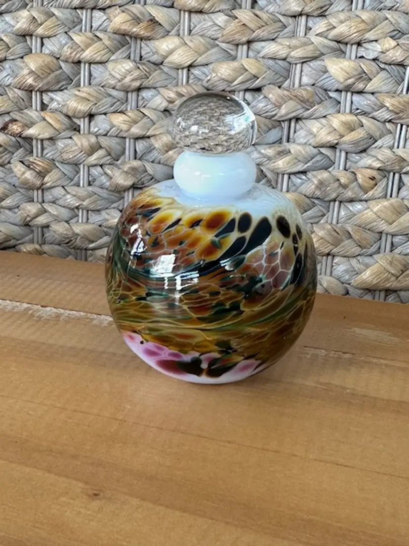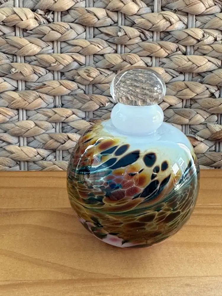 The VTG 1988 MAYTUM Studio Art Glass Perfume Bottle with Stopper is a unique and handmade piece of abstract art. Crafted from multicolor hand-blown glass, this round bottle was created by MAYTUM GLASS STUDIO in the United States in 1988. The signed design makes it an original decorative collectible that adds a touch of artistry to any space. Perfect for displaying as a decorative piece, this vintage piece is a beautiful addition to any collection. Clean with a damp cloth to maintain its beauty for years to come.