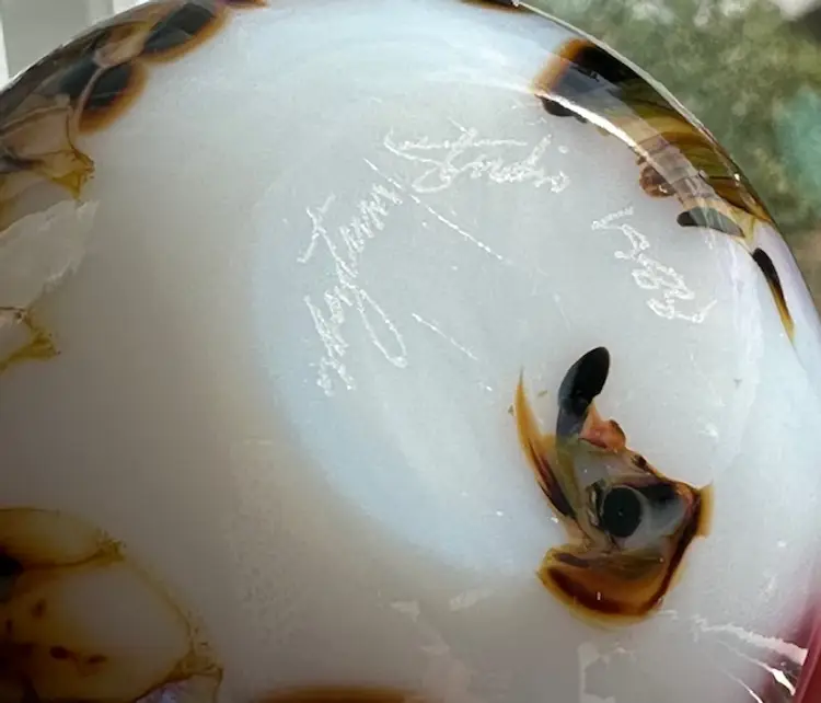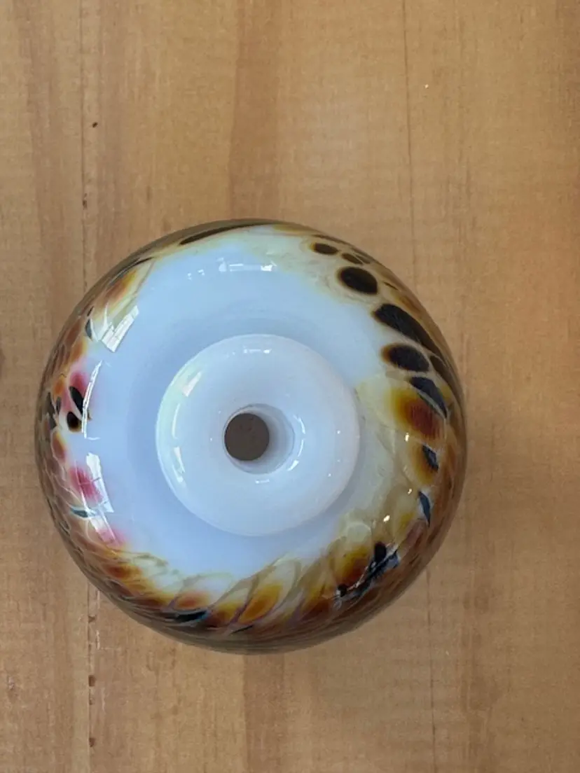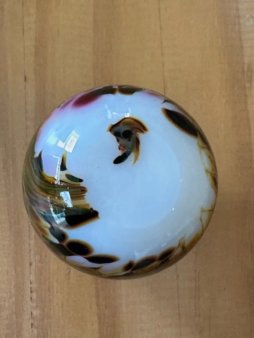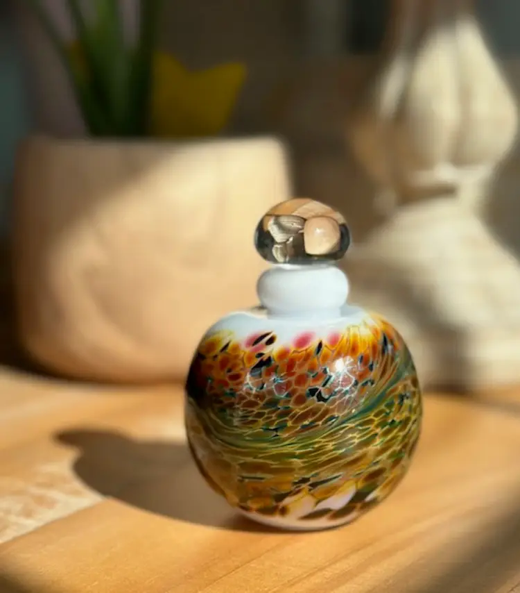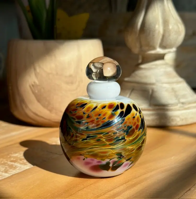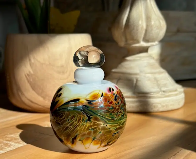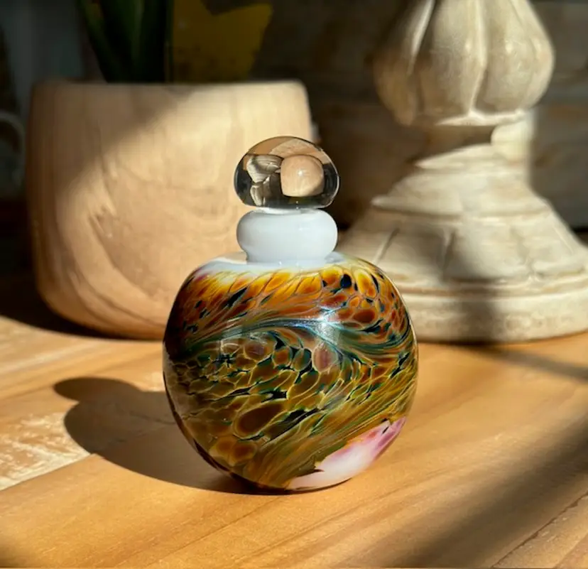 The VTG 1988 MAYTUM Studio Art Glass Perfume Bottle with Stopper is a unique and handmade piece of abstract art. Crafted from multicolor hand-blown glass, this round bottle was created by MAYTUM GLASS STUDIO in the United States in 1988. The signed design makes it an original decorative collectible that adds a touch of artistry to any space. Perfect for displaying as a decorative piece, this vintage piece is a beautiful addition to any collection. Clean with a damp cloth to maintain its beauty for years to come.