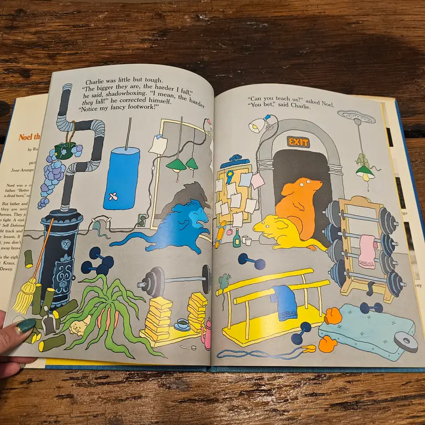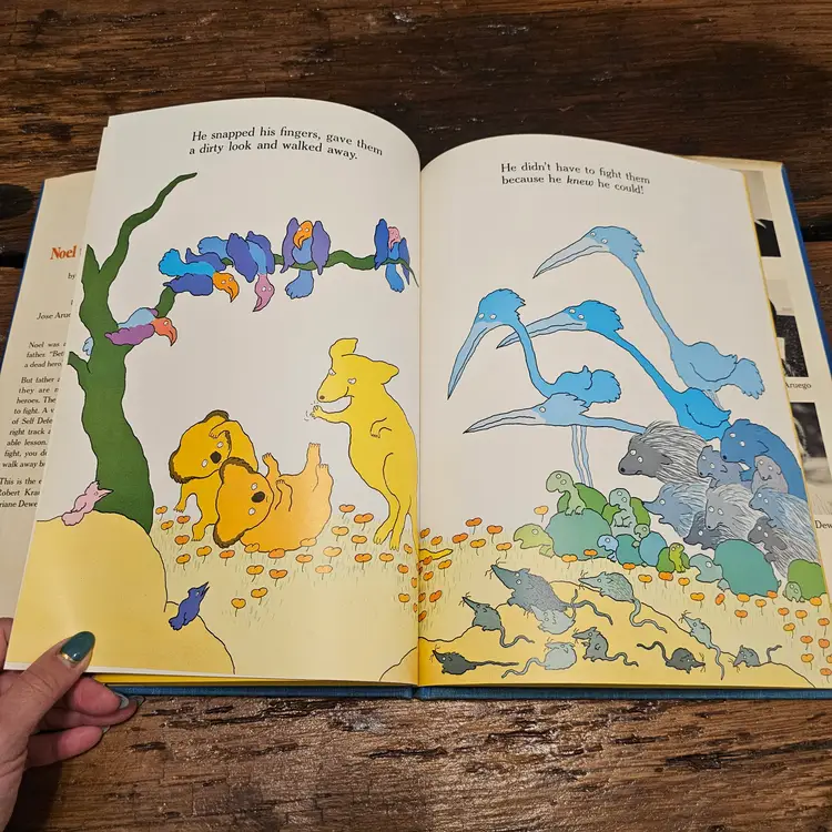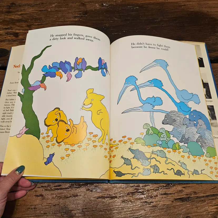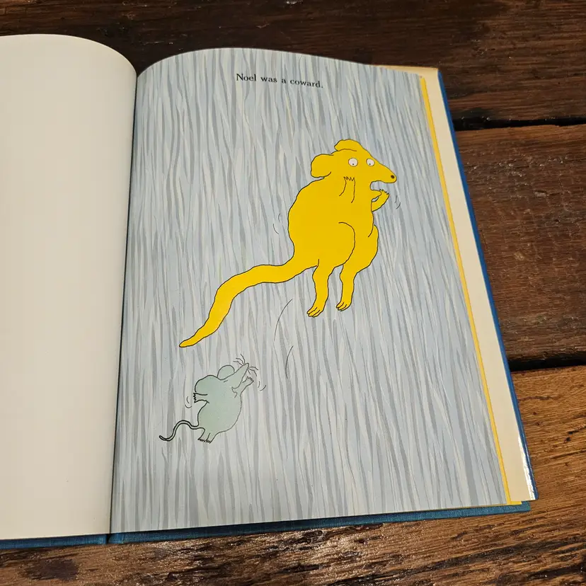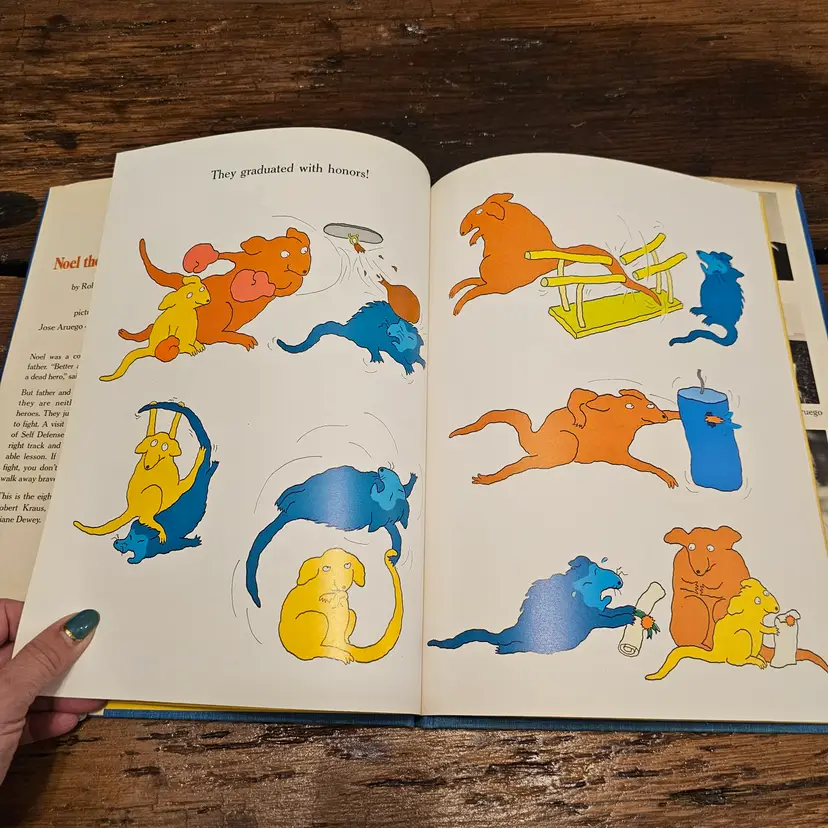 This is a vintage hardcover copy of the classic children's book, "Noel the Coward," written by Robert Kraus and illustrated by Jose Aruego and Ariane Dewey. Published in 1988 by Simon and Schuster Books for Young Readers, this charming story follows the adventures of a little coward who finds the courage to become a hero with the help of Charlie's School of Self-Defense.