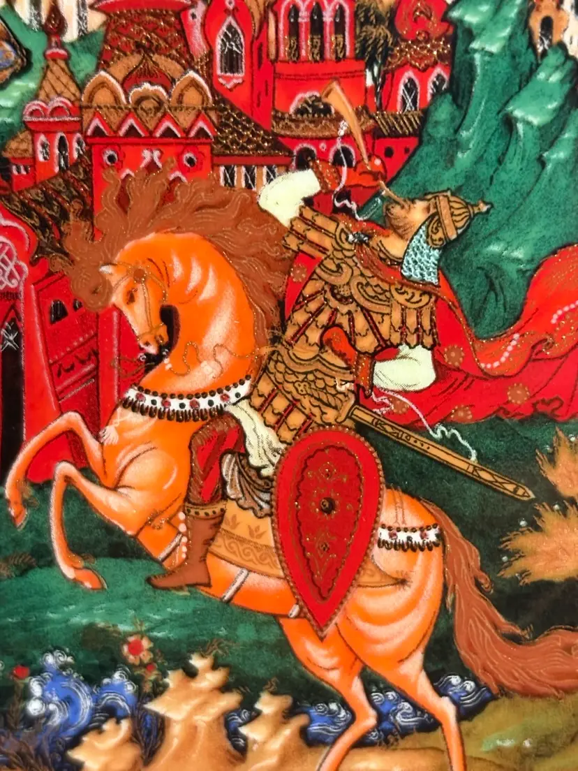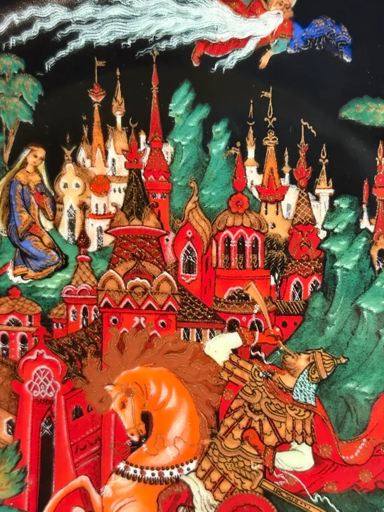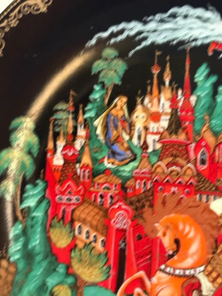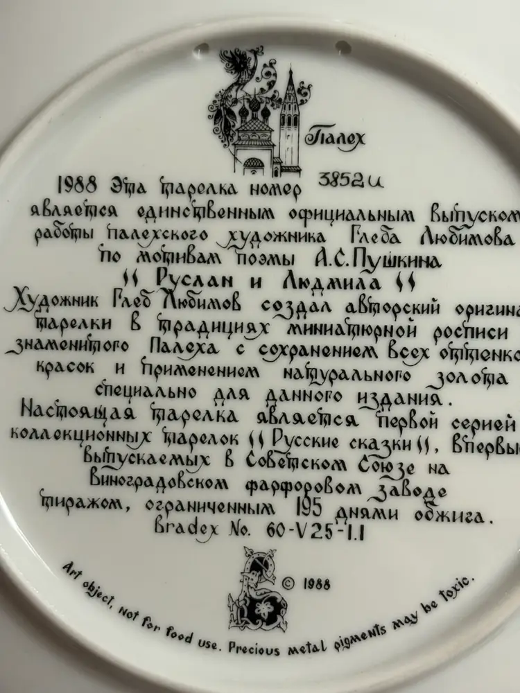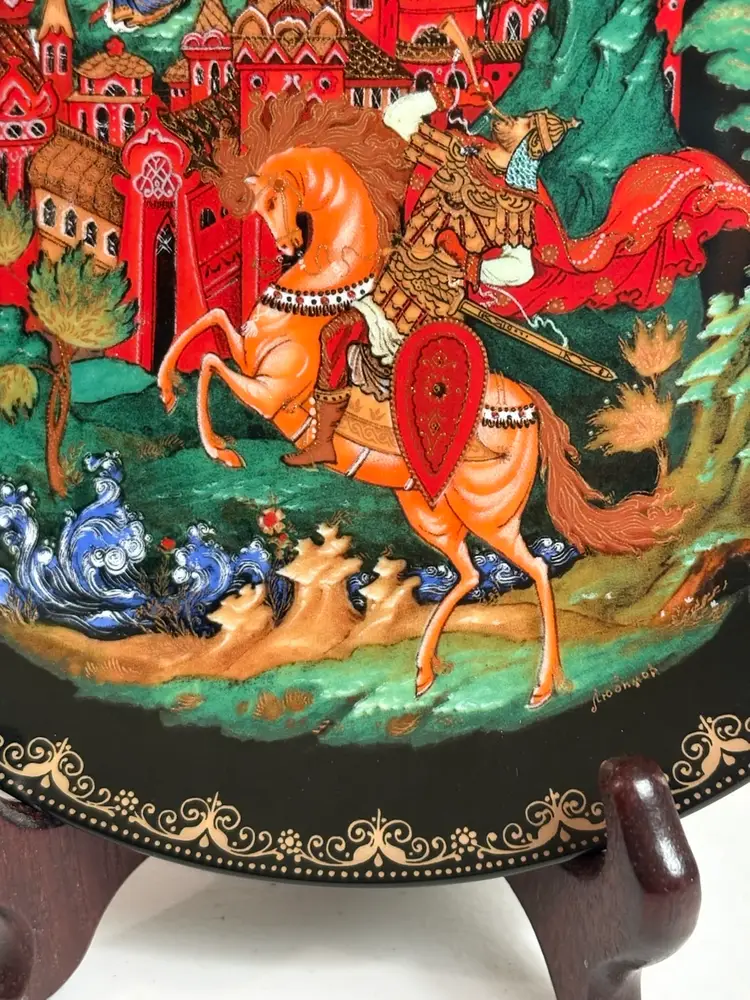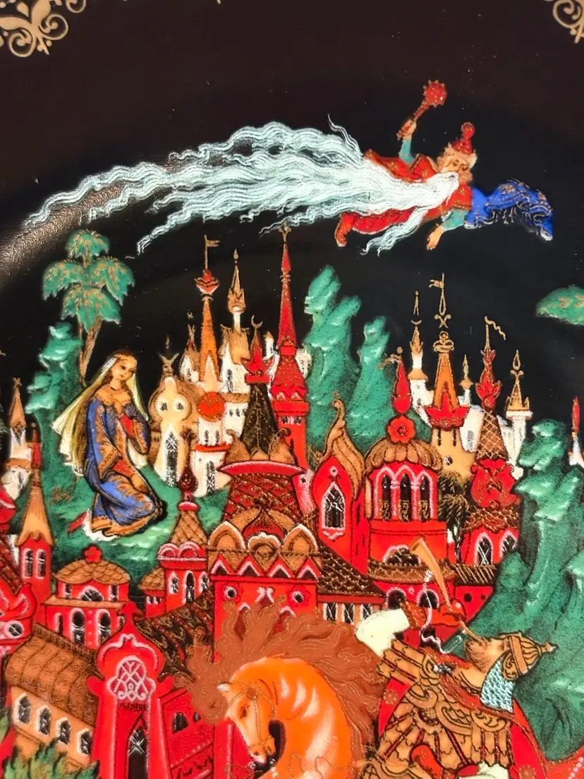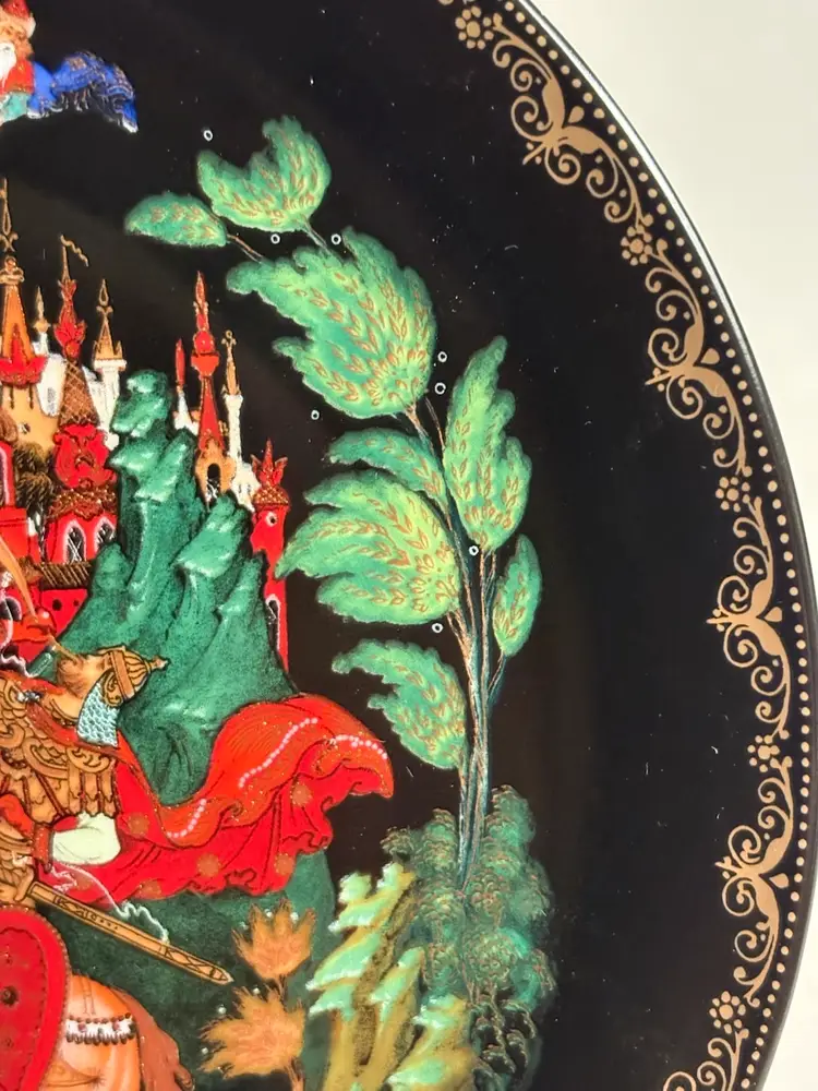 The Vintage 1988 Russian Plate featuring Palekh Ruslan and Ludmila is a collectible decorative piece made of high-quality porcelain. This unique plate showcases intricate multicolor designs that capture the essence of Russian culture from the 1980s. With its historical significance as the first plate in production, this item is a valuable addition to any collector's display, offering a glimpse into the artistry and craftsmanship of that era.