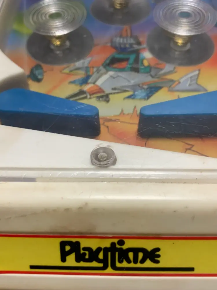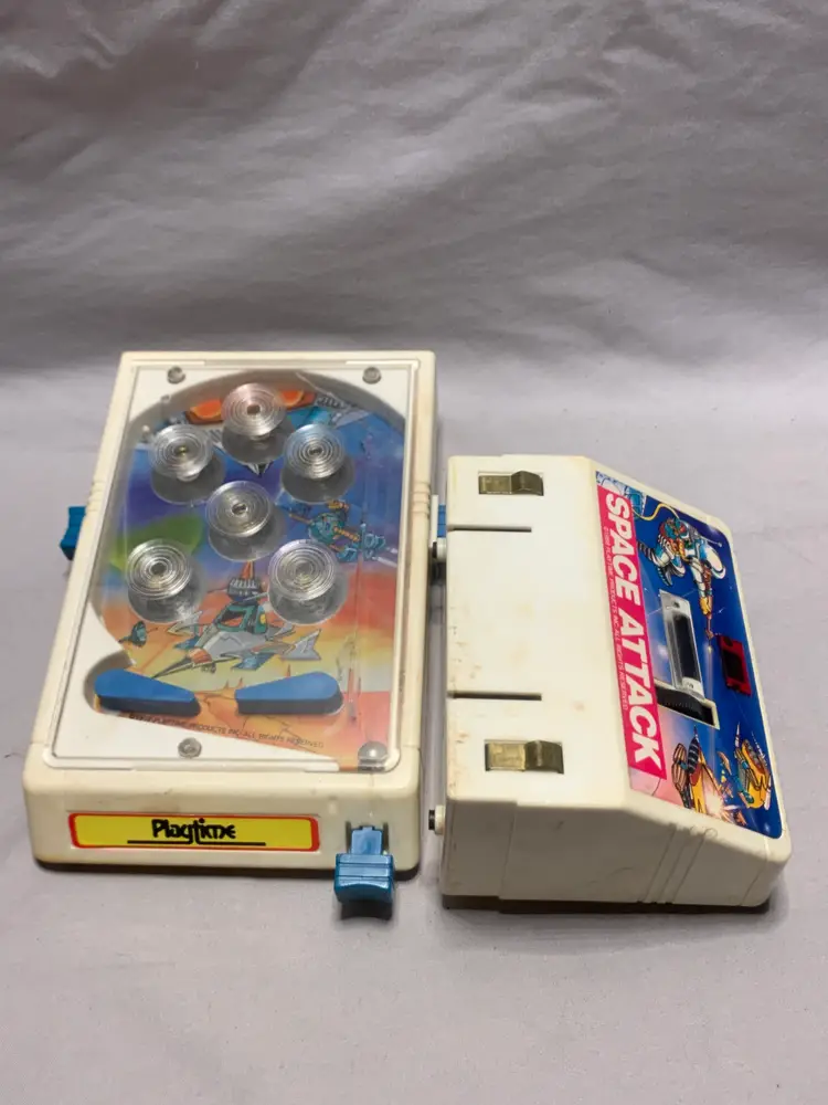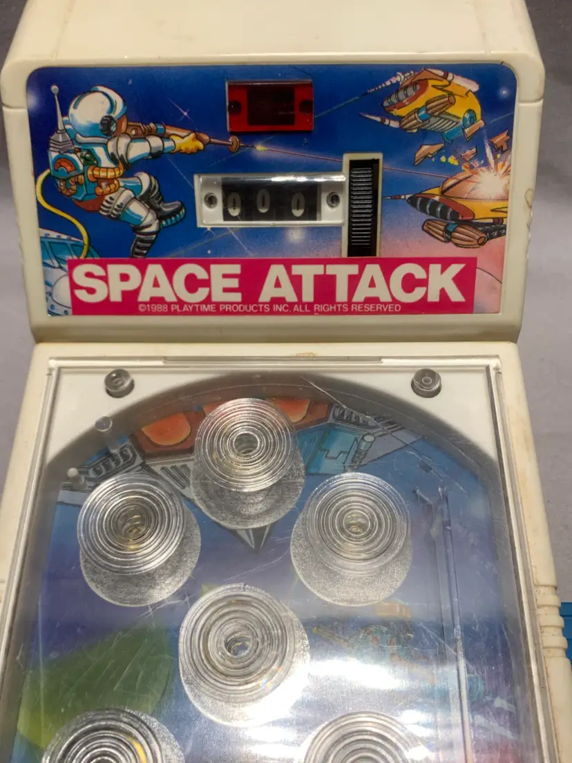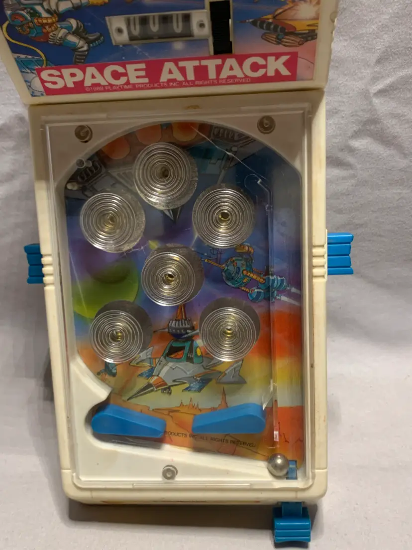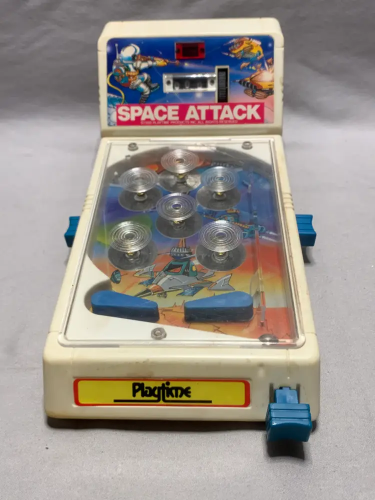This Vintage 1988 Space Attack Pinball Game by Playtime Products is a collectible piece that captures the nostalgia of classic arcade games. Measuring 4.5" x 10", this plastic pinball game makes a unique addition to any pinball or arcade memorabilia collection. With its authentic design and brand, this pinball game offers a glimpse into the past and provides hours of entertainment for both collectors and enthusiasts of retro gaming. It works but will not light up.