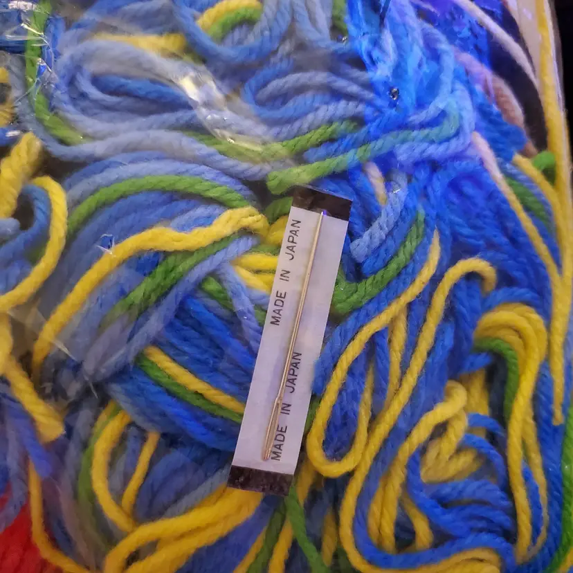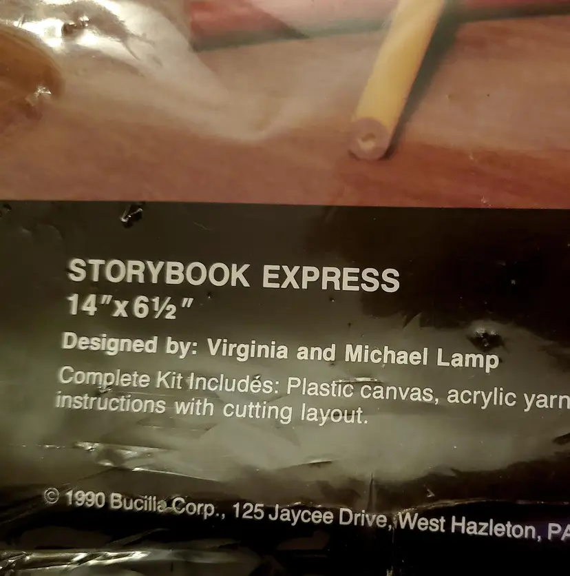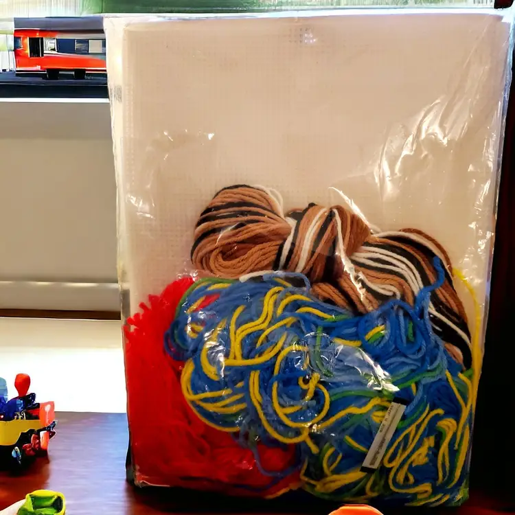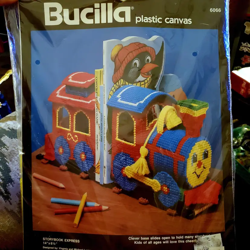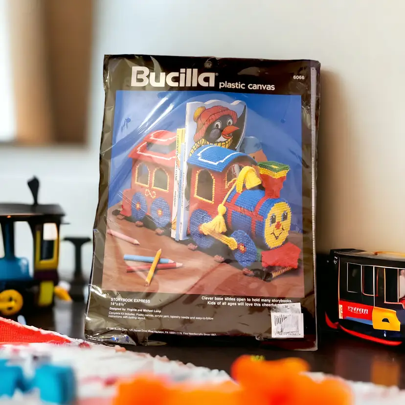 New in bag needlecraft kit that includes: plastic canvas, acrylic yarn, tapestry needle, and easy to follow instructions with cutting layout. Made by Bucilla and designed by Virginia and Michael Lamp in 1990. Finished product measures 14" x 6.5".
